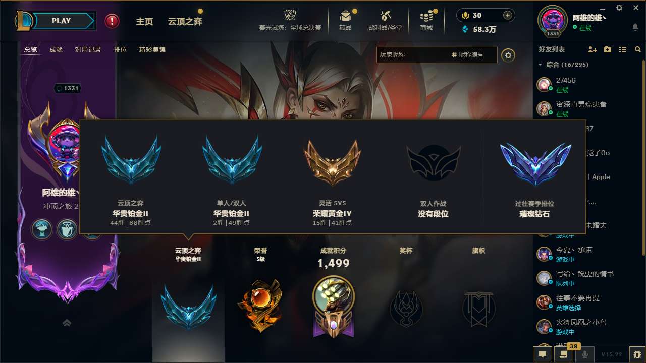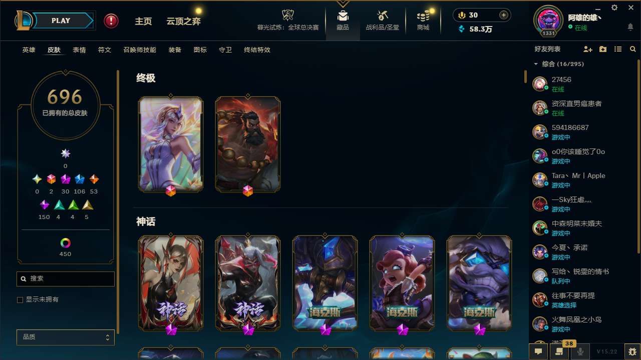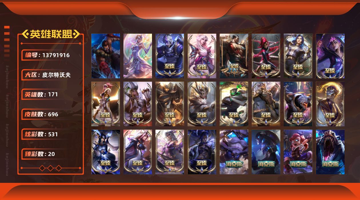 【53453】[13791916]t30492【皮尔特沃夫】696皮肤 531炫彩 20臻彩 30神话/106限定/53传说/171英雄 账号等级:1331 云顶神话:3 单双排段位:铂金【重要头像】大家伙 【重要皮肤】机神玄武盖伦至臻 灵魂莲华劫至臻 灵魂莲华拉克丝至臻 凯旋将军德莱厄斯至臻 黑色玫瑰假面舞会卡特琳娜至臻 双城之战2指挥官凯特琳至臻 暗星女王黛安娜至臻 墨之影武
