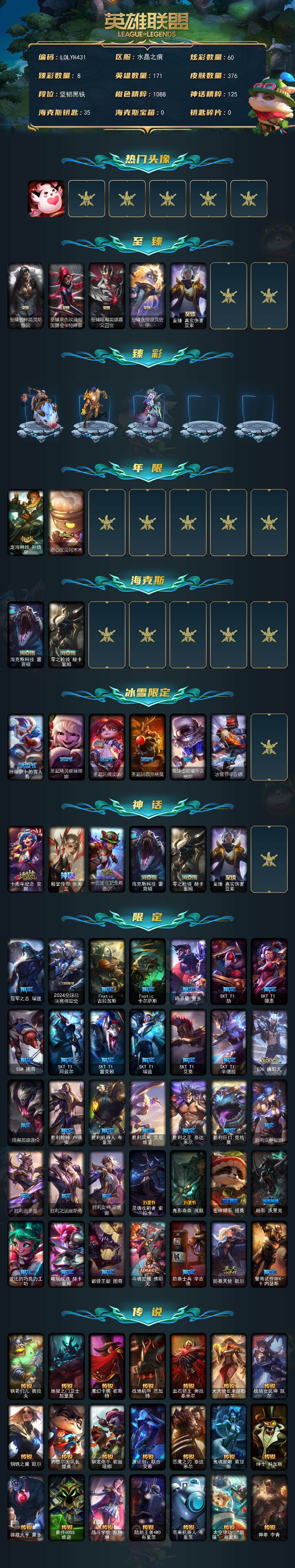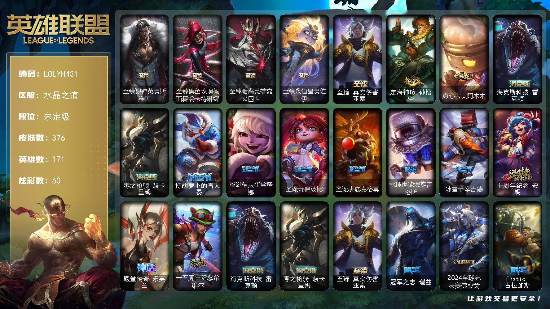 【54589】【LOLYH431】171英雄/376皮肤/10神话/43限定/8臻彩/60炫彩/41传说/88史诗/未定级/爱情鸽/至臻狼神英灵斯维因/至臻黑色玫瑰假面舞会卡特琳娜/至臻暗裔英雄嘉文四世/至臻永恒星灵佐伊/至臻真实伤害亚索/天龙之子卡莎飞龙乘云/无畏骑士瑟庄妮赤子初心/神龙尊者圣龙李青龙腾云起/星之守护者奥莉安娜未来之光/灵魂莲华亚索霜见之时/殿堂传奇乐芙兰登神/魔女阿卡丽虚荣/