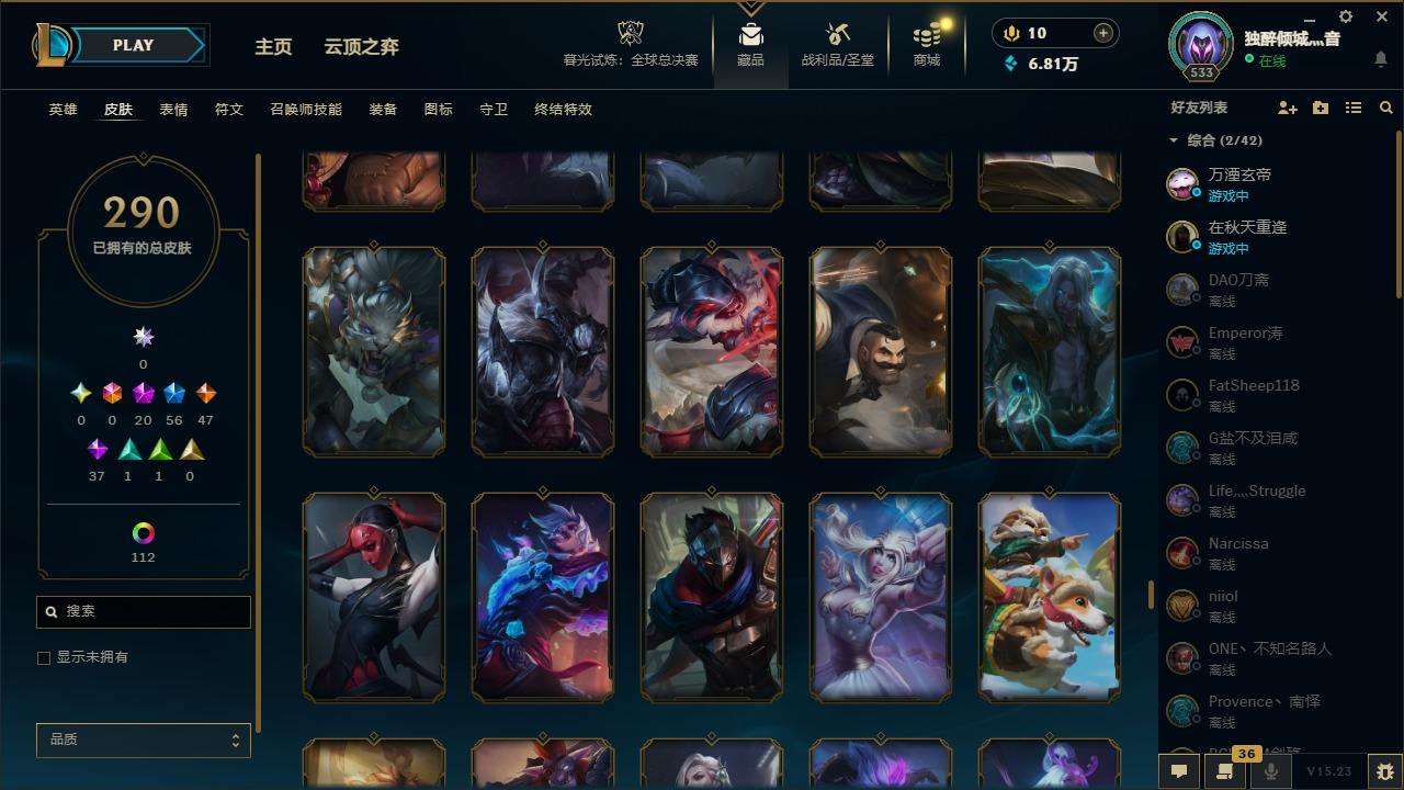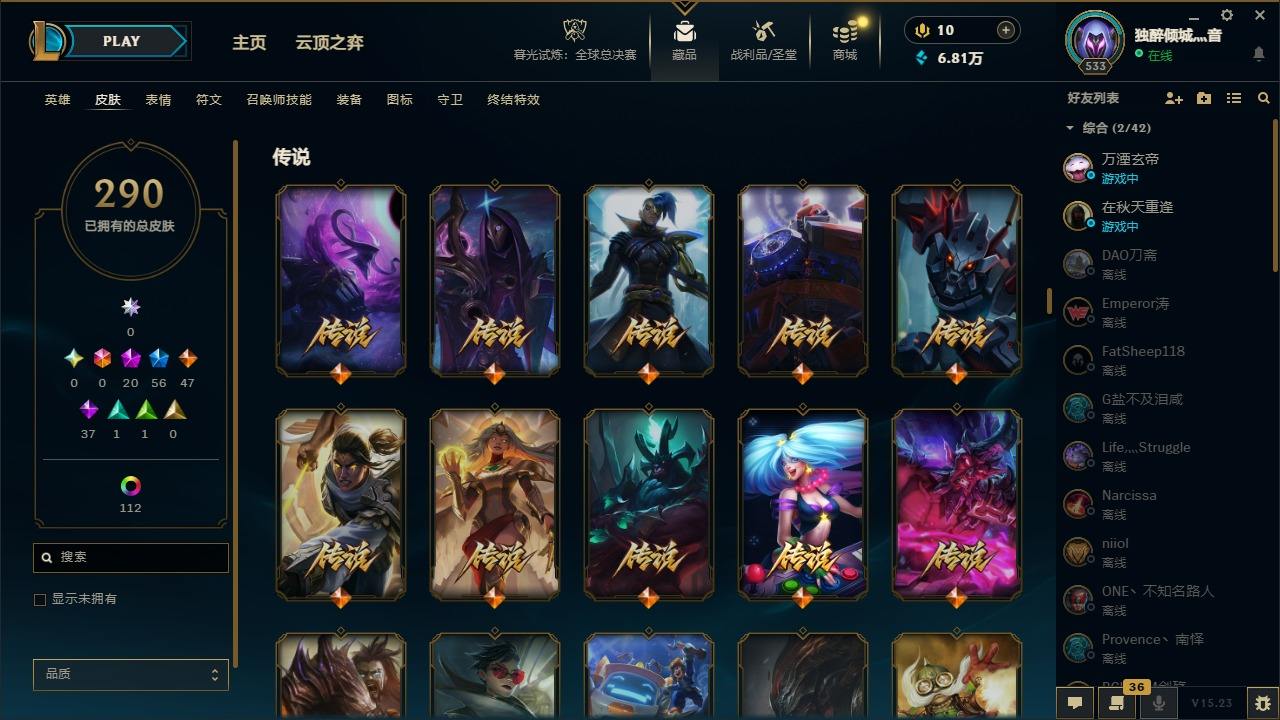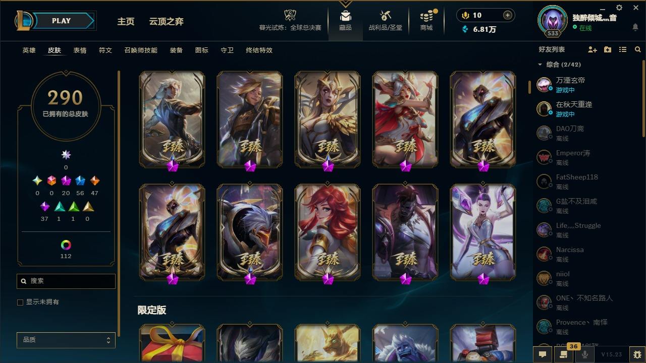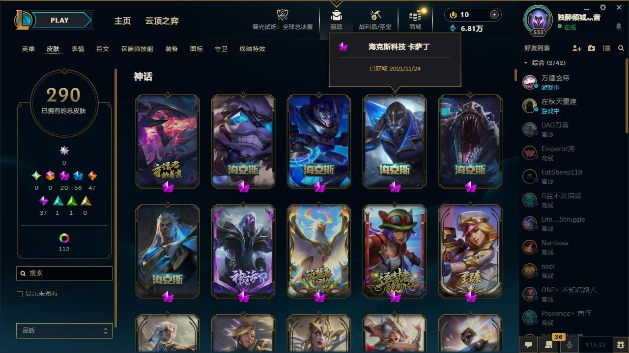 【54605】[13996098]20神话 56限定 47传说 37史诗 290皮肤 127炫彩 172英雄 可二次 可修改实名 【至臻】:至臻 未来战士 锤石(2022),至臻 电玩女神 凯特琳,至臻 未来战士 锤石,至臻 战斗学院 拉克丝,至臻 灵能特工 伊泽瑞尔,至臻 K/DA ALL OUT卡莎,至臻 源计划:阴 劫,至臻 魔女 乐芙兰,至臻 黑夜使者 凯隐,至臻 神凰行者 烈羽焰凰 霞