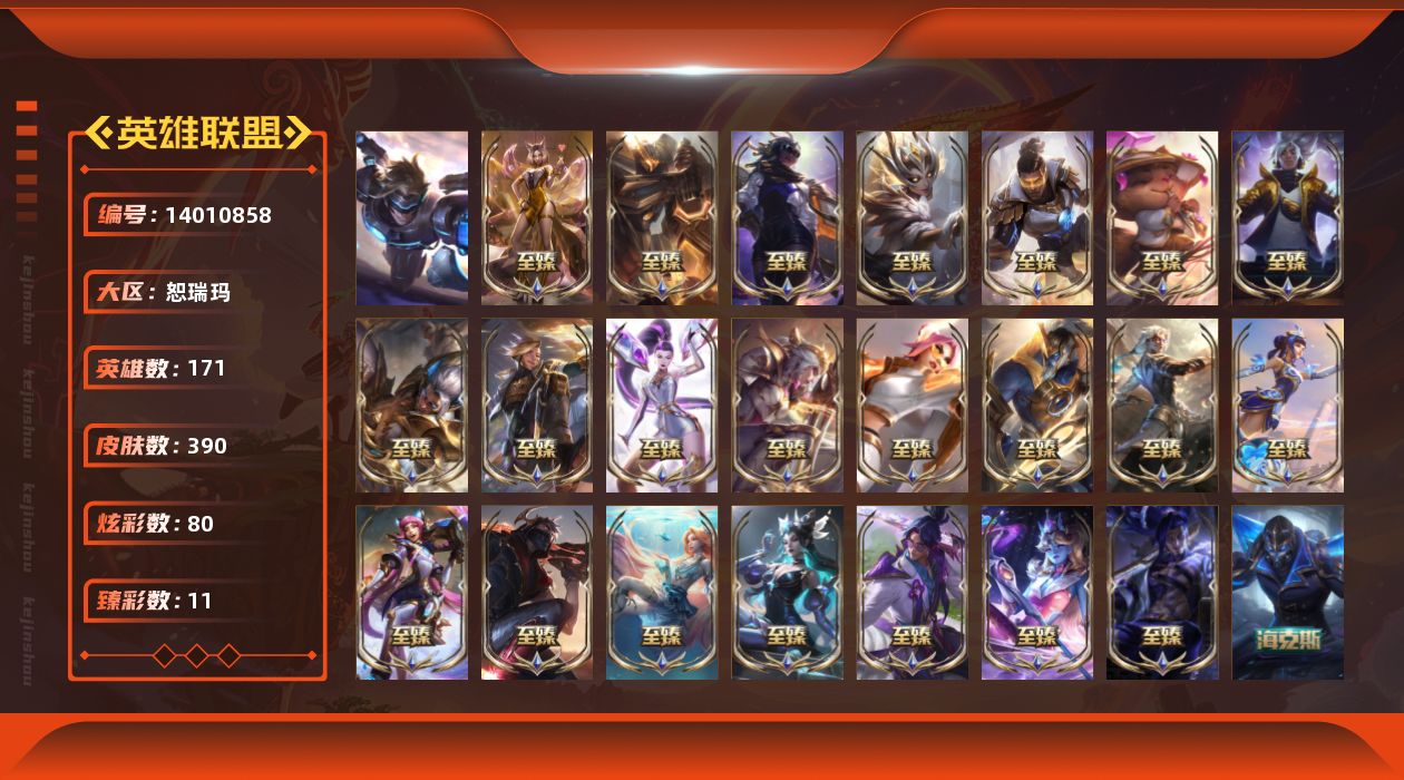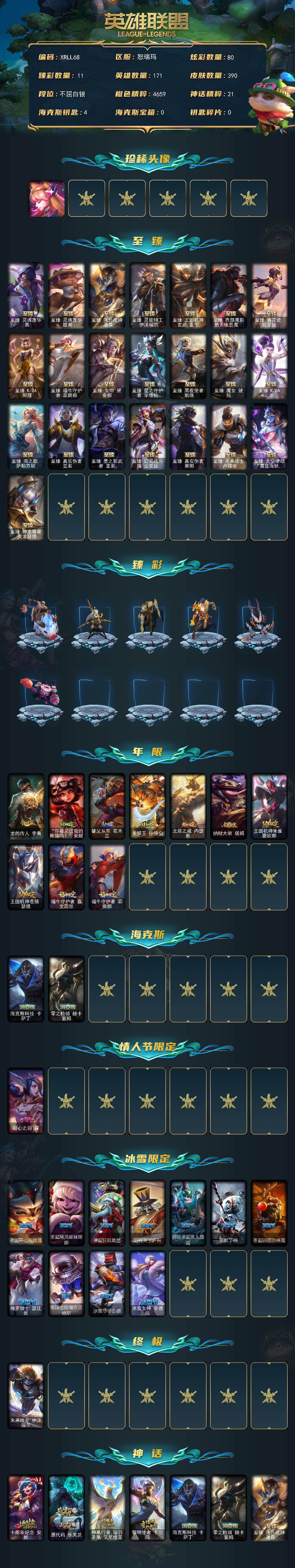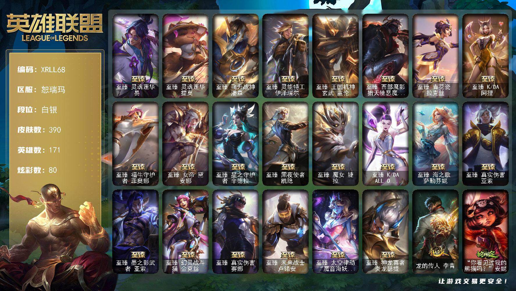 [14010858]Xr44204-可修改-白银段位-171英雄-390皮肤-80炫彩-1终极-28神话-66限定-41传说-79史诗 【珍稀头像】:星守阿狸头像 【至臻皮肤】:至臻灵魂莲华易,至臻灵魂莲华提莫,至臻飞升战神潘森,至臻灵能特工伊泽瑞尔,至臻王国机神玄武盖伦,至臻西部魔影猎天使恶魔泰隆,至臻青花瓷拉克丝,至臻KDA阿狸,至臻福牛守...