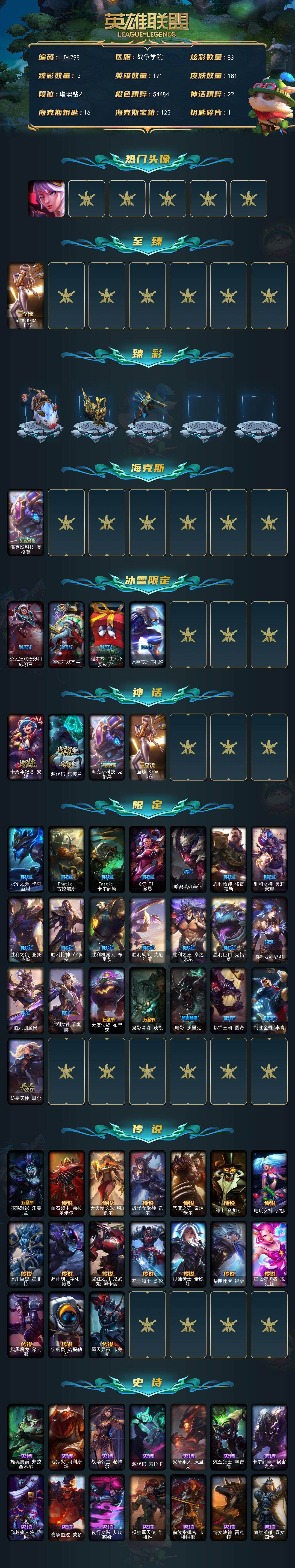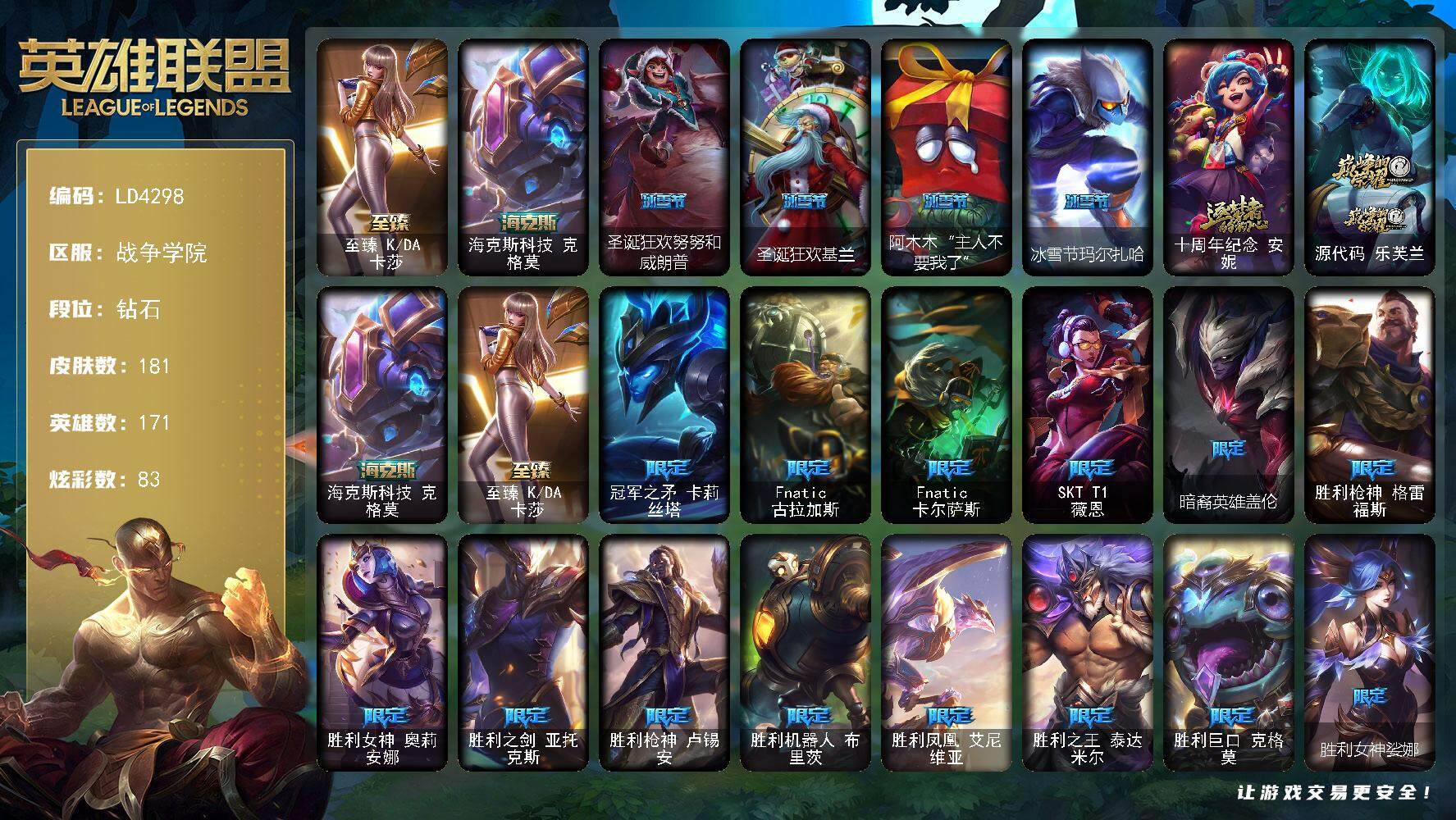【56951】【LD4298】171英雄/181皮肤/4神话/26限定/3臻彩/83炫彩/17传说/50史诗/钻石/觅心之翼奎因/至臻K/DA卡莎/无畏骑士瑟庄妮赤子初心/吕布奉先炫金战神/冠军之矛卡莉丝塔凯旋圣装/海克斯科技克格莫/圣诞狂欢努努和威朗普/圣诞狂欢基兰/阿木木:“主人不要我了”/冰雪节玛尔扎哈/十周年纪念安妮/源代码乐芙兰/冠军之矛卡莉斯塔/Fnatic古拉加斯/Fnatic卡尔