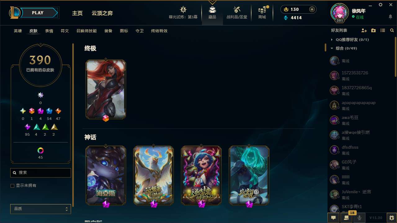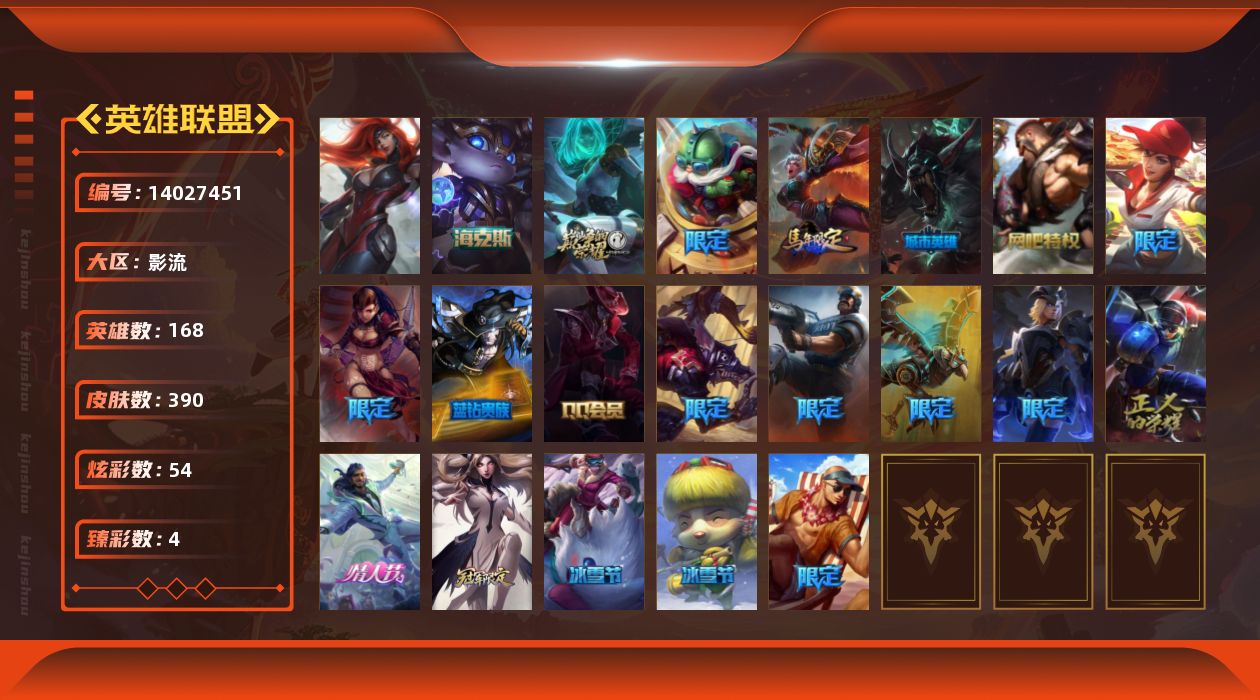 【57073】[14027451]t28703【影流】390皮肤 54炫彩 4臻彩 4神话/54限定/47传说/168英雄 账号等级:391【重要头像】KDA卡莎BAEST 灵魂莲华阿狸 披萨鸡 送披萨的小姐姐希维尔 真实伤害阿卡丽 【重要皮肤】海克斯科技波比 胜利之王泰达米尔 电玩女神阿狸 玉剑传说舞剑仙 灵能特工易 替父从军花木兰 胜利女神奥莉安娜 胜利枪神格雷福斯 胜利枪神卢锡安 胜利之剑