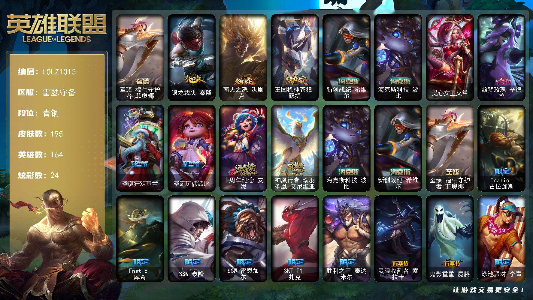 【57675】【LOLZ1013】164英雄/195皮肤/5神话/20限定/3臻彩/24炫彩/19传说/53史诗/青铜/至臻福牛守护者菲奥娜/无畏骑士瑟庄妮赤子初心/弹幕天使卡莎炽天使公正/源计划火菲奥娜惩戒/银龙裁决泰隆/南天之怒沃里克/王国机神苍狼瑟提/新创战纪希维尔/海克斯科技波比/觅心女皇艾希/幽梦玫瑰辛德拉/圣诞狂欢基兰/圣诞玩偶波比/十周年纪念安妮/神凰行者瑞羽凤凰艾尼维亚/Fnat