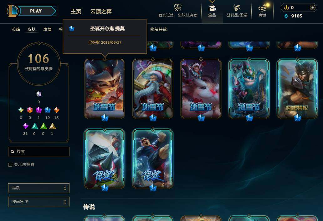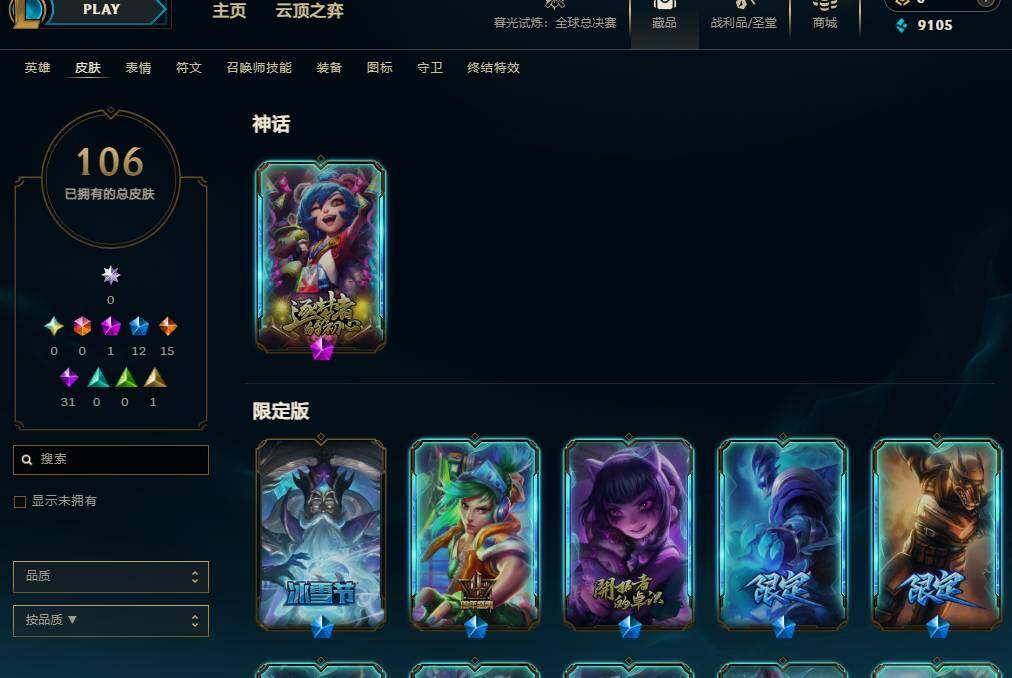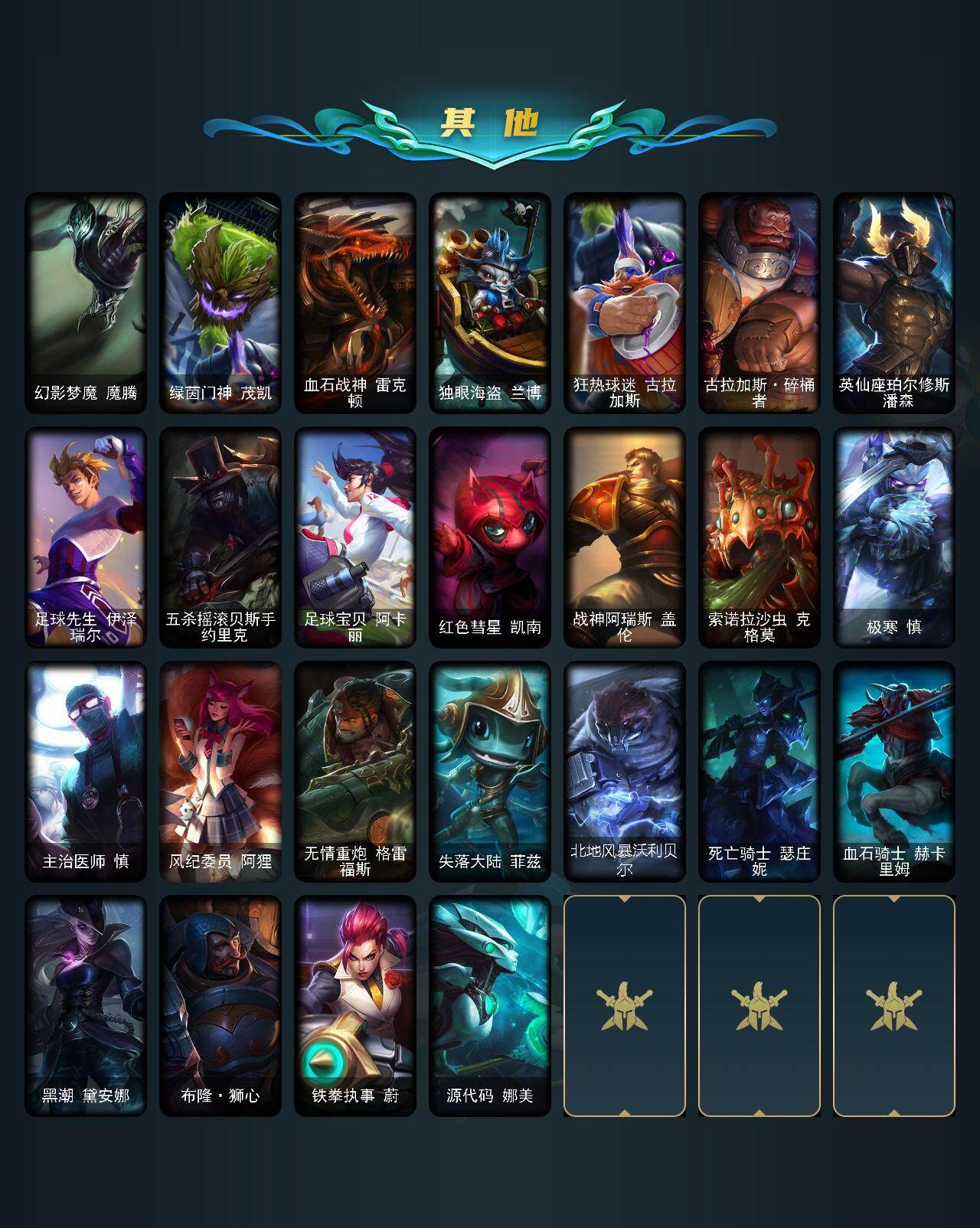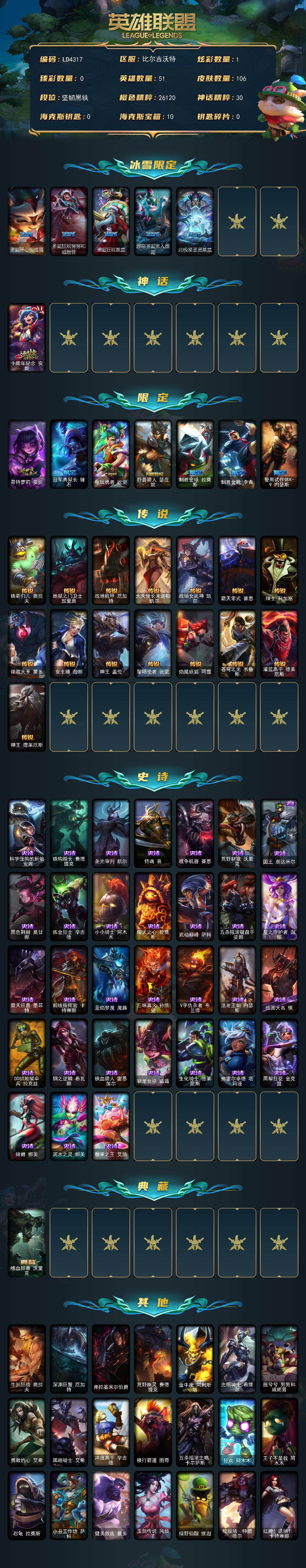 【58341】【LD4317】51英雄/106皮肤/1神话/12限定/1炫彩/15传说/31史诗/未定级/圣诞开心鬼提莫/圣诞狂欢努努和威朗普/圣诞狂欢基兰/邪恶圣诞老人维迦/北极星圣贤基兰/十周年纪念安妮/哥特萝莉安妮/冠军典狱长锤石/电玩勇者锐雯/野兽猎人瑟庄妮/制胜金球拉莫斯/制胜金靴李青/警用试作体K-9内瑟斯/铁哥们儿奥拉夫/地狱之门卫士加里奥/战地机甲厄加特/大天使长米迦勒凯尔/战场