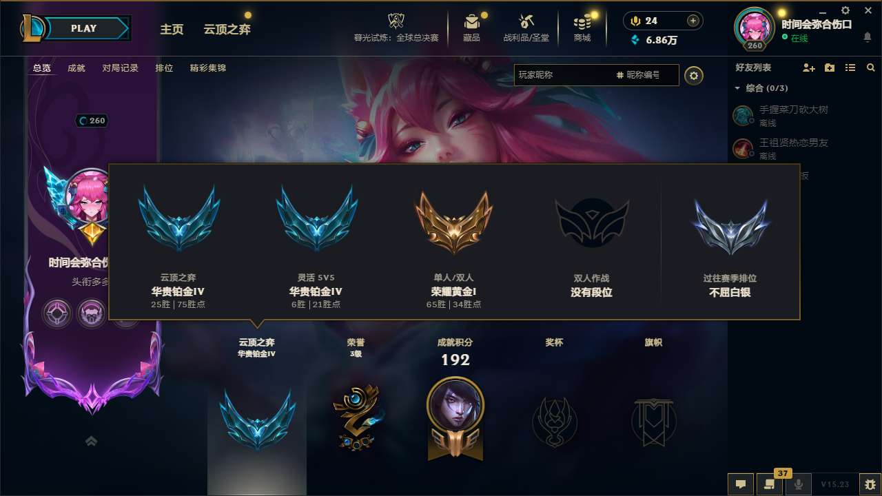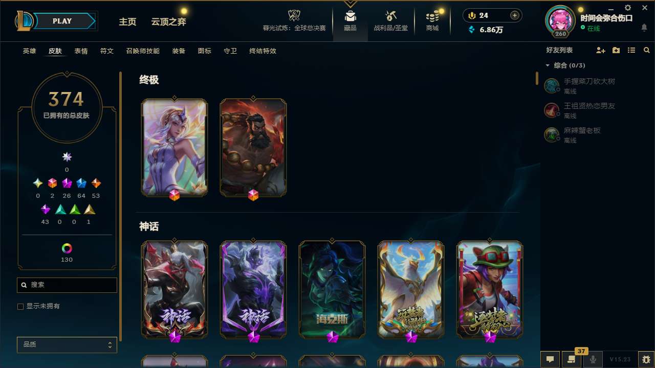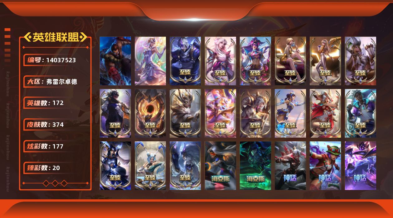 【58910】[14037523]t31038【弗雷尔卓德】374皮肤 177炫彩 20臻彩 26神话/64限定/53传说/172英雄 账号等级:260 云顶神话:1 单双排段位:黄金【重要头像】云顶古琴娑娜 心型钥匙 觅心游侠卢锡安 救生圈 灵魂莲华辛德拉炫彩 水晶圣骑艾希头 灰烬慎头像 灰烬慎炫彩头 【重要皮肤】莲华温泉厄斐琉斯至臻 灵魂莲华劫至臻 灵魂莲华拉克丝至臻
