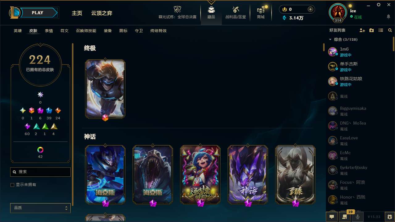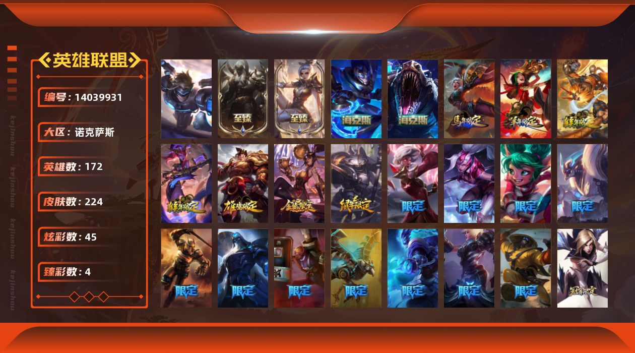 【59353】[14039931]t30999【诺克萨斯】224皮肤 45炫彩 4臻彩 6神话/39限定/24传说/172英雄 账号等级:314 单双排段位:钻石【重要头像】沐浴震惊 可爱安妮 【重要皮肤】玉剑传说武剑仙至臻 腥红之月亚托克斯至臻 海克斯科技雷克顿 海克斯科技嘉文四世 水晶掠夺者卡兹克 胜利女神娑娜 胜利巨口克格莫 勇敢的心德莱厄斯 电玩女神阿狸 玉剑传说无