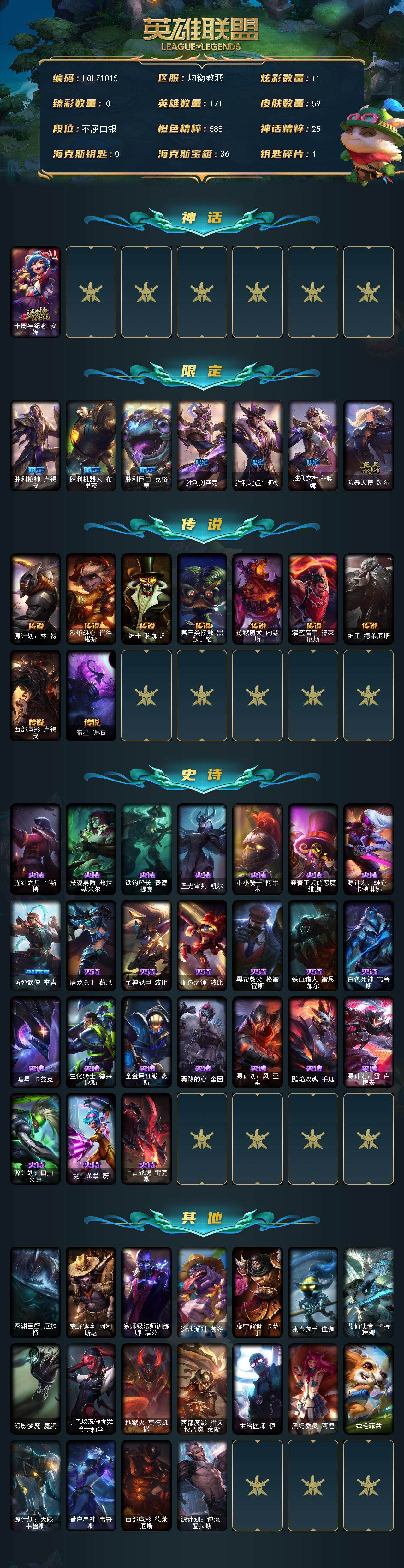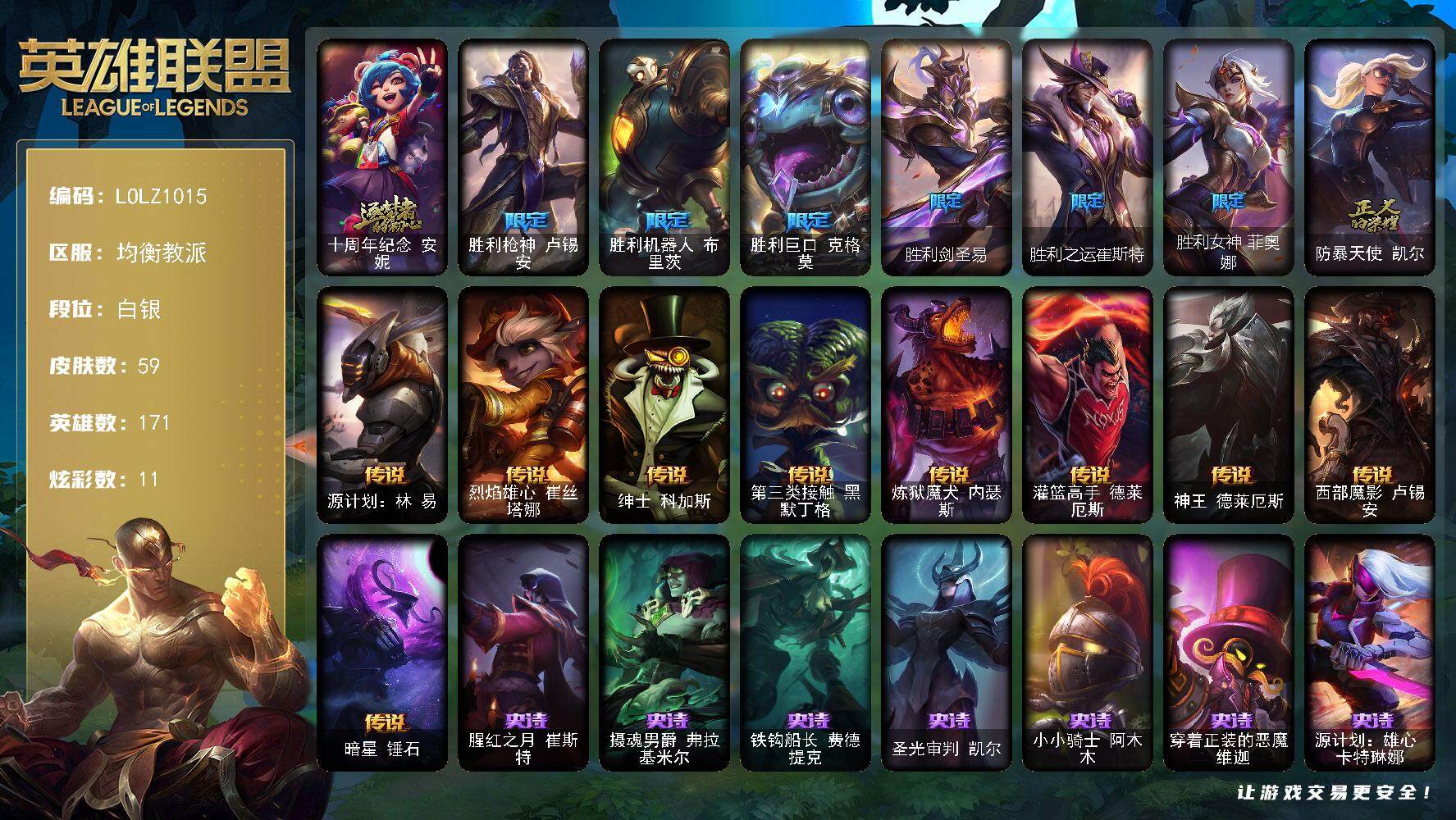 【59738】【LOLZ1015】171英雄/59皮肤/1神话/7限定/11炫彩/9传说/24史诗/白银账号等级:235/十周年纪念安妮/胜利枪神卢锡安/胜利机器人布里茨/胜利巨口克格莫/胜利剑圣易/胜利之运崔斯特/胜利女神菲奥娜/防暴天使凯尔/源计划:林易/烈焰雄心崔丝塔娜/绅士科加斯/第三类接触黑默丁格/炼狱魔犬内瑟斯/灌篮高手德莱厄斯/神王德莱厄斯/西部魔影卢锡安/暗星锤石/腥红之月崔斯特