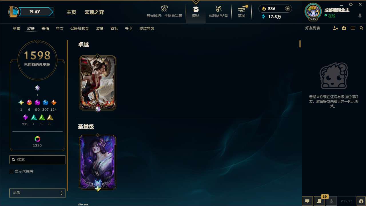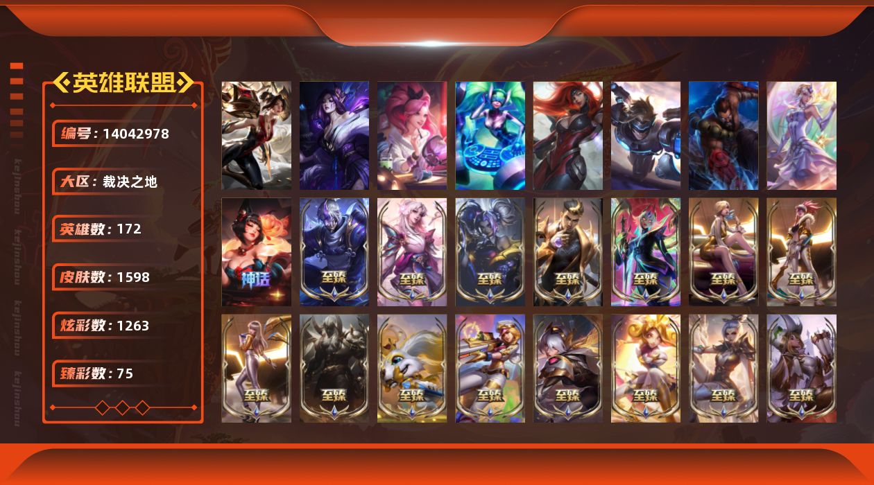 【60080】[14042978]t31004 皇冠账号【裁决之地】殿堂传奇卡莎 灵魂莲华莫甘娜 四色龙瞎 1598皮肤 1263炫彩 75臻彩 90神话/307限定/124传说/172英雄 账号等级:949 单双排段位:黑铁【重要头像】至爱的鹿 爱意绵绵 爱情之歌 心型钥匙 觅心游侠卢锡安 觅心之翼奎因 奥瑞利安萌尔 雪花 银河魔装机神安妮 萨勒芬妮超级巨星 萨勒芬妮独立