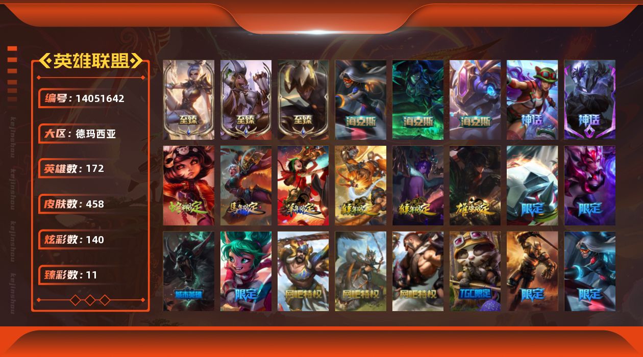 【61806】[14051642]t31028【德玛西亚】458皮肤 140炫彩 11臻彩 9神话/84限定/49传说/172英雄 账号等级:432【重要头像】至爱的鹿 小斗 源计划艾瑞莉娅 【重要皮肤】魅惑女巫厄运小姐至臻 玉剑传说武剑仙至臻 黑夜使者李青至臻 灰烬杀手塞拉斯 海克斯科技克格莫 摄魂使者薇恩 新创战纪希维尔 胜利剑圣易 黑夜使者弗拉基米尔 勇敢的心德莱厄