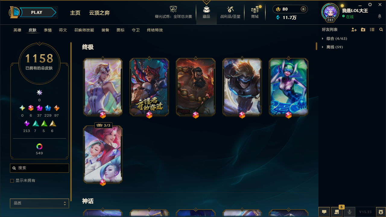 【62516】[14054485]t31005【德玛西亚】1158皮肤 619炫彩 33臻彩 37神话/229限定/97传说/172英雄 账号等级:741 云顶神话:6【重要头像】云顶战斗学院伊泽瑞尔 爱意绵绵 爱情鸽 爱情之歌 心型钥匙 觅心游侠卢锡安 觅心之翼奎因 雪花 银河魔装机神安妮 神凰行者萨勒芬妮 两仪无极 萨勒芬妮超级巨星 萨勒芬妮独立音乐人 玉剑传说苍鸾
