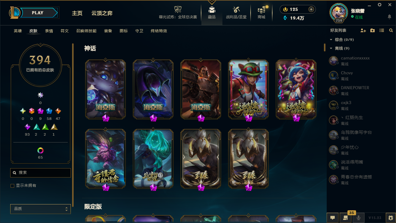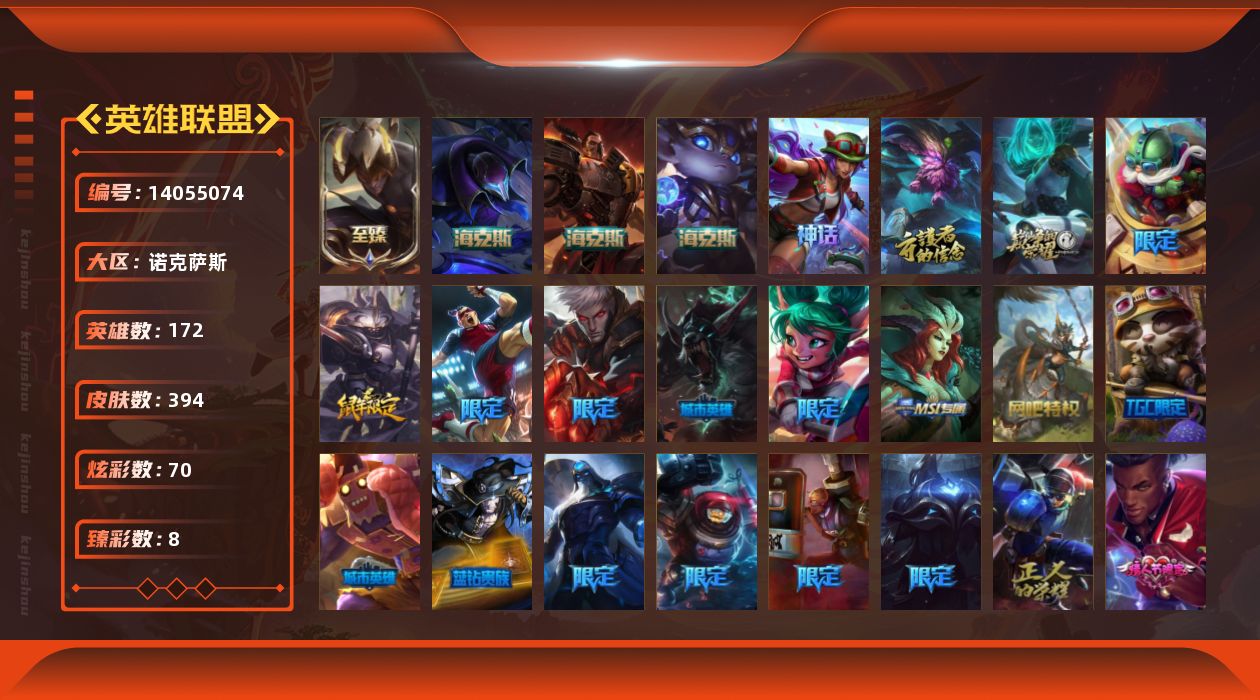 【62647】[14055074]t31017【诺克萨斯】394皮肤 70炫彩 8臻彩 9神话/58限定/47传说/172英雄 账号等级:759【重要头像】征服者韦鲁斯 【重要皮肤】黑夜使者李青至臻 黑夜使者李青2022至臻 海克斯科技波比 海克斯科技魔腾 永恒之森奥恩 恐惧新星德莱厄斯 胜利剑圣易 胜利女神娑娜 胜利之王泰达米尔 胜利巨口克格莫 荣誉使者玛尔扎哈 电玩勇