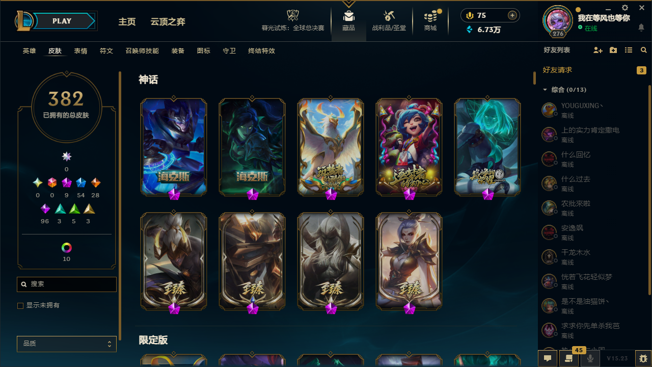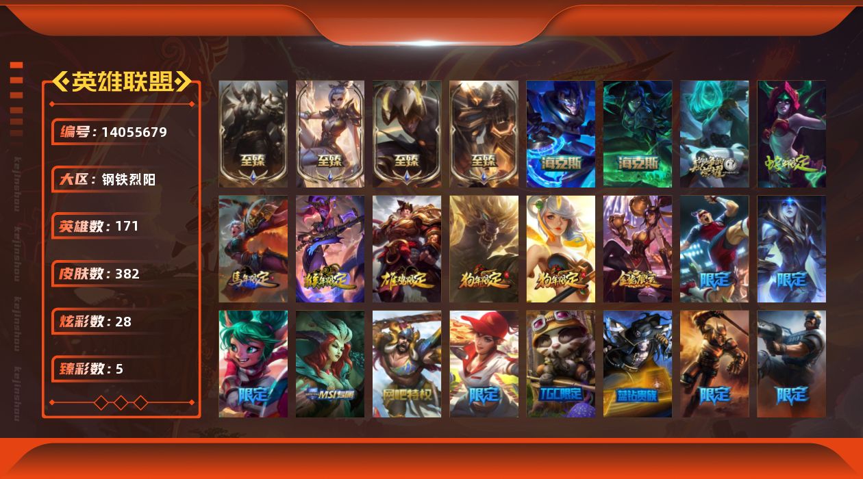 【62788】[14055679]t30971 皇冠号【钢铁烈阳】382皮肤 28炫彩 5臻彩 9神话/54限定/28传说/171英雄 账号等级:276【重要头像】爱情鸽 【重要皮肤】机神玄武盖伦至臻 玉剑传说武剑仙至臻 腥红之月亚托克斯至臻 黑夜使者李青至臻 海克斯科技嘉文四世 摄魂使者薇恩 电玩女神厄运小姐 电玩女神阿狸 星之守护者伊泽瑞尔 玉剑传说舞剑仙 替父从军花木