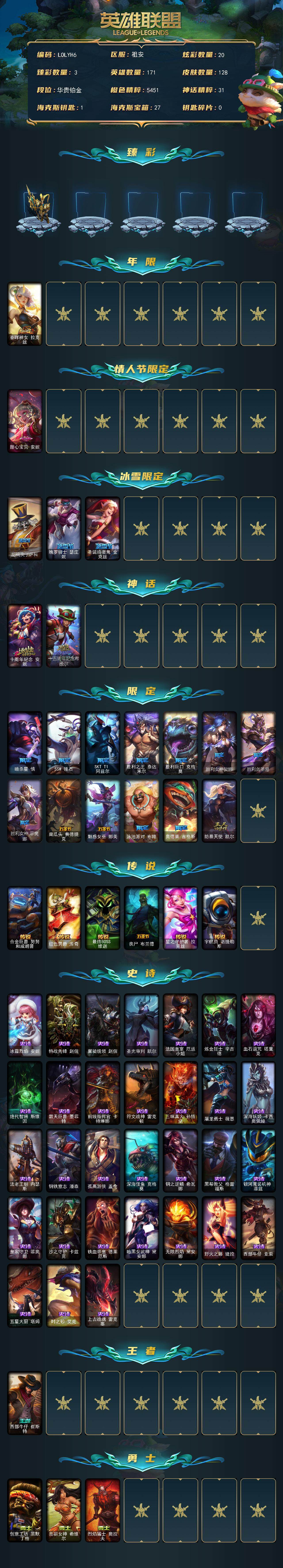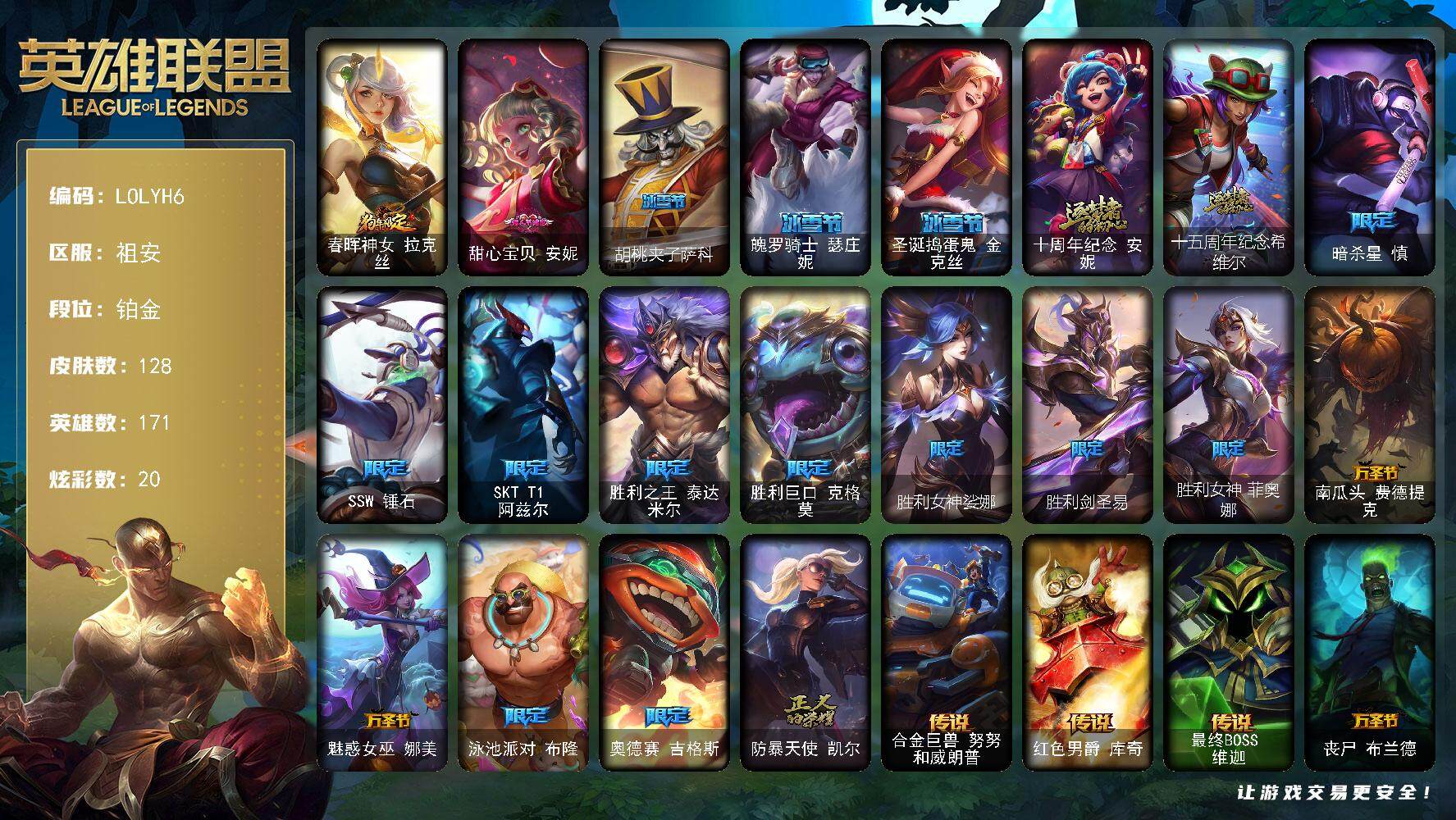 【63052】【LOLYH293】171英雄/128皮肤/2神话/18限定/3臻彩/20炫彩/6传说/31史诗/铂金/吕布奉先炫金战神/冠军之刃锐雯2016凯旋圣装/魔女阿卡丽虚荣/春晖神女拉克丝/甜心宝贝安妮/胡桃夹子萨科/魄罗骑士瑟庄妮/圣诞捣蛋鬼金克丝/十周年纪念安妮/十五周年纪念希维尔/暗杀星慎/SSW锤石/SKTT1阿兹尔/胜利之王泰达米尔/胜利巨口克格莫/胜利女神娑娜/胜利剑圣易/胜