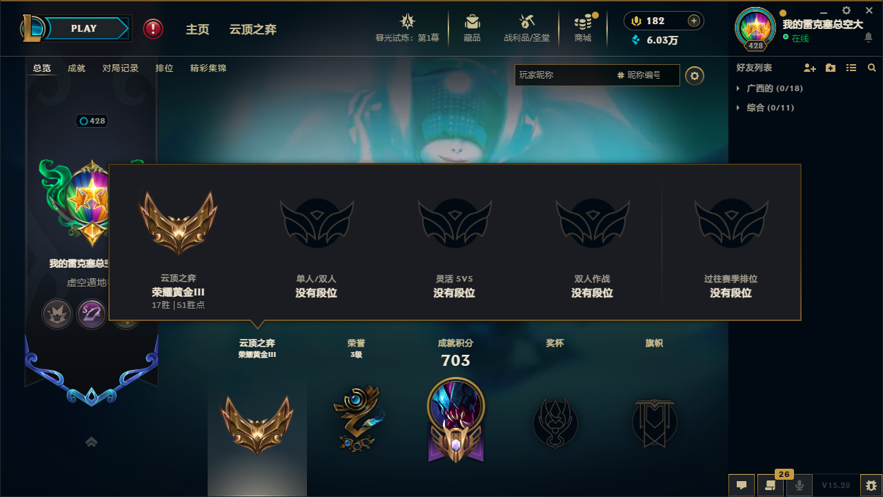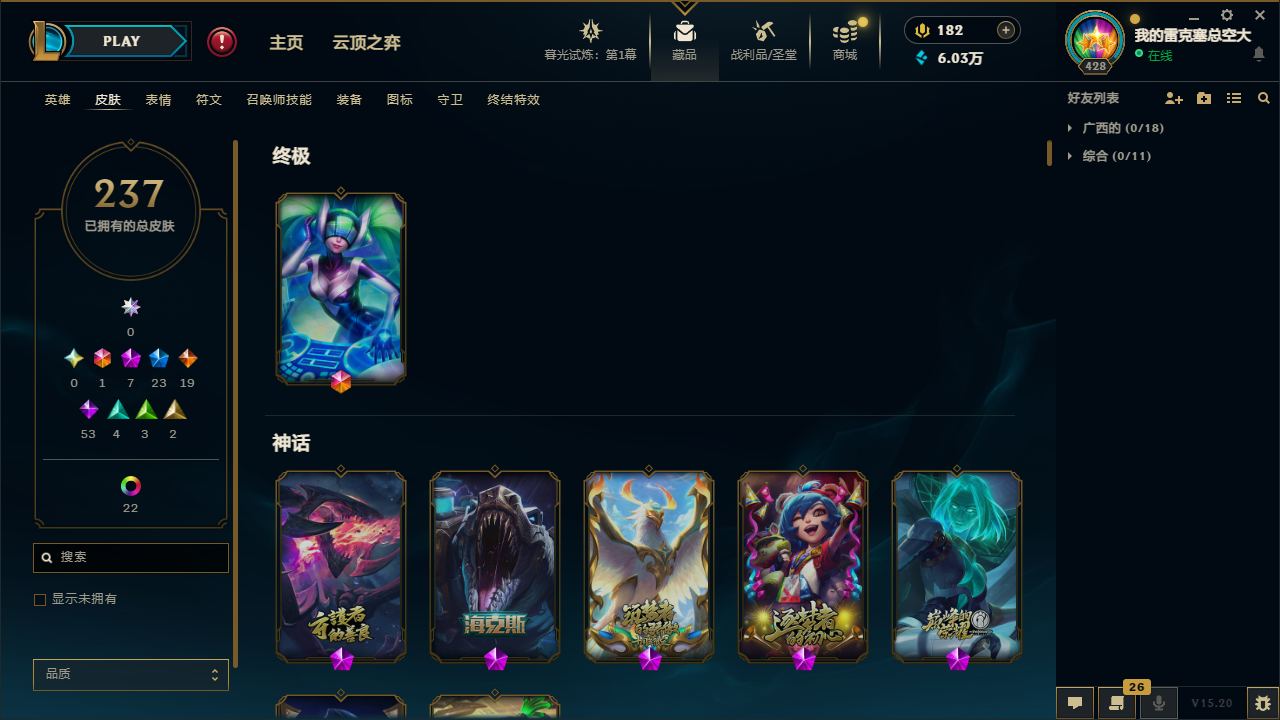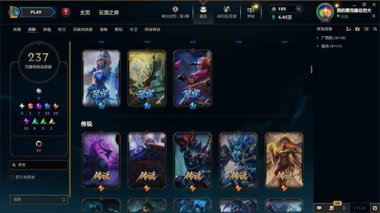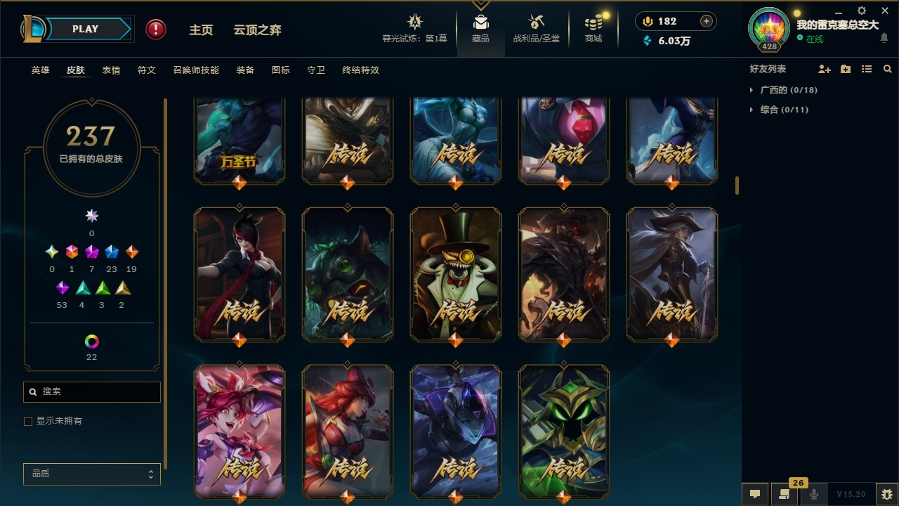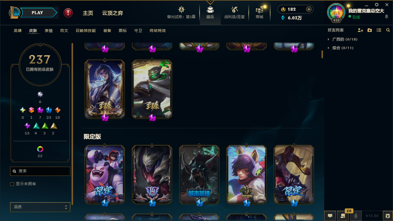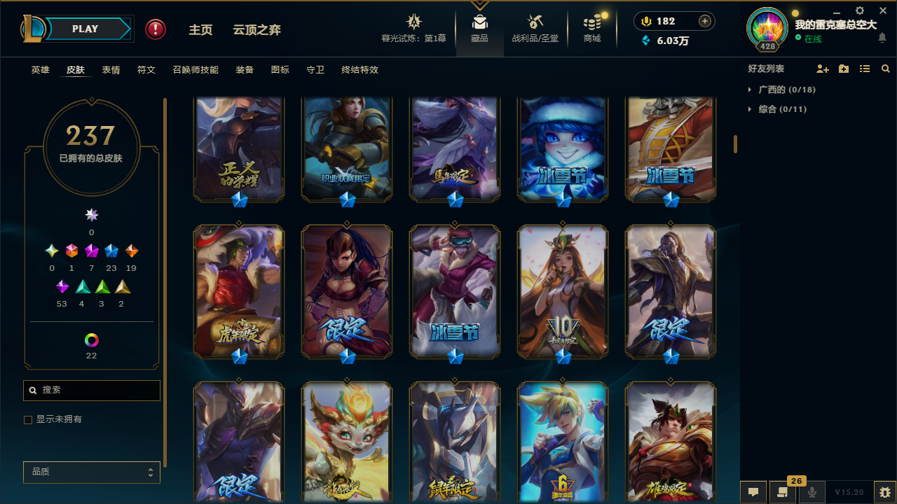 【63497】WL500 战争学院428级 171英雄-237皮肤-段位:未定级 DJ-娑娜 至臻征服者贾克斯 钢铁军团拉克丝 都铎王朝老鼠 女猎手希维尔 海克斯雷克顿 虎年龙腾虎跃瑟提 马年黛安娜 鸡年盖伦 鼠年瑟提 10周年安妮 10周年神凰行者瑞羽圣凰艾尼维亚 10周年萨勒芬妮 五周年阿狸 6周年伊泽瑞尔 寒冬精灵璐璐 胡桃夹子小丑 魄罗骑士瑟庄妮 胜利之剑剑魔 胜利枪神卢锡安 S10G蕾