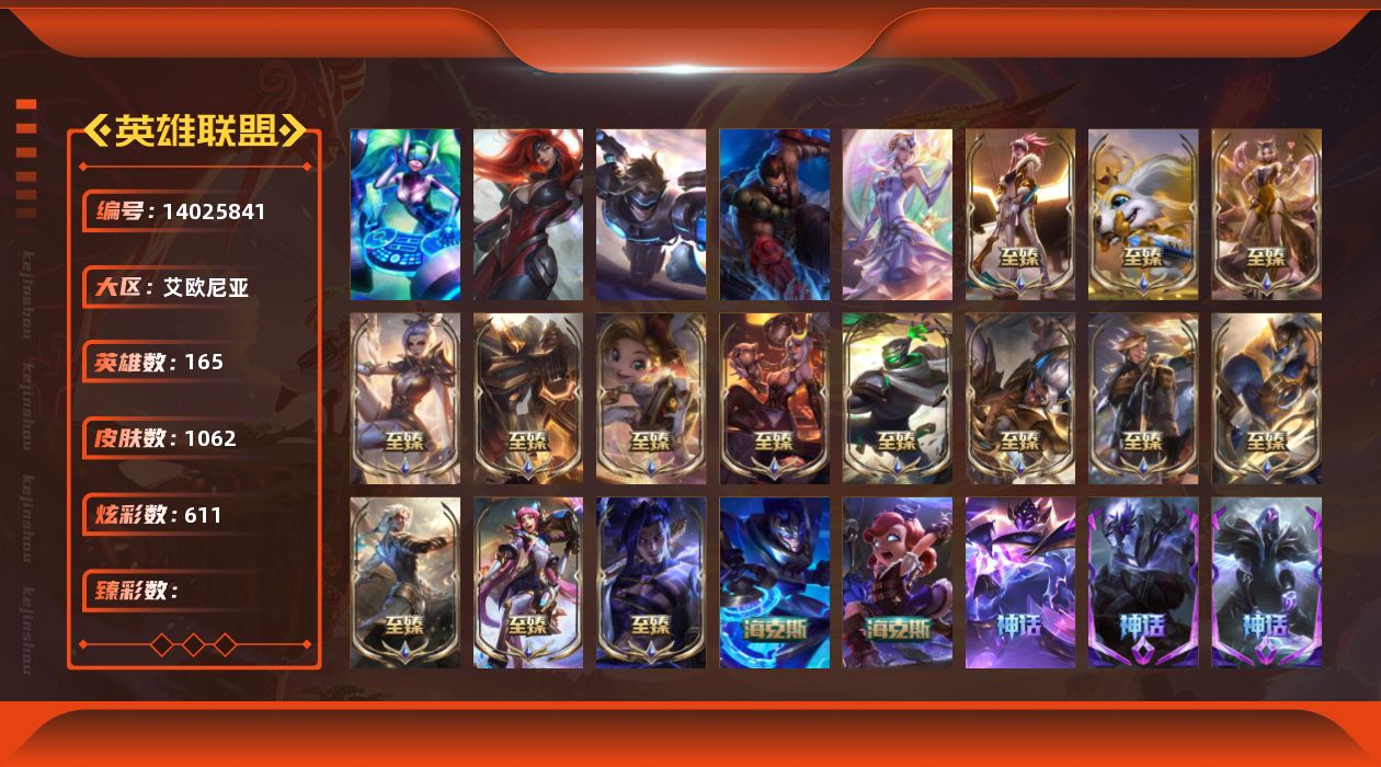 【63695】5终极 21神话 224限定 91传说 215史诗 1062皮肤 611炫彩 165英雄 可二次 可修改实名 【至臻】:至臻 K/DA 阿卡丽,至臻 绒毛菲兹,至臻 K/DA 阿狸,至臻 玉剑传说 武剑仙,至臻 王国机神玄武 盖伦,至臻 奥术师 佐伊,至臻 烈焰美人 薇恩,至臻 征服者 贾克斯,至臻 神龙尊者 炎龙瑟提,至臻 灵能特工 伊泽瑞尔,至臻 飞升战神 潘森,至臻 黑夜使者