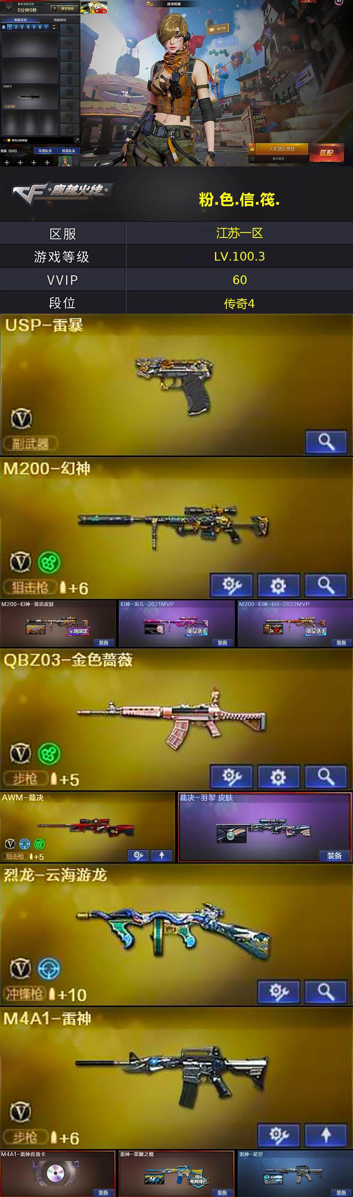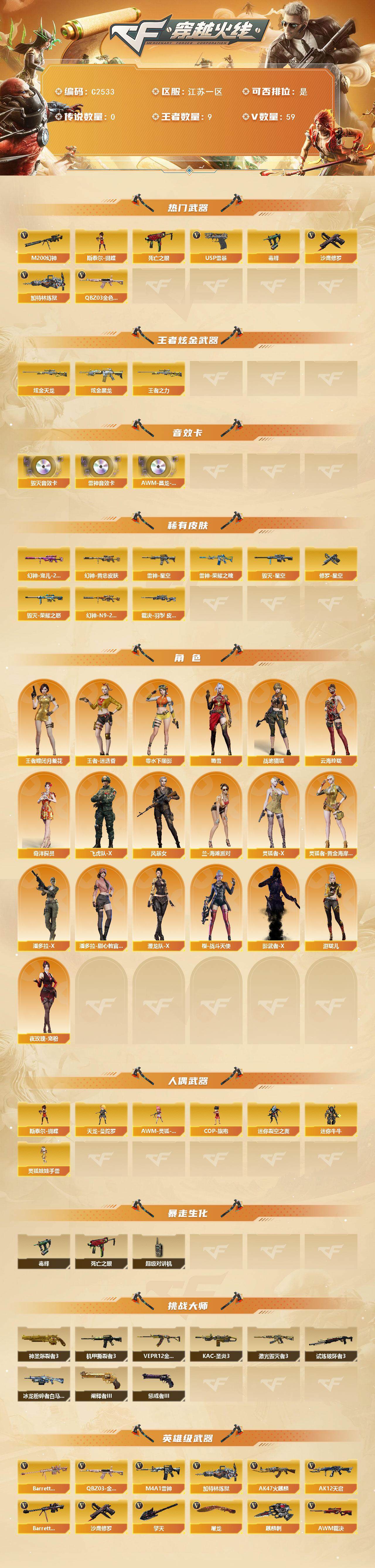 【65482】【65482】【C2533】江苏一区-59V-9王者-3炫金【双全号 QBZ03-金色蔷薇,M200-幻神,死亡之眼*3,毒蜂,加特林-炼狱,斯