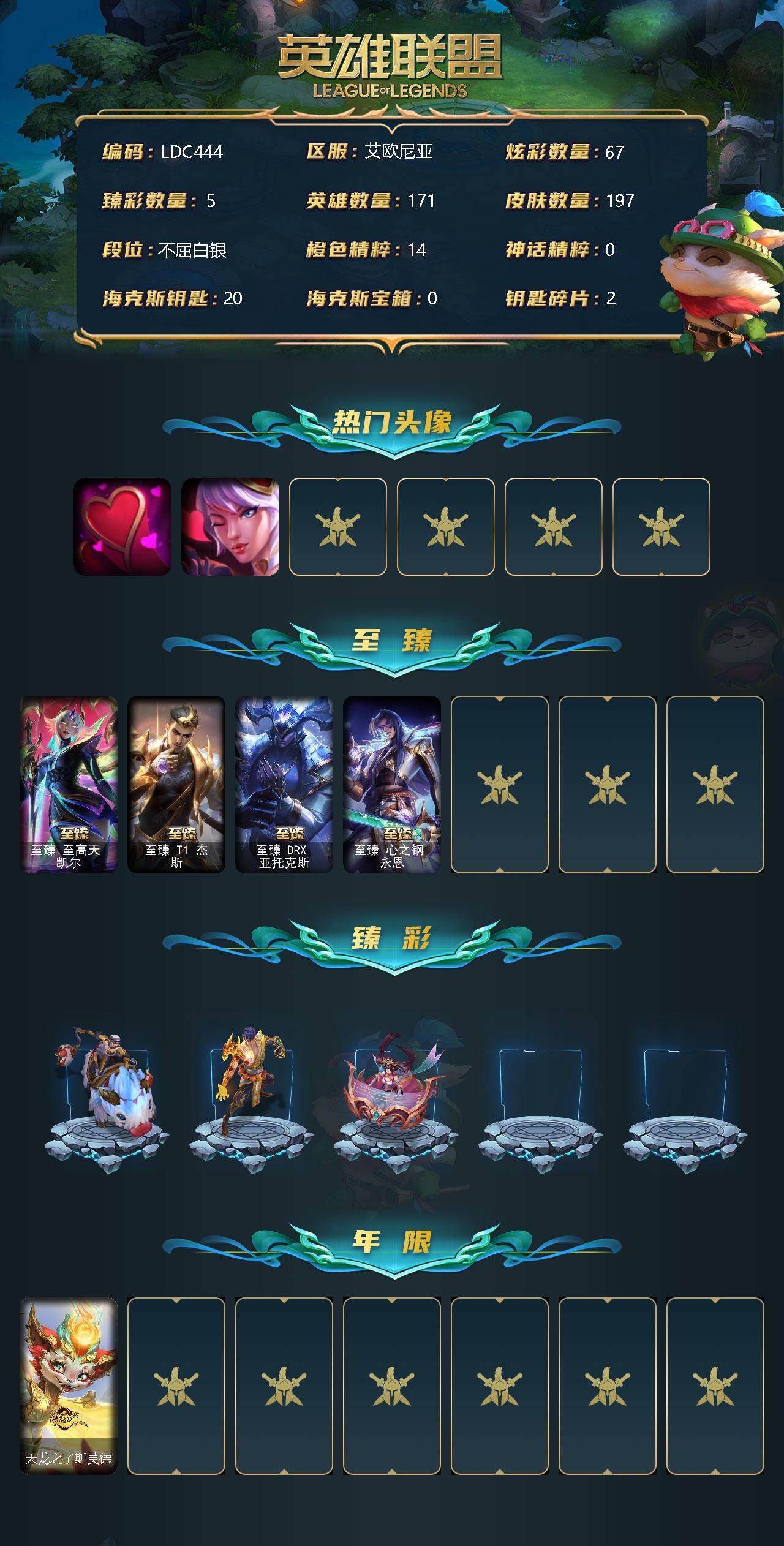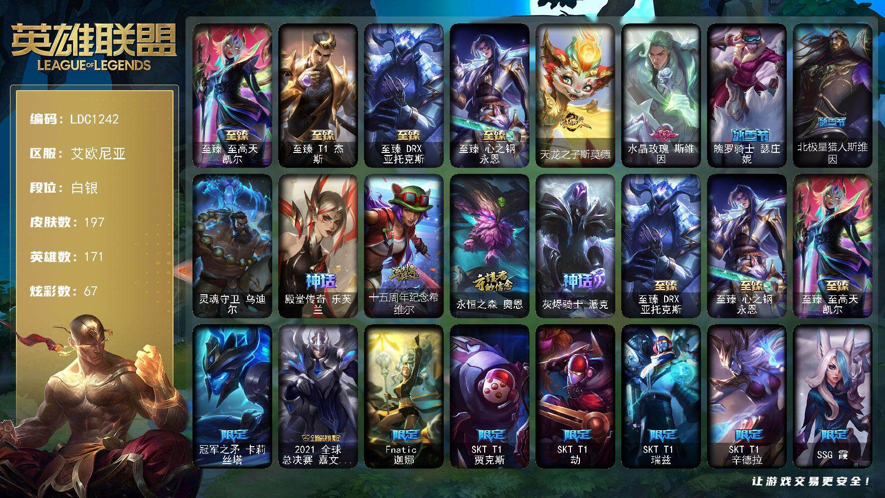 【65789】【LDC1242】171英雄/197皮肤/1终极/8神话/25限定/5臻彩/67炫彩/42传说/32史诗/白银账号等级:468/爱意绵绵/觅心之翼奎因/至臻至高天凯尔/至臻T1杰斯/至臻DRX亚托克斯/至臻心之钢永恩/无畏骑士瑟庄妮赤子初心/神龙尊者圣龙李青龙腾云起/玉剑传说琴仙子丁香/殿堂传奇乐芙兰登神/魔女阿卡丽虚荣/天龙之子斯莫德/水晶玫瑰斯维因/魄罗骑士瑟庄妮/北极星猎人斯