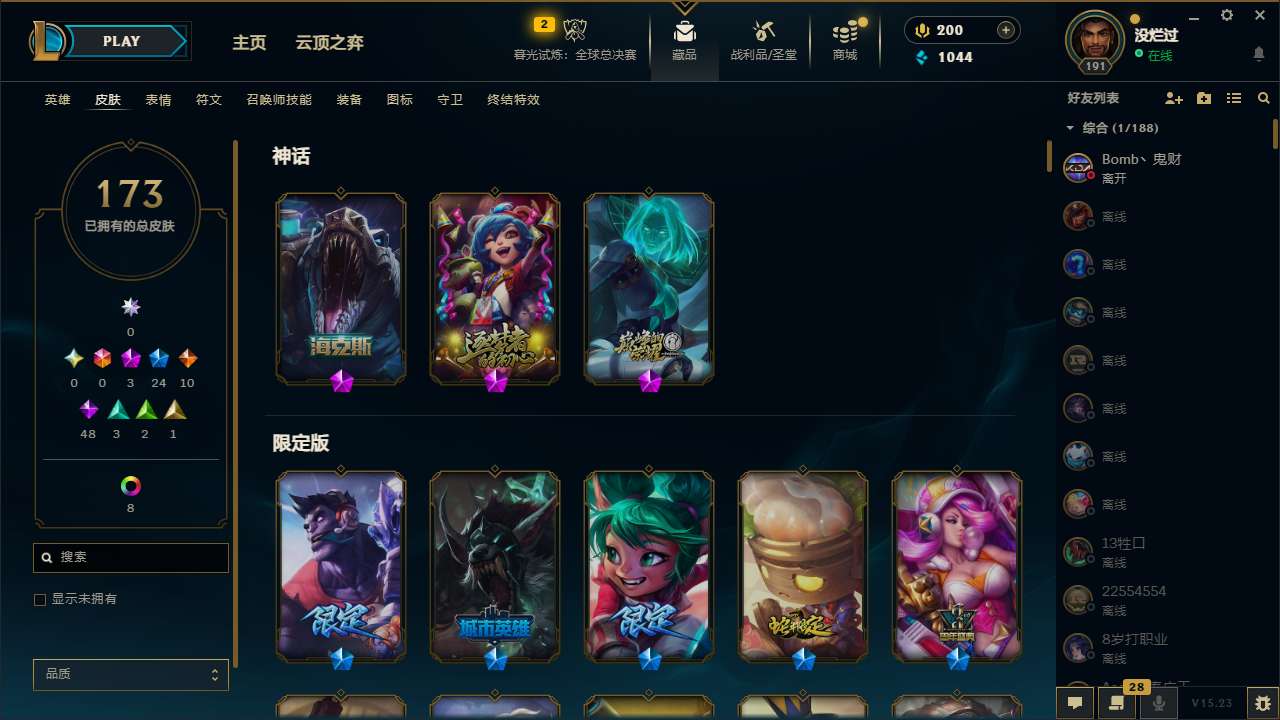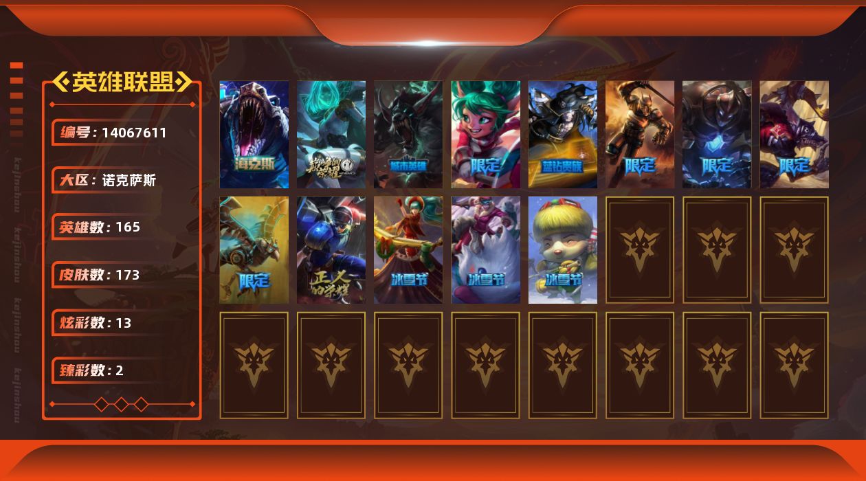 【65879】[14067611]t31059【诺克萨斯】173皮肤 13炫彩 2臻彩 3神话/24限定/10传说/165英雄 账号等级:191 单双排段位:黑铁【重要皮肤】海克斯科技雷克顿 胜利女神希维尔 电玩女神厄运小姐 点心宝贝阿木木 胜利之树茂凯 胜利枪神格雷福斯 胜利之剑亚托克斯 魄罗骑士瑟庄妮 平安夜女神娑娜 SSW图奇 暗杀星蒙多 防暴天使凯尔 钢铁之翼艾尼