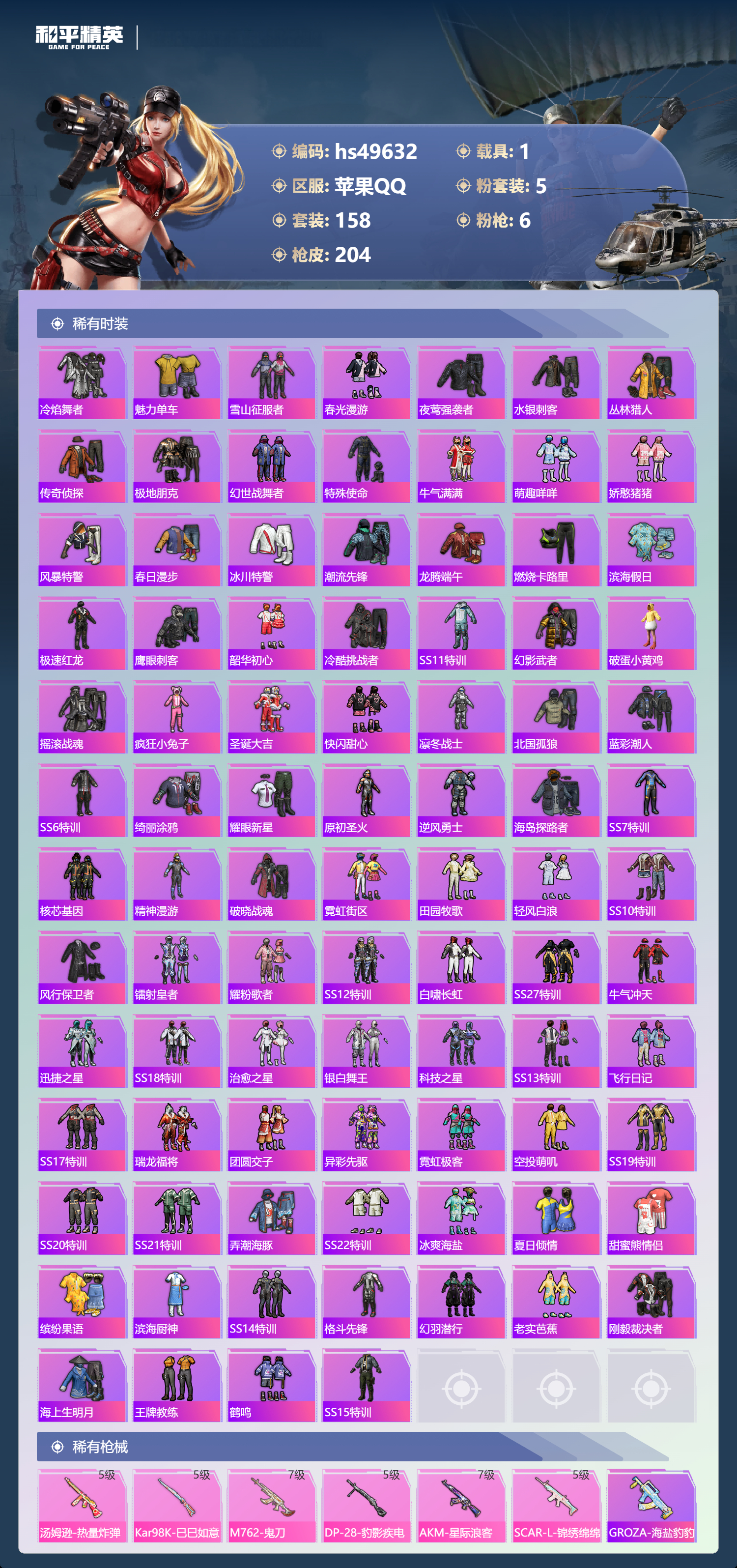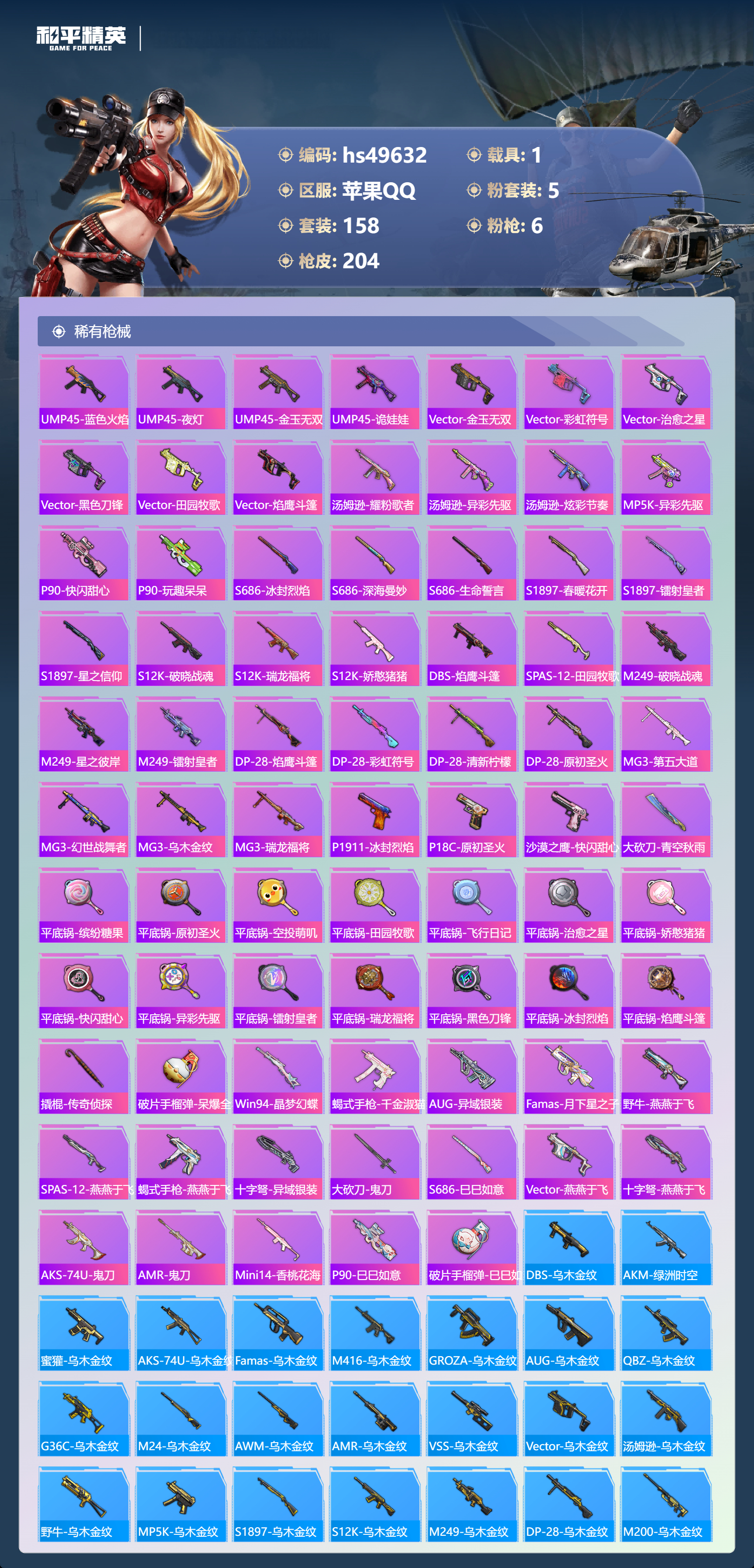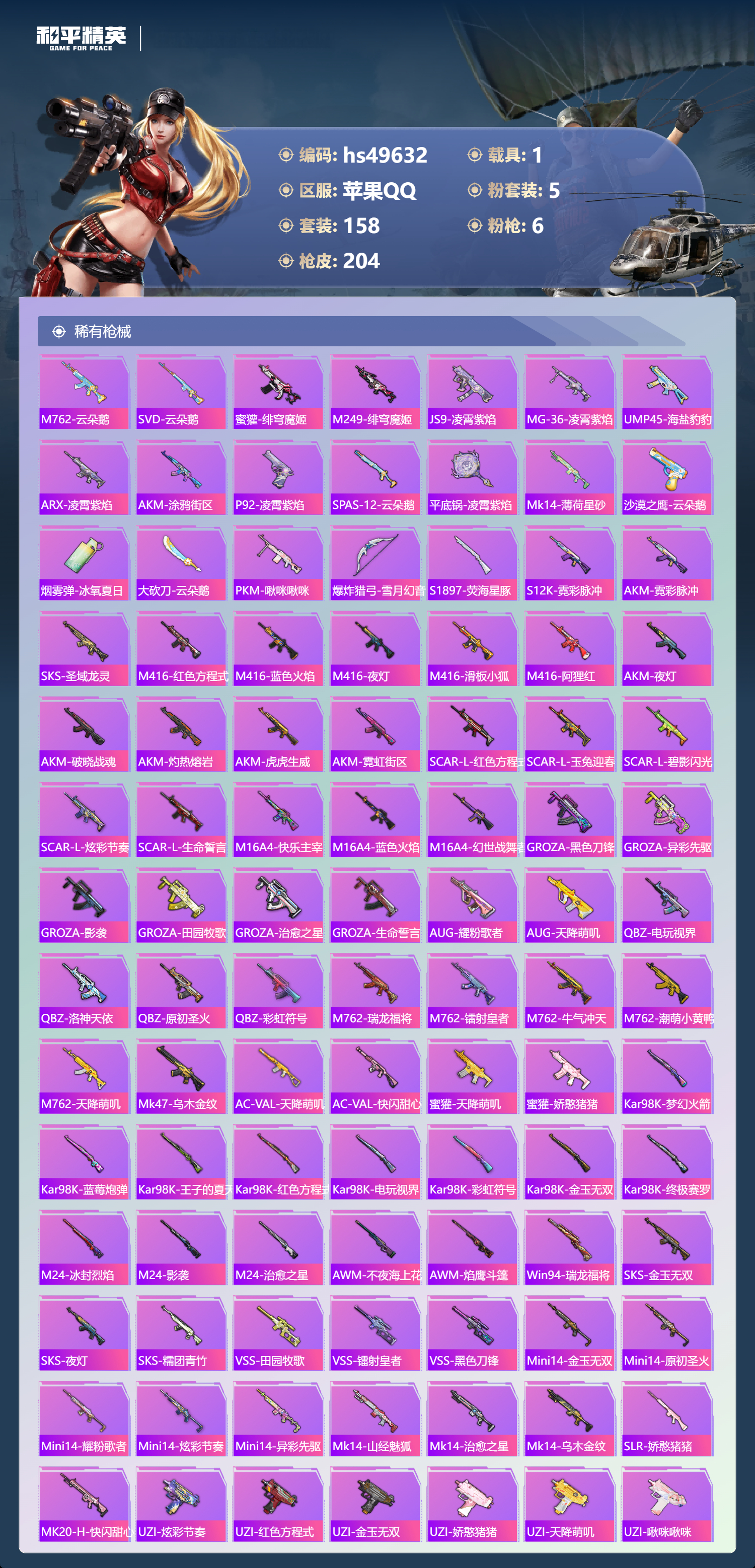 【65962】【不可二次】【苹果QQ】水银刺客 AKM-星际浪客 M762-瑞龙福将 韶华初心 黑色刀锋 极速红龙 M762-潮萌小黄鸭 SCAR-L-锦绣绵绵 梦幻火箭 暗夜玫瑰 天使彩虹糖 锦绣火鲤飞行器 神秘黑猫飞行器 瑞龙福将 浪漫天命 雪山精英 团圆交子