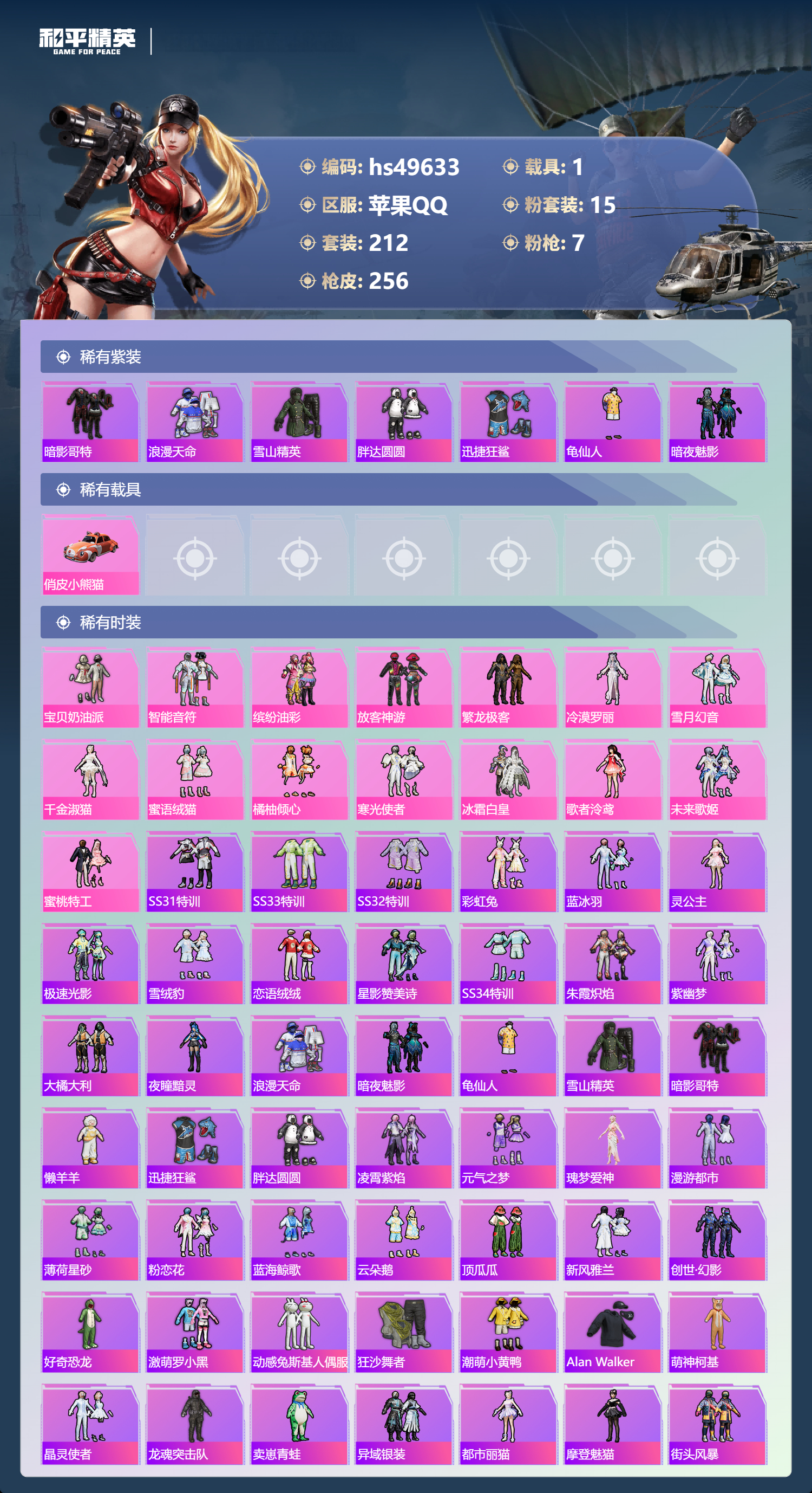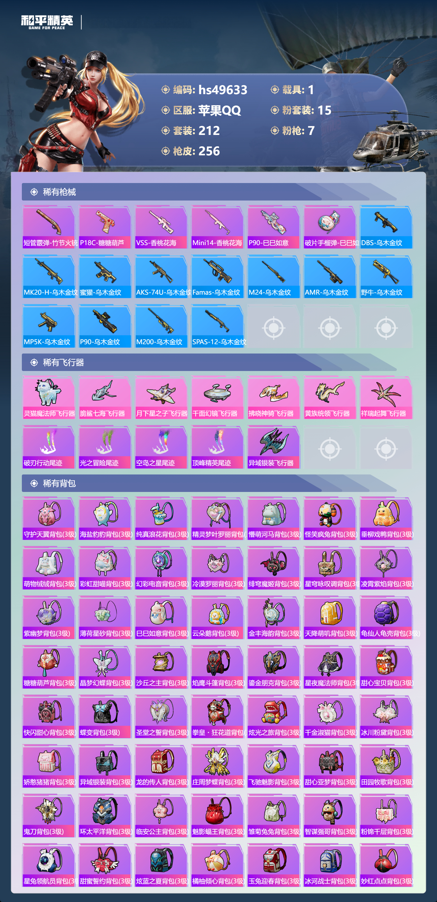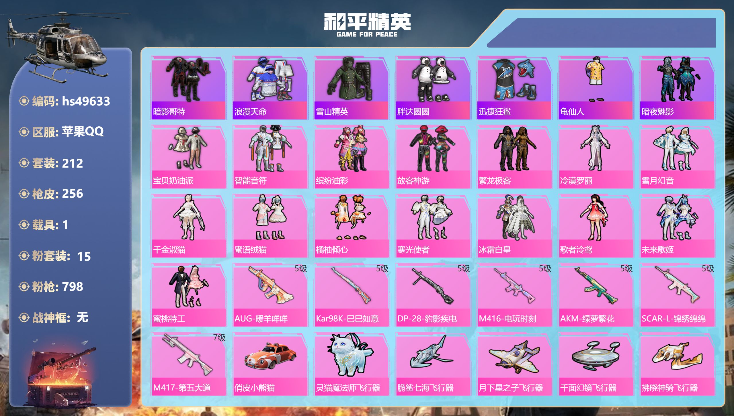 【65965】【不可二次】【苹果QQ】龟仙人 AKM-绿萝繁花 漫步者 拂晓神骑飞行器 极速红龙 M416-电玩时刻 俏皮小熊猫 放客神游 缤纷油彩 智能音符 激萌小黄鸭 浪漫天命 激萌罗小黑 胖达圆圆 迅捷狂鲨 暗夜契约 萌神柯基 潮萌小黄鸭 千面幻镜飞行器 M417射手步枪 狂沙舞者 黄族统领飞行器 诡面顽熊 SCAR-L-锦绣绵绵 繁龙极客 蜜桃特工 宝贝奶油派 M417-第五大道 暗影哥