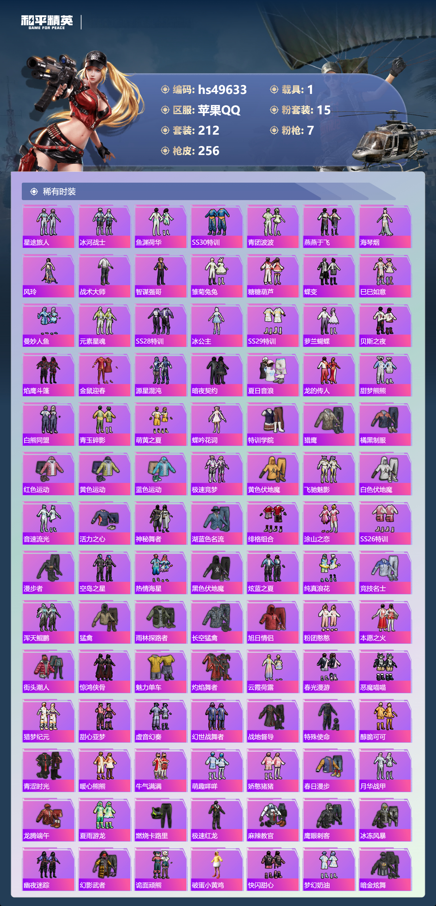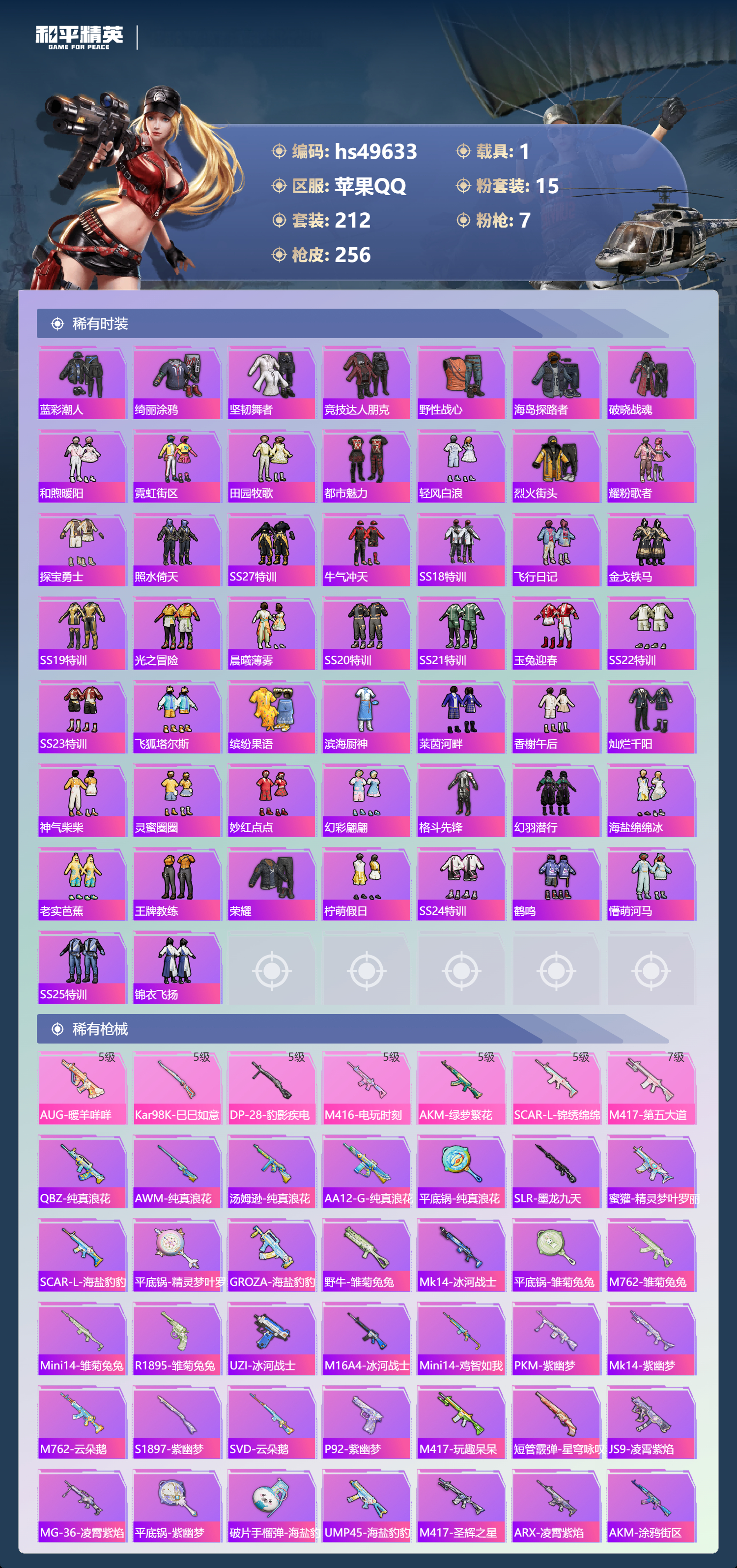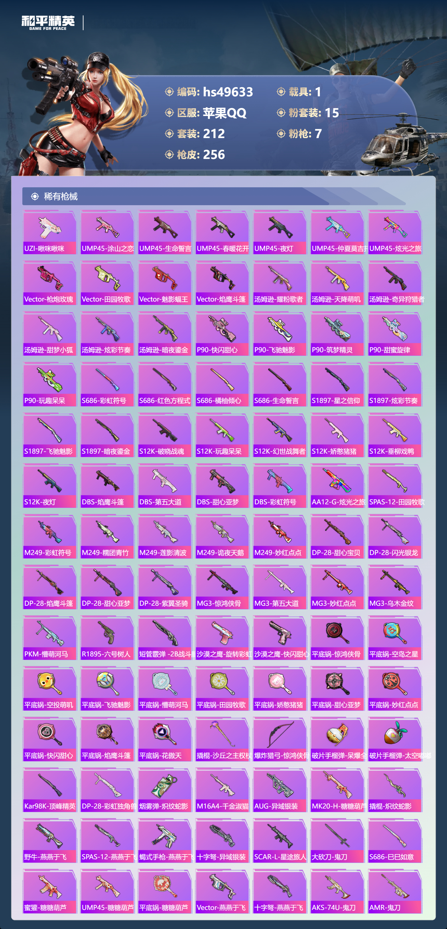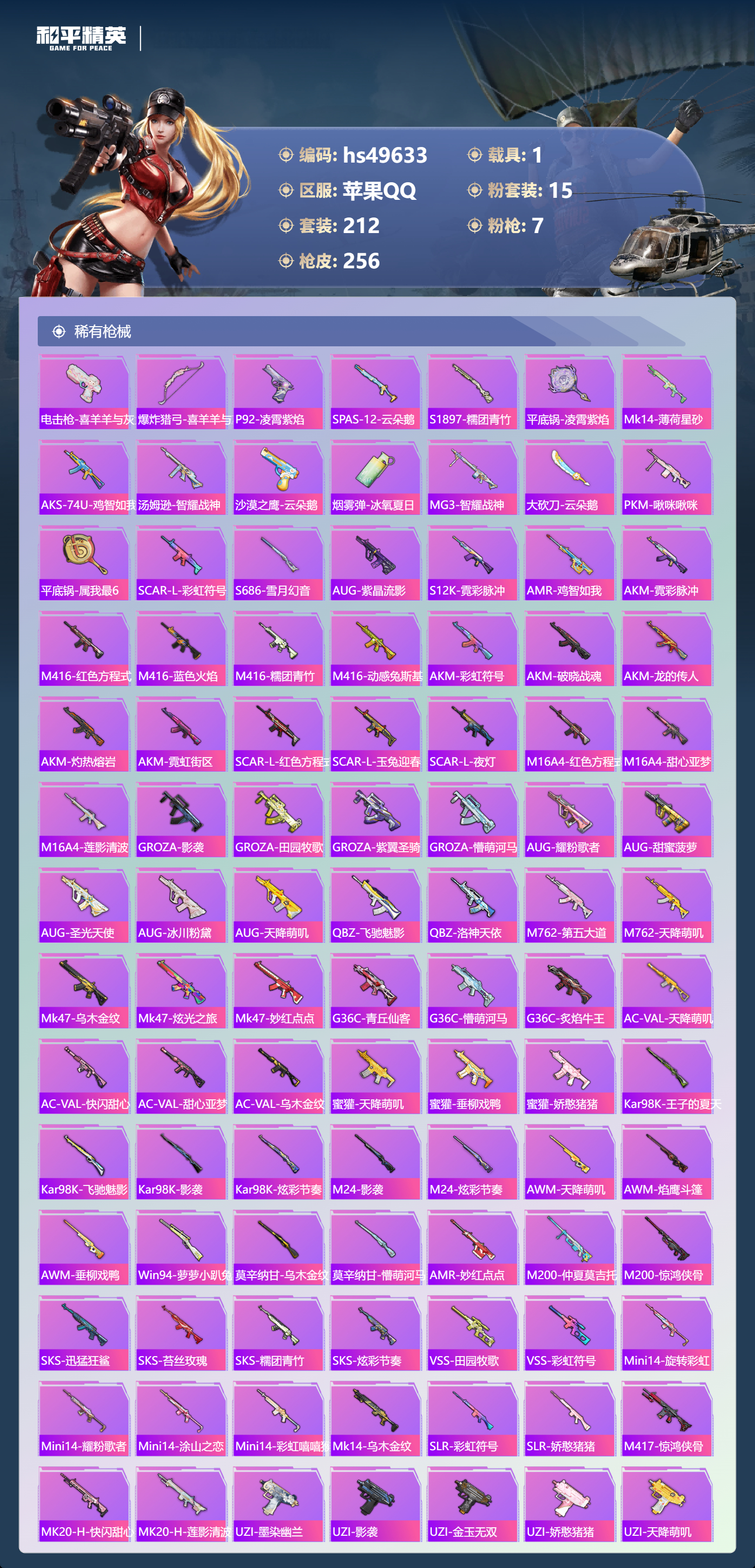 【65965】【不可二次】【苹果QQ】龟仙人 AKM-绿萝繁花 漫步者 拂晓神骑飞行器 极速红龙 M416-电玩时刻 俏皮小熊猫 放客神游 缤纷油彩 智能音符 激萌小黄鸭 浪漫天命 激萌罗小黑 胖达圆圆 迅捷狂鲨 暗夜契约 萌神柯基 潮萌小黄鸭 千面幻镜飞行器 M417射手步枪 狂沙舞者 黄族统领飞行器 诡面顽熊 SCAR-L-锦绣绵绵 繁龙极客 蜜桃特工 宝贝奶油派 M417-第五大道 暗影哥