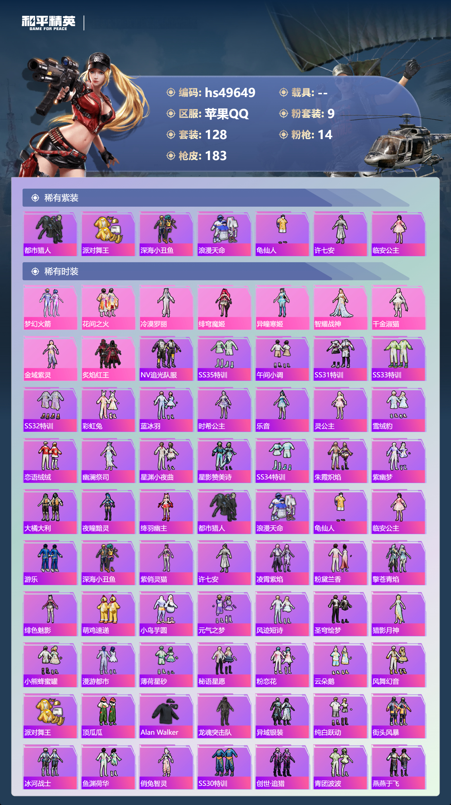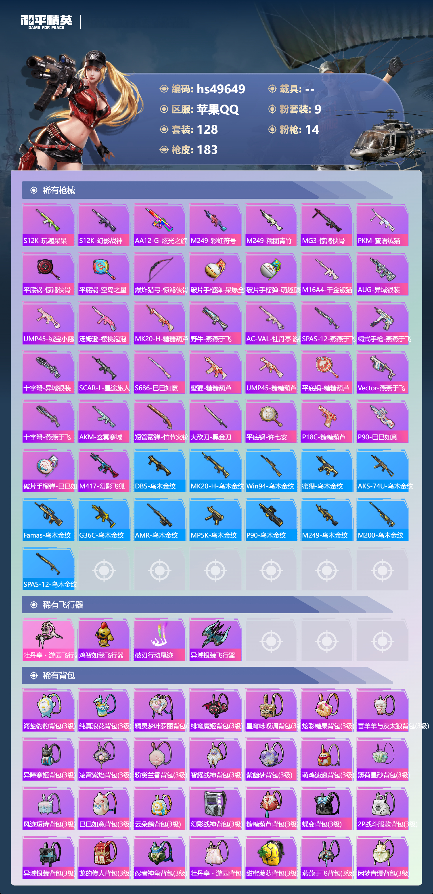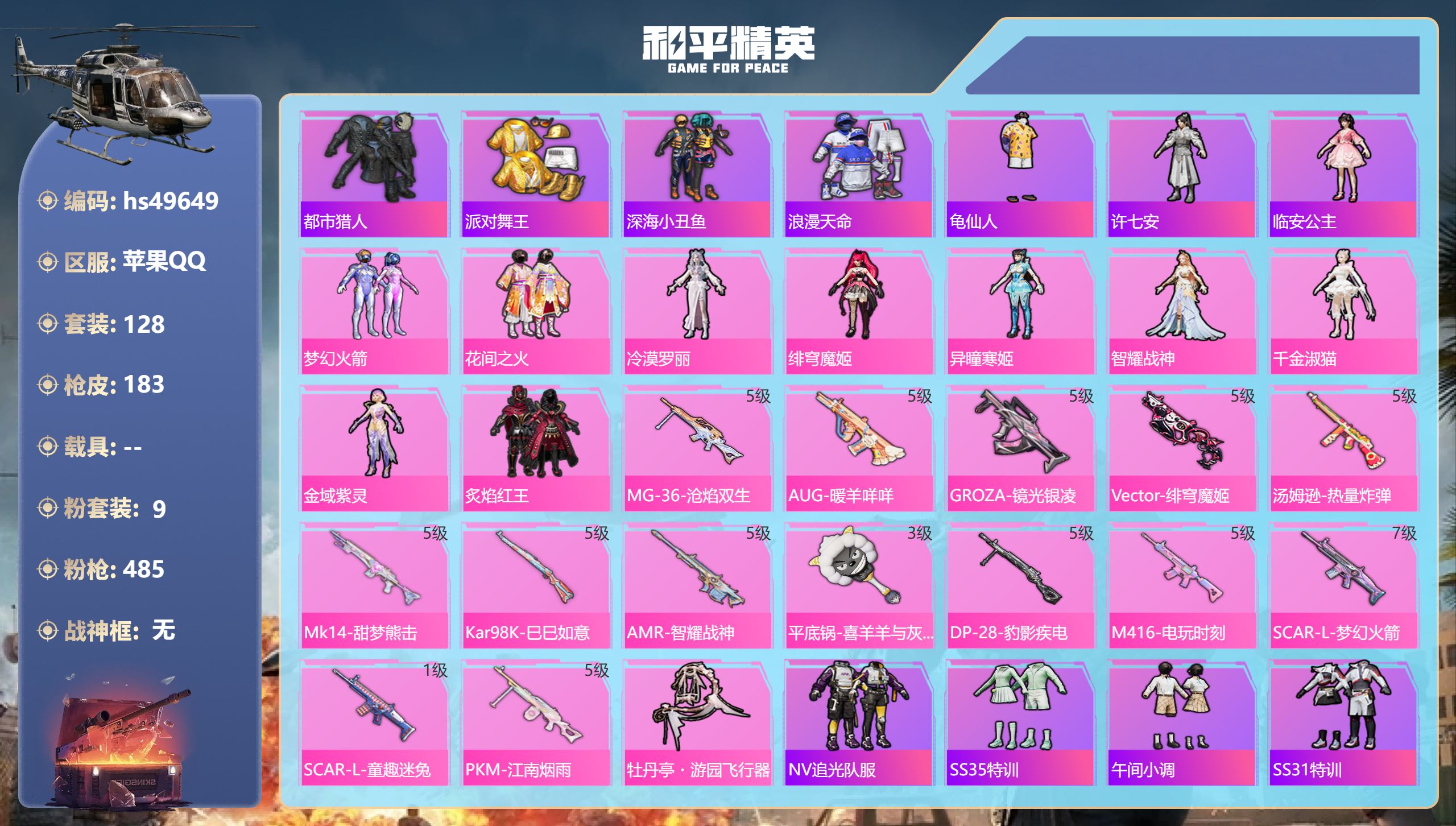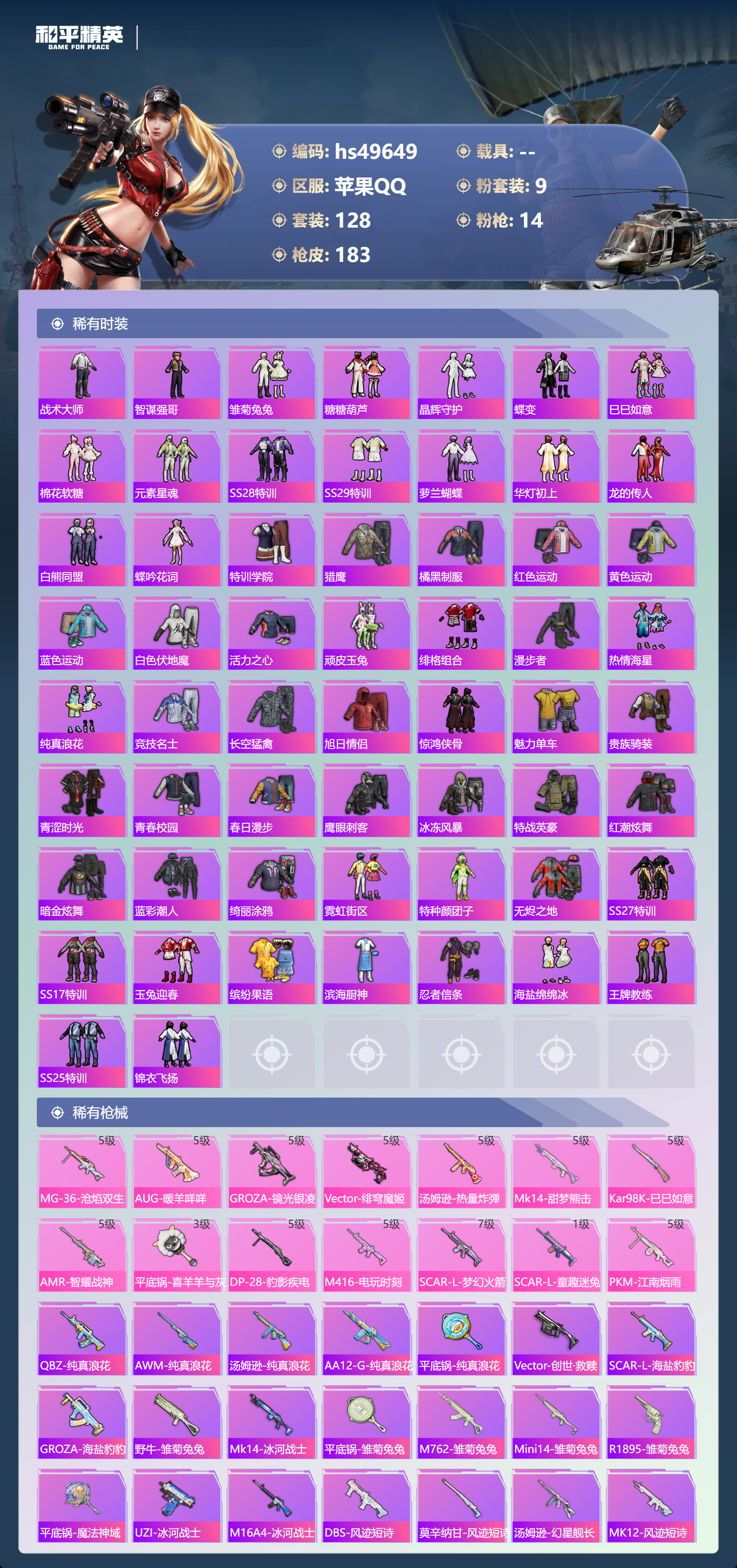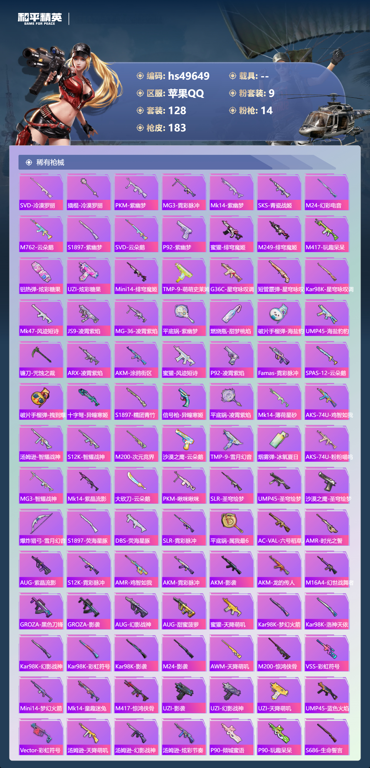【65980】【不可二次】【苹果QQ】SCAR-L-梦幻火箭 龟仙人 漫步者 花间之火 都市猎人 炙焰红王 PKM-江南烟雨 SCAR-L梦幻火箭 忍者信条 M416-电玩时刻 梦幻火箭 深海小丑鱼 SCAR-童趣迷兔 派对舞王 浪漫天命