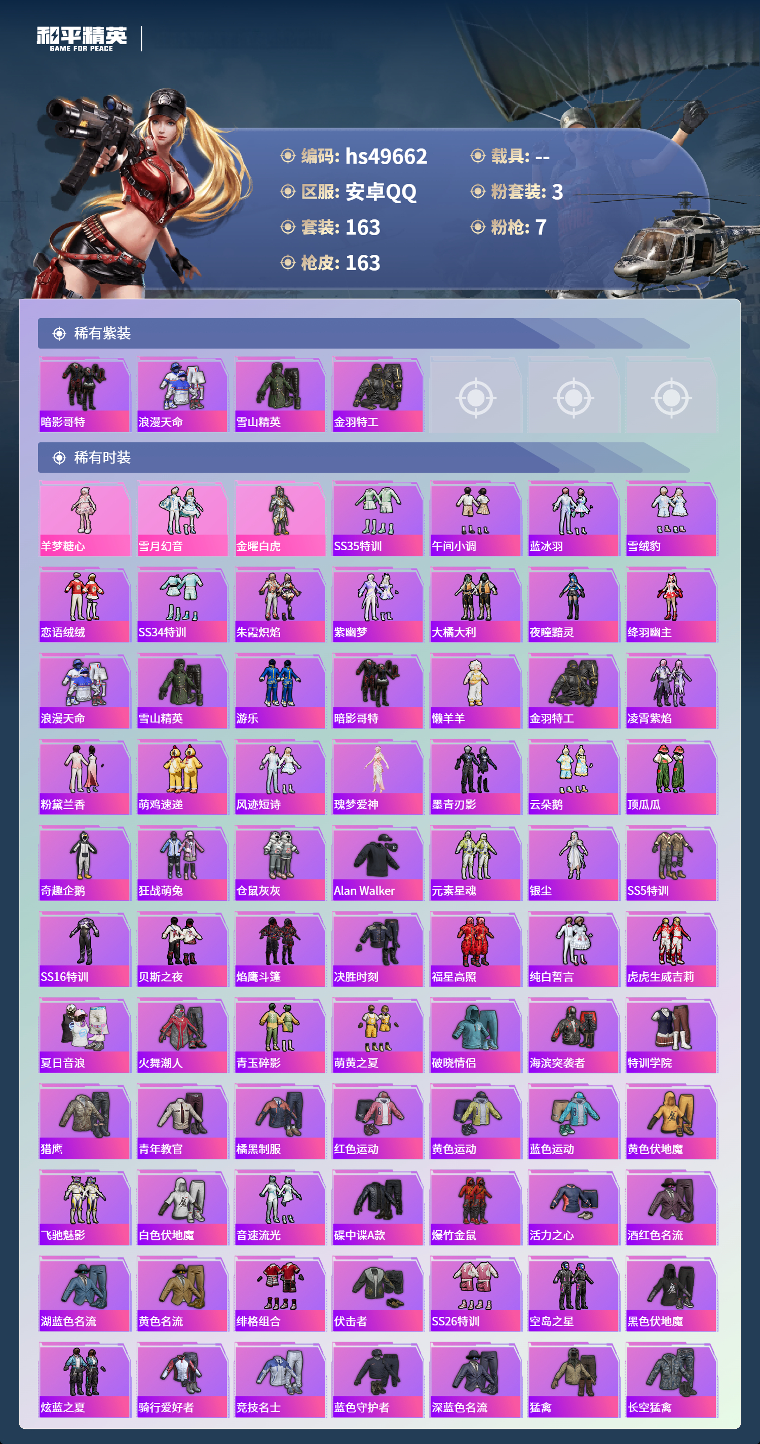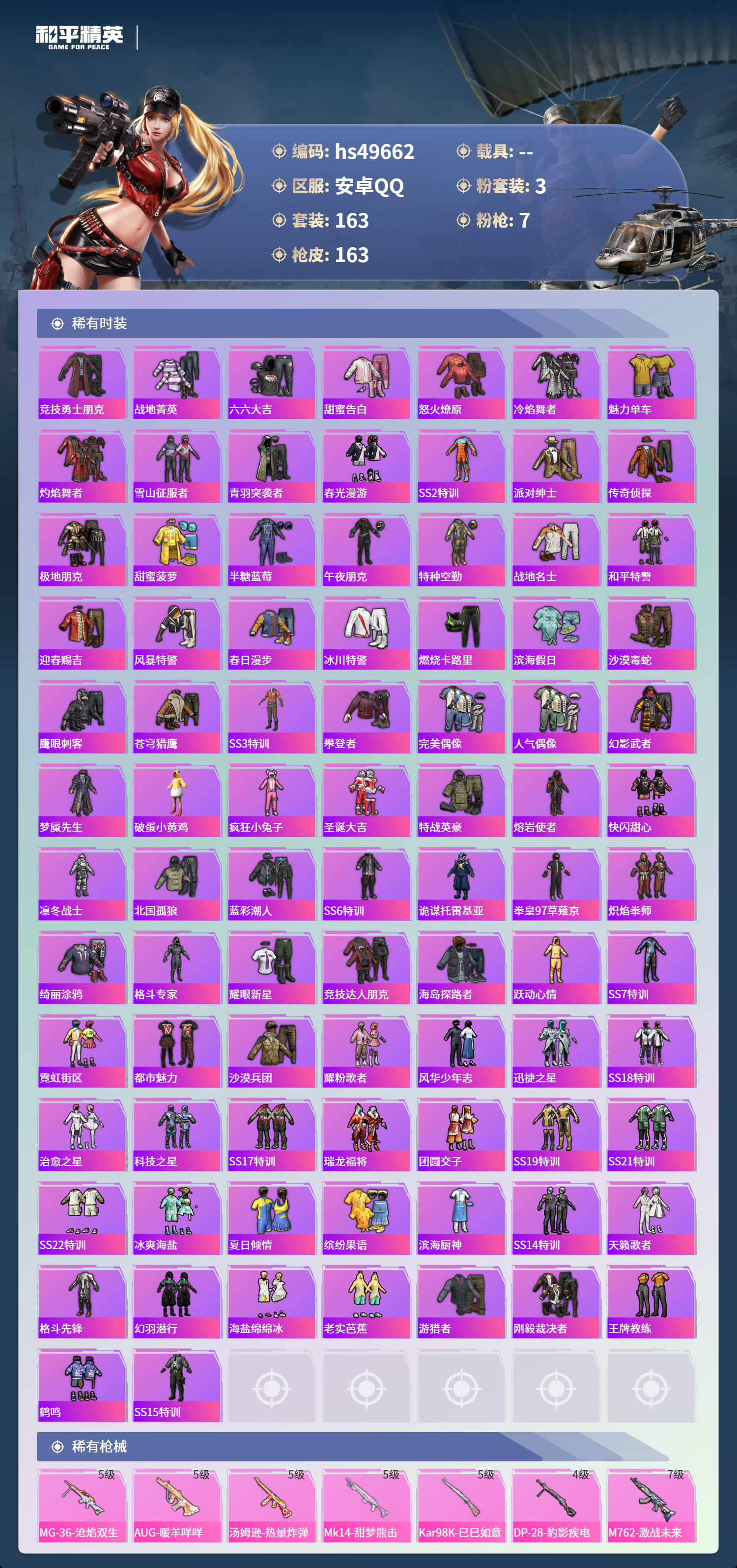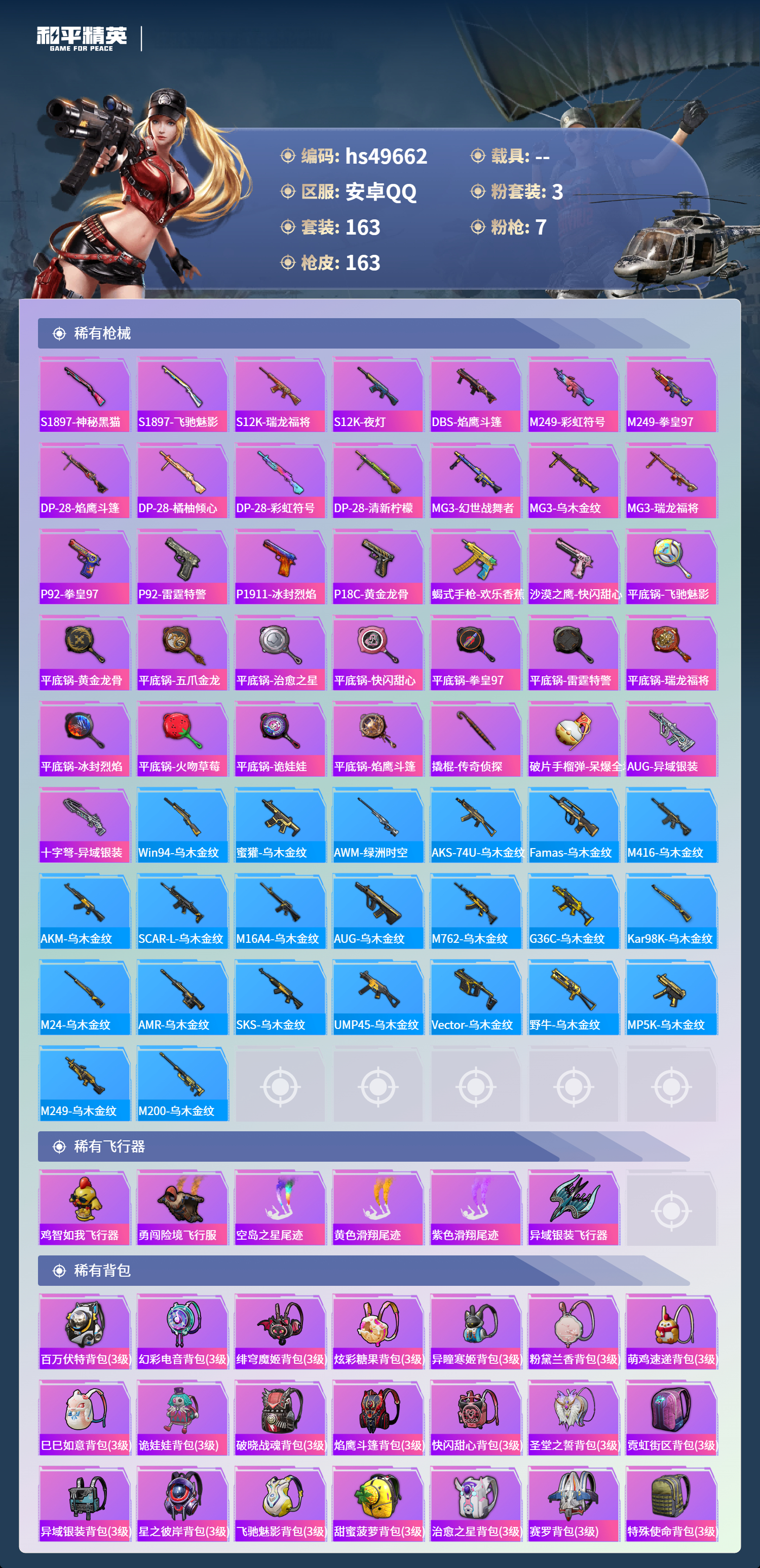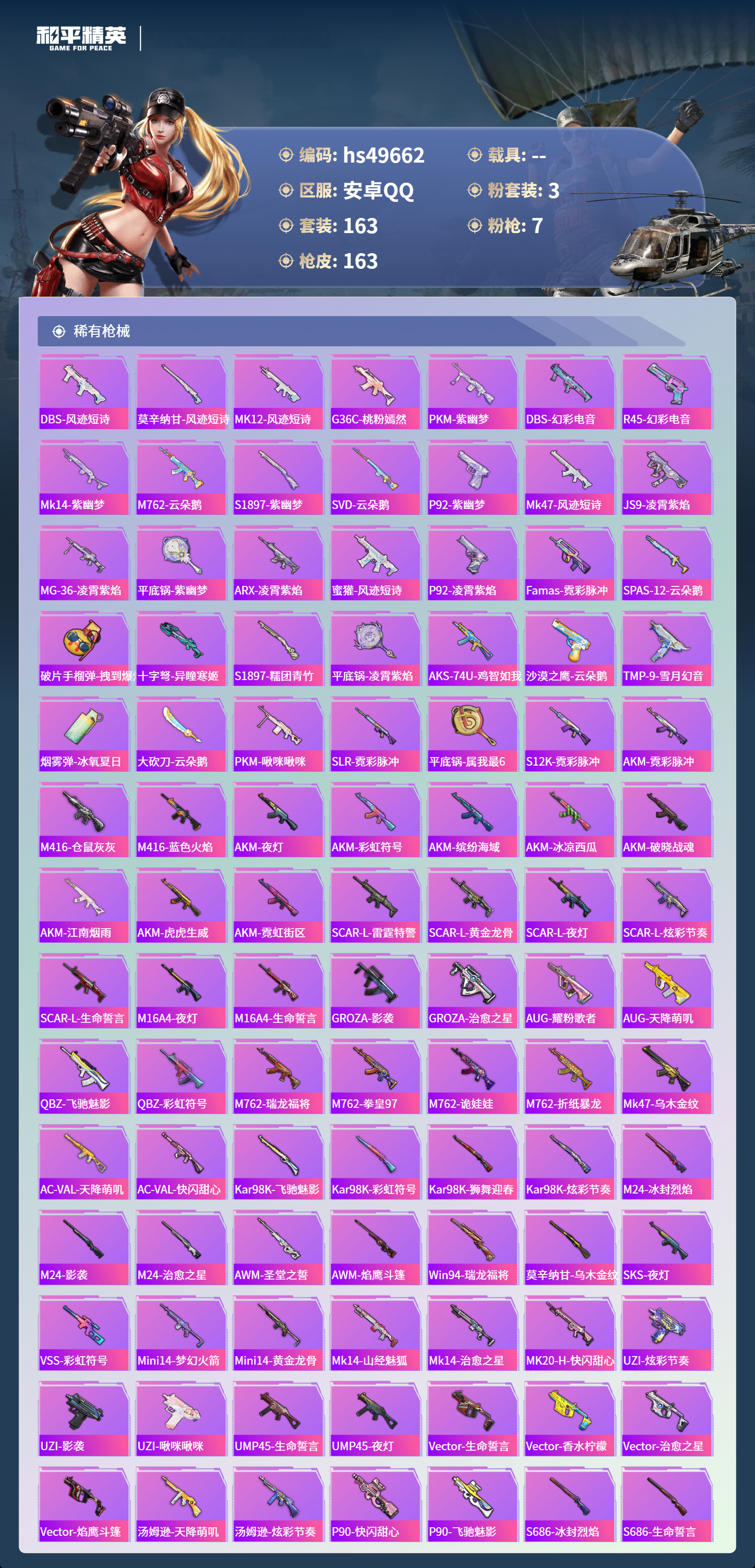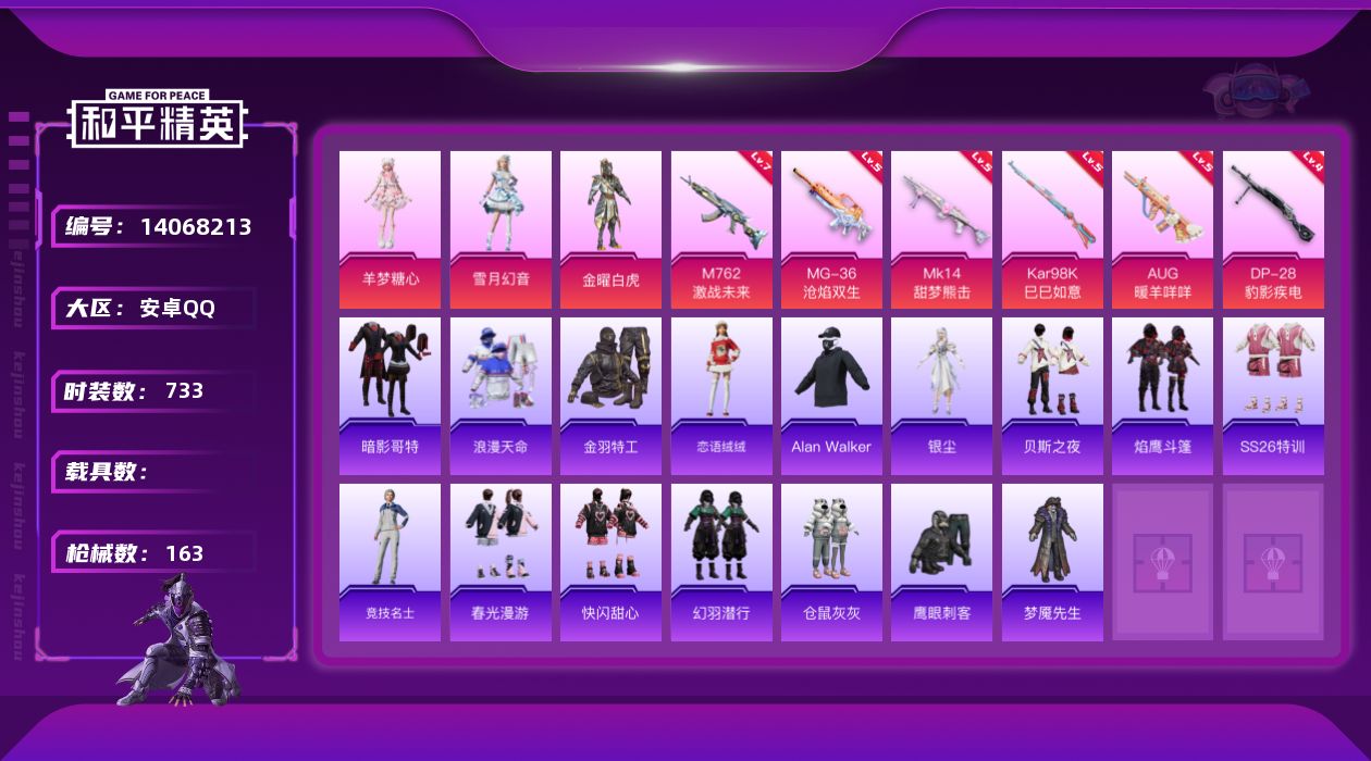 【66009】【不可二次】【安卓QQ】金曜白虎 M762-激战未来 M762-瑞龙福将 金羽特工 仓鼠灰灰 M416-仓鼠灰灰 AKM-缤纷海域 金耀白虎 瑞龙福将 风华少年志 浪漫天命 暗影哥特 雪山精英 纯白誓言 团圆交子