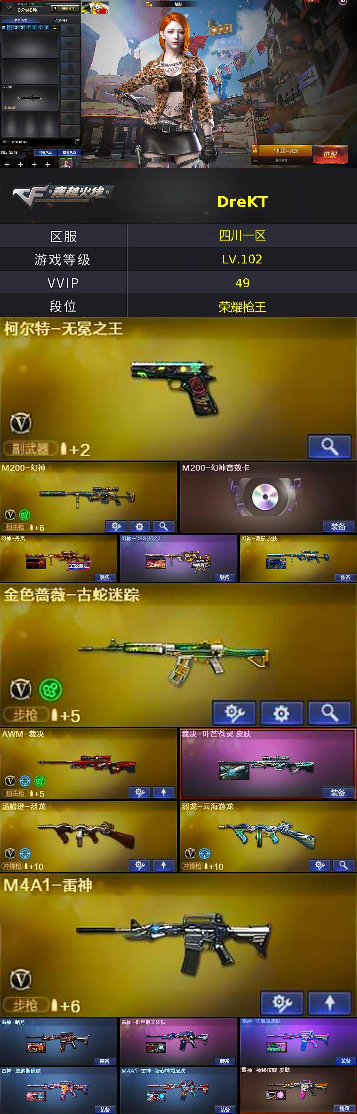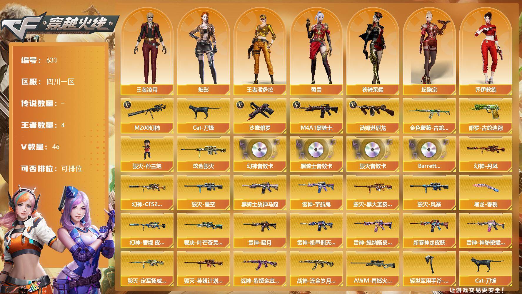 【65981】四川一区-46V-4王者-1炫金【热门武器】:M200-幻神,金色蔷薇-古蛇迷踪,修罗-古蛇迷踪,Cat-刀锋,M4A1-黑骑士,汤姆逊-烈龙,毁灭-孙三炮,沙鹰-修罗*2【王者炫金武器】:炫金毁灭【音效卡】:M200-幻神音效卡,M4A1-黑骑士音效卡,Barrett-毁灭音效卡,Barrett-碧霄极光音效卡【皮肤】:幻神-丹凤,幻神-CFS2022,幻神-曹操 皮肤,裁决-叶