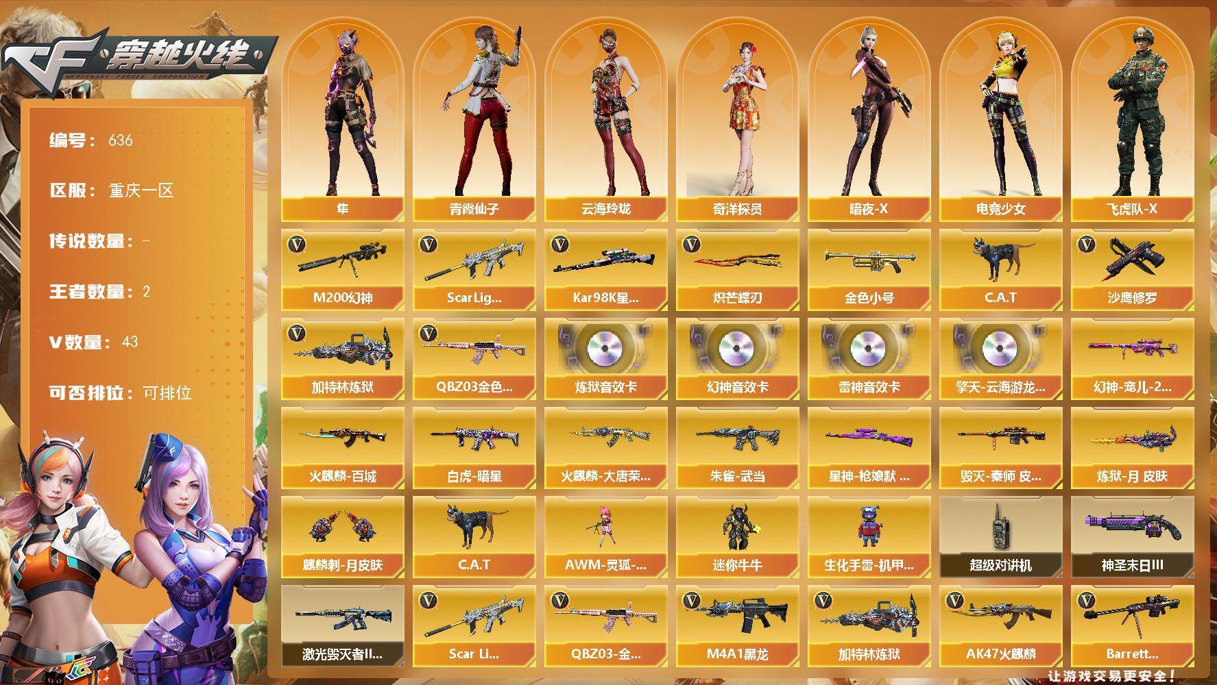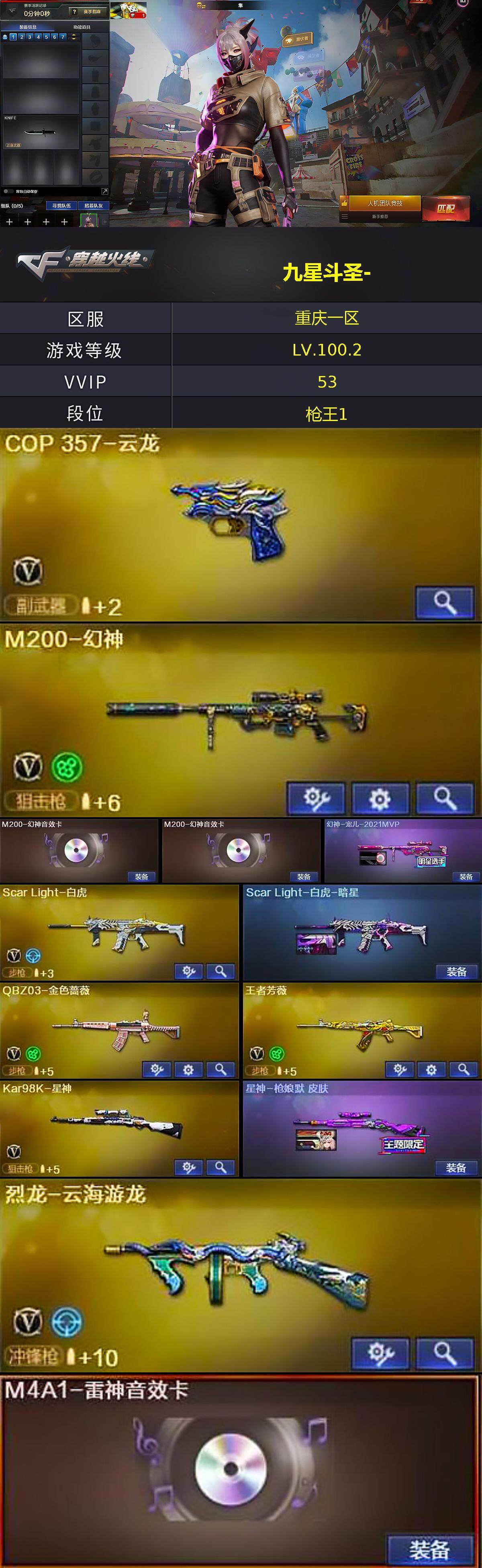 【66045】重庆一区-43V-2王者-0炫金【热门武器】:QBZ03-金色蔷薇,Scar Light-白虎,M200-幻神,Kar98K-星神,金色小号,C.A.T,加特林-炼狱,沙鹰-修罗*2,炽芒蝶刃【音效卡】:擎天-云海游龙音效卡,M200-幻神音效卡*2,M4A1-雷神音效卡,加特林-炼狱音效卡【皮肤】:幻神-宠儿-2021MVP,Scar Light-白虎-暗星,星神-枪娘默 皮肤,