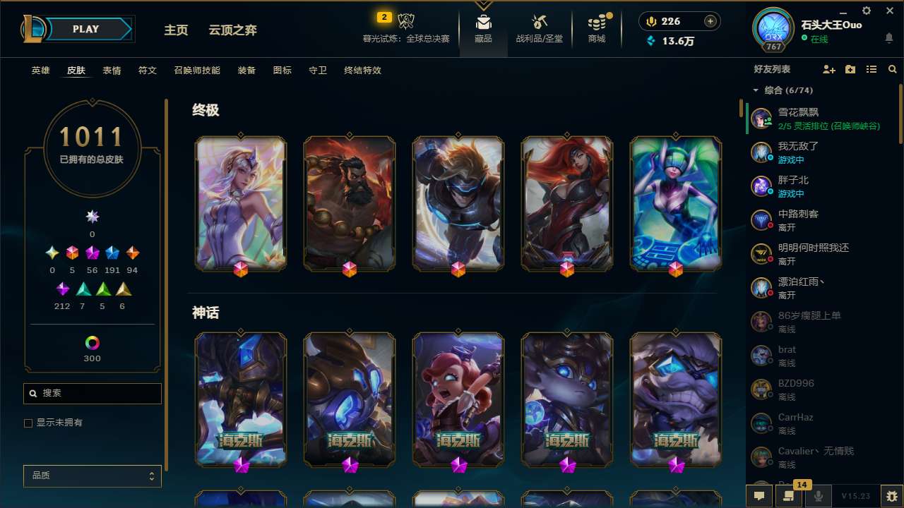 【66050】[14068439]t31077【艾欧尼亚】原皮龙瞎 1011皮肤 355炫彩 37臻彩 56神话/191限定/94传说/172英雄 账号等级:767 云顶神话:1 单双排段位:翡翠【重要头像】星守阿狸 爱意绵绵 爱情鸽 爱情之歌 心型钥匙 觅心游侠卢锡安 觅心之翼奎因 拓蛙 大家伙 最佳宠物 周年男刀图标 春晖神女拉克丝 寒格薇 黎明使者卡尔玛 阿兰