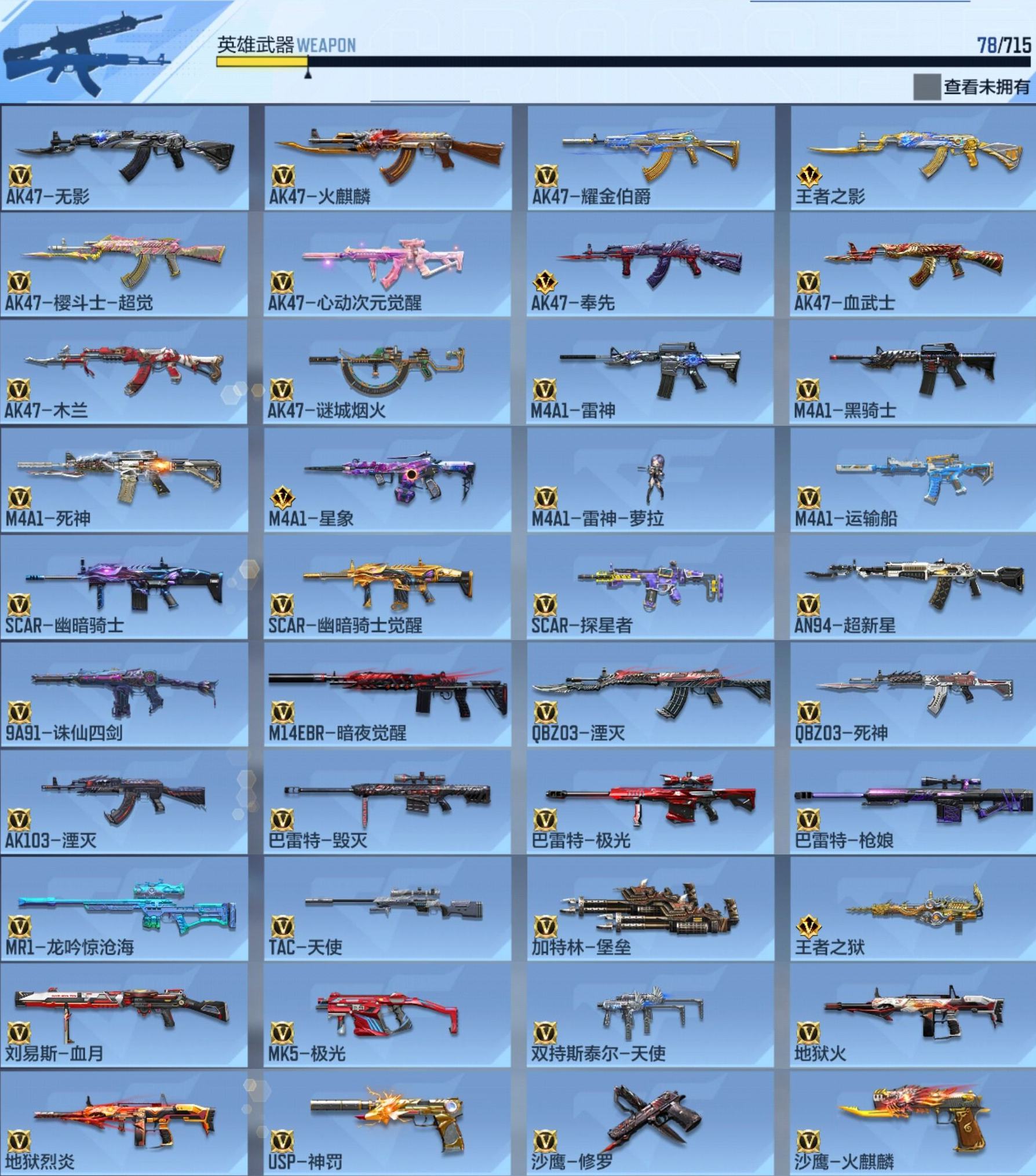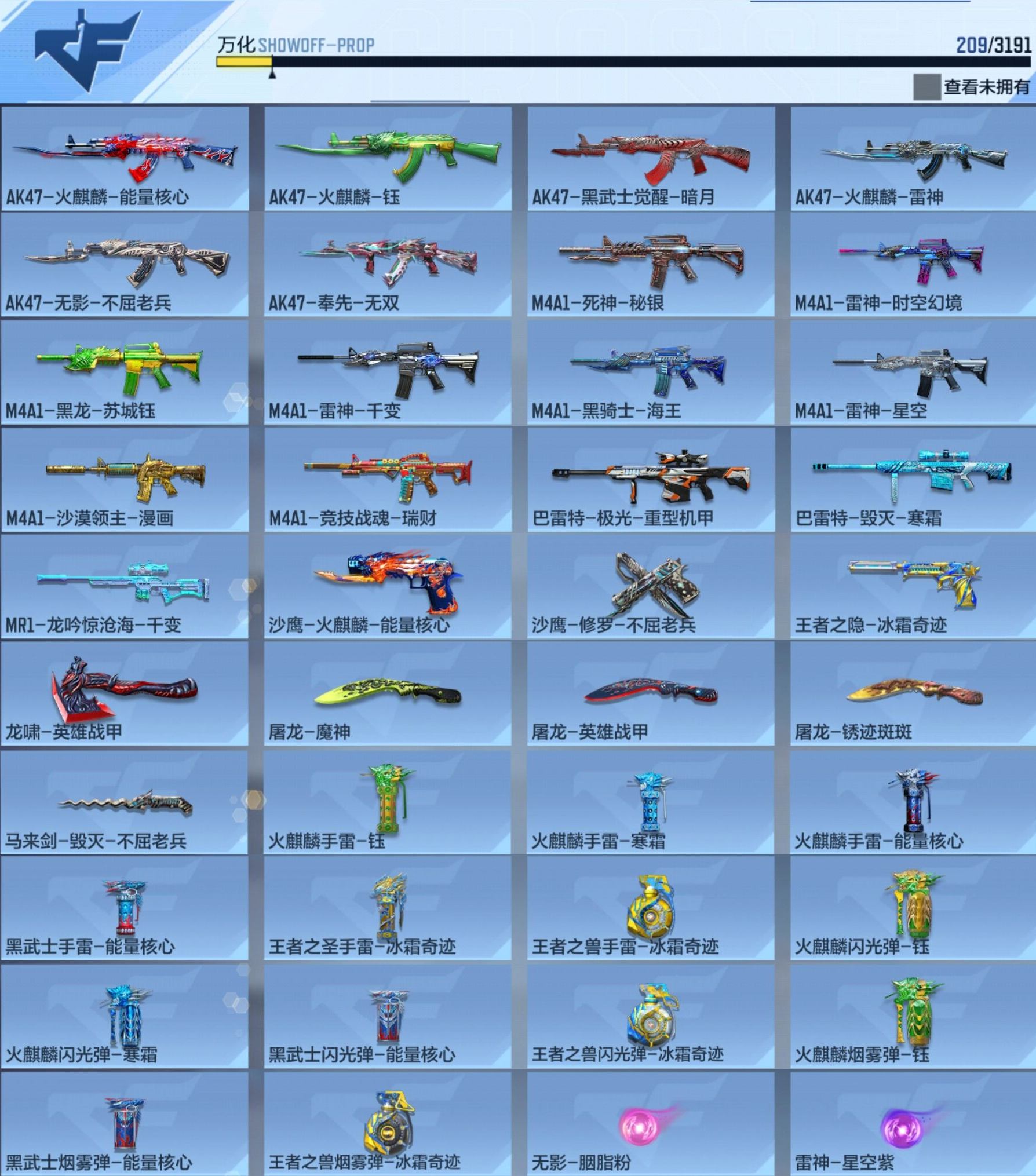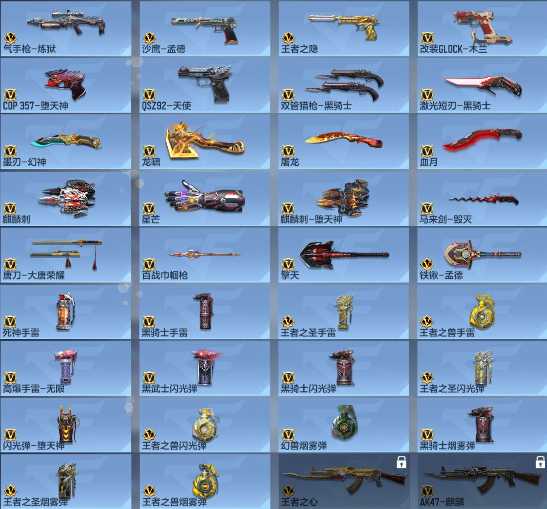 【66185】[14068944]x462 VIP7,王者武器9,英雄级武器78,万化209,角色21 【王者武器】:王者之影/王者之狱/王者之隐/王者之圣手雷/王者之兽手雷/王者之兽闪光弹/王者之圣闪光弹/王者之兽烟雾弹/王者之圣烟雾弹 ;【热门皮肤】:M4A1-死神-秘银/火麒麟闪光弹-寒霜/屠龙-英雄战甲/AK47-火麒麟-雷神/AK47-黑武士觉醒-暗月/M4A1-沙漠领主-漫画/黑武士