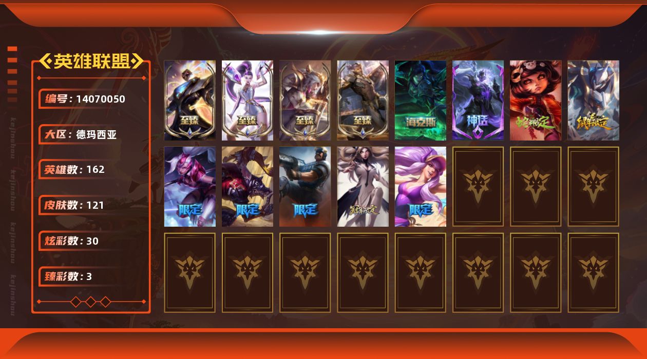 【66420】[14070050]t31055【德玛西亚】 121皮肤 30炫彩 3臻彩 8神话/17限定/17传说/162英雄 账号等级:321【重要头像】云顶古琴娑娜 两仪无极 我麦是开的么 KDA卡莎BAEST KDA卡莎 魄罗宇航员 女帝卡特琳娜 女帝卡特琳娜炫彩 不错哦 至臻女帝黛安娜 至臻KDA卡莎 灰烬慎头像 【重要皮肤】女帝黛安娜至臻 源计划逆流塞拉斯至