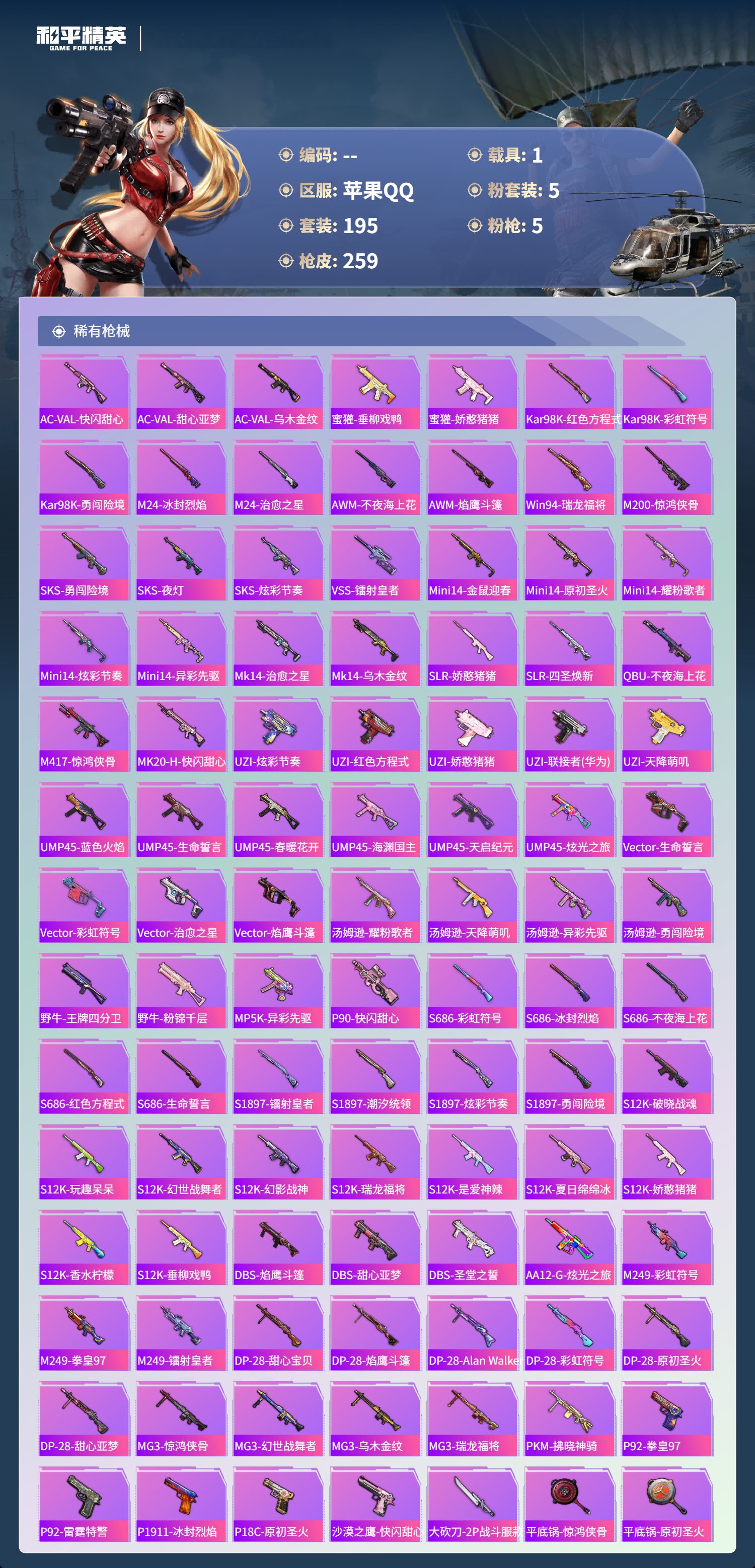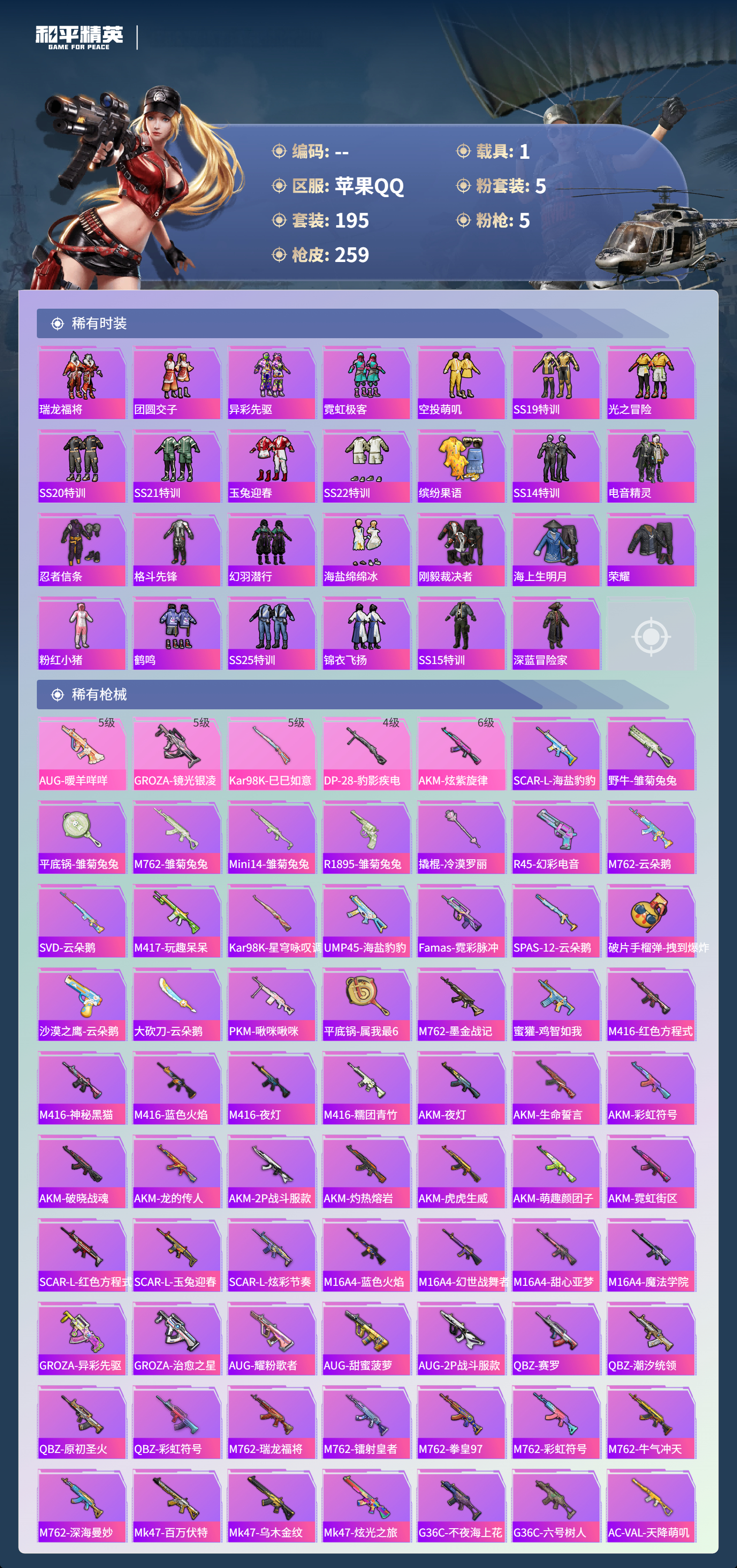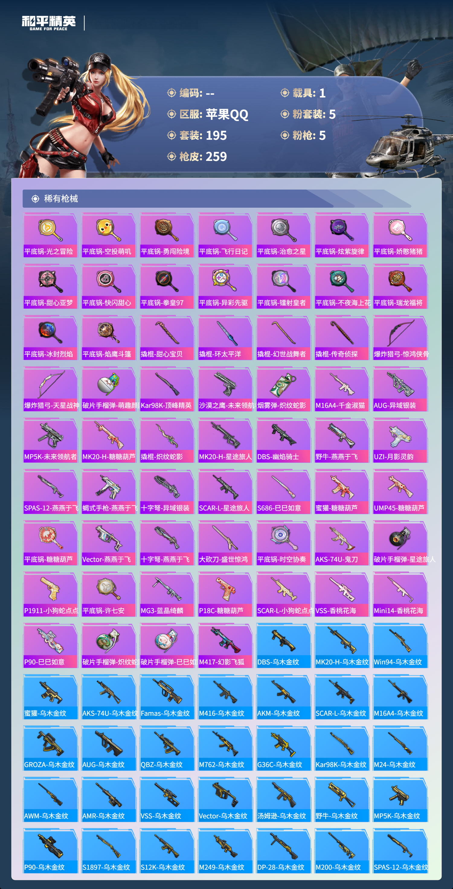 【66435】【不可二次】【苹果QQ】大橘为重 奇异狩猎者 M762-瑞龙福将 极速红龙 忍者信条 AKM-炫紫旋律 白月香洋装 太空嘟嘟飞行器 粉红小猪 幻影战神 瑞龙福将 风华少年志 雪山精英 团圆交子