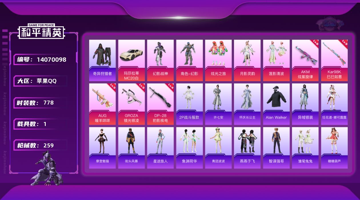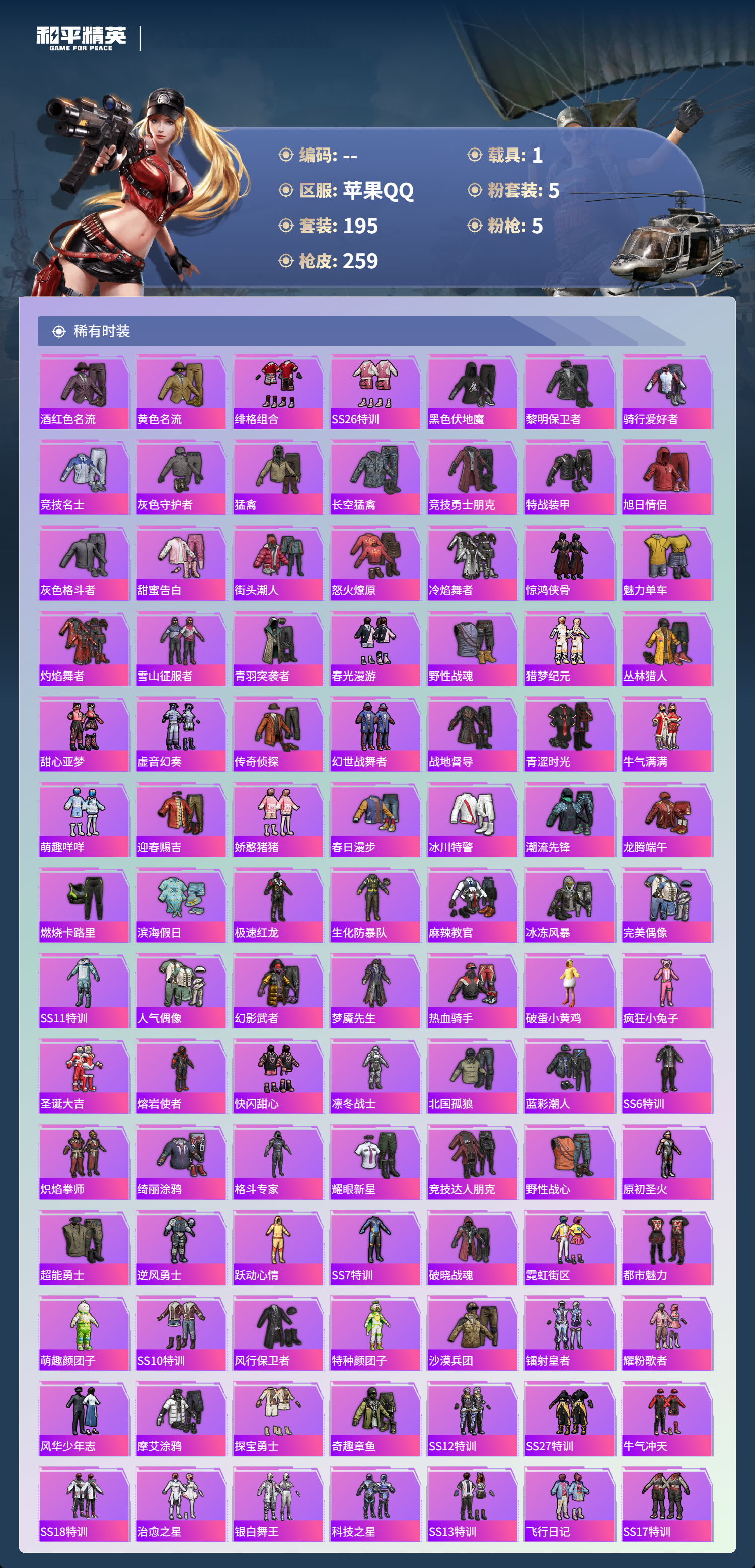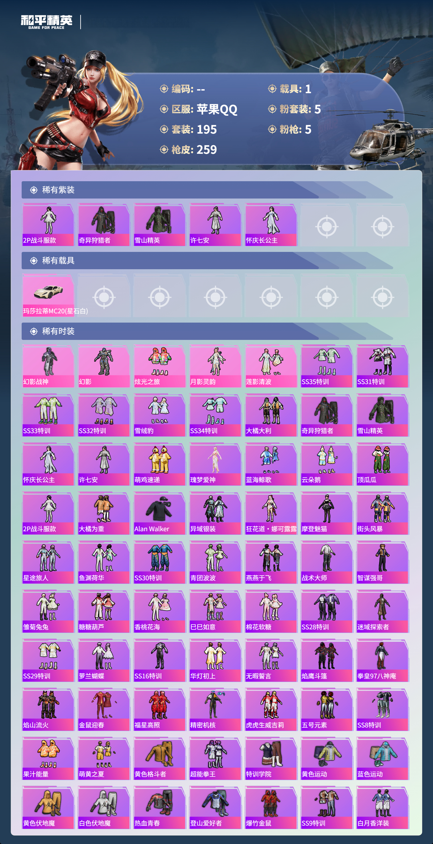 【66435】【不可二次】【苹果QQ】大橘为重 奇异狩猎者 M762-瑞龙福将 极速红龙 忍者信条 AKM-炫紫旋律 白月香洋装 太空嘟嘟飞行器 粉红小猪 幻影战神 瑞龙福将 风华少年志 雪山精英 团圆交子