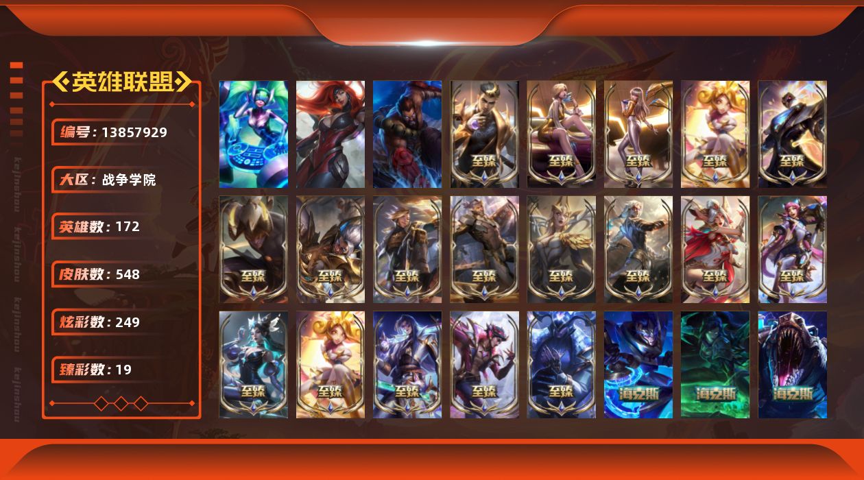 【66470】[13857929]t30614【战争学院】548皮肤 249炫彩 19臻彩 28神话/82限定/68传说/172英雄 账号等级:586 云顶神话:8 单双排段位:黄金 【重要头像】云顶战斗学院伊泽瑞尔 云顶古琴娑娜 爱意绵绵 爱情之歌 心型钥匙 雪花 救生圈 KDA卡莎BAEST KDA萨勒芬妮 幼犬沃里克 不错哦 【重要皮肤】永恒星灵佐伊至臻 莲华温泉