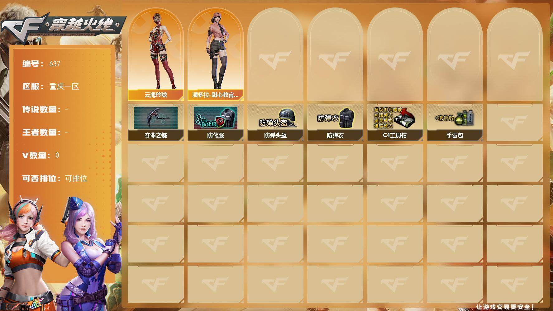 【66538】重庆一区-0V-0王者-0炫金【角色】:云海玲珑,潘多拉-甜心教官【道具】:夺命之镰,防化服,防弹头盔,防弹衣,C4工具钳,手雷包【特殊枪械】: