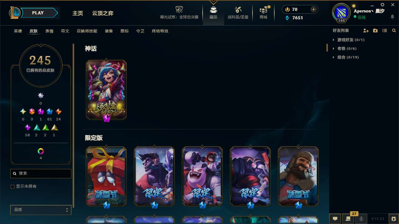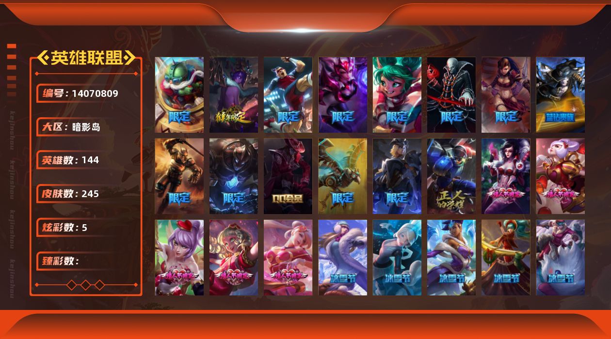 【66603】[14070809]t31057【暗影岛】 245皮肤 5炫彩 1神话/61限定/24传说/144英雄 账号等级:144【重要头像】小希 小斗 【重要皮肤】舞会公主安妮 钢铁军团拉克丝 生化领主泰达米尔 电玩女神阿狸 星之守护者伊泽瑞尔 银龙裁决泰隆 紫金罗刹莫甘娜 醒狮克格莫 甜心宝贝安妮 甜心宝贝娑娜 觅心魔灵奥莉安娜 觅心之翼奎因 觅心猎手薇恩