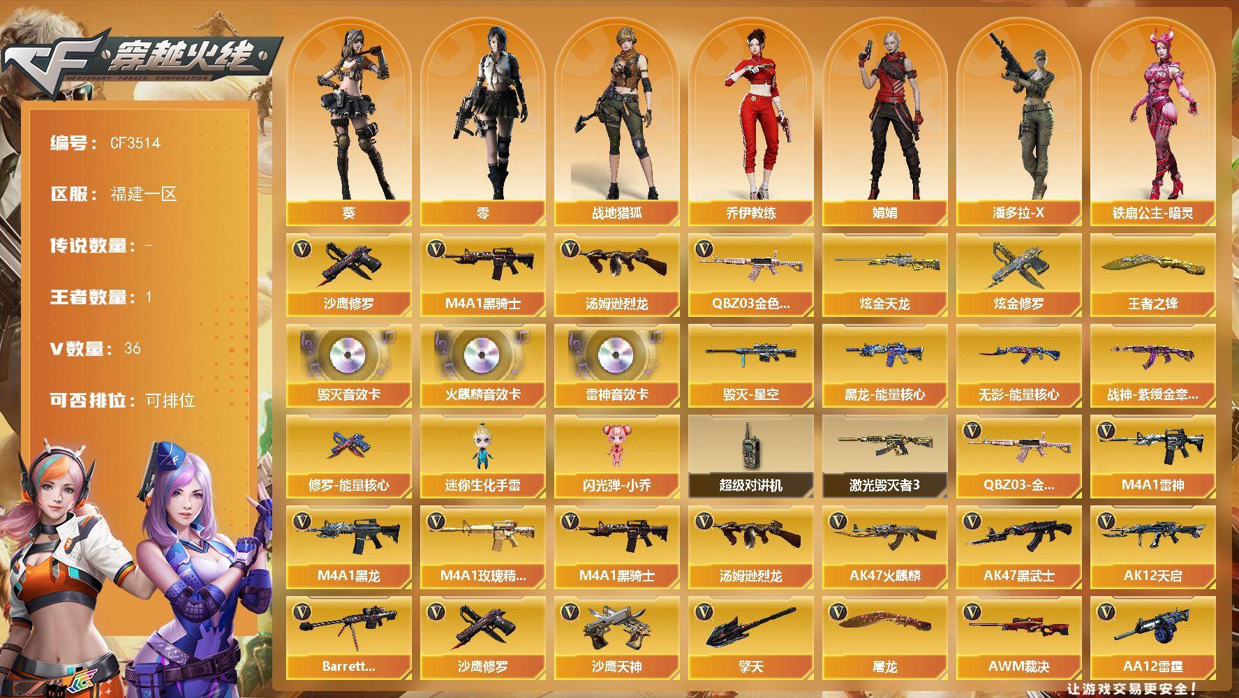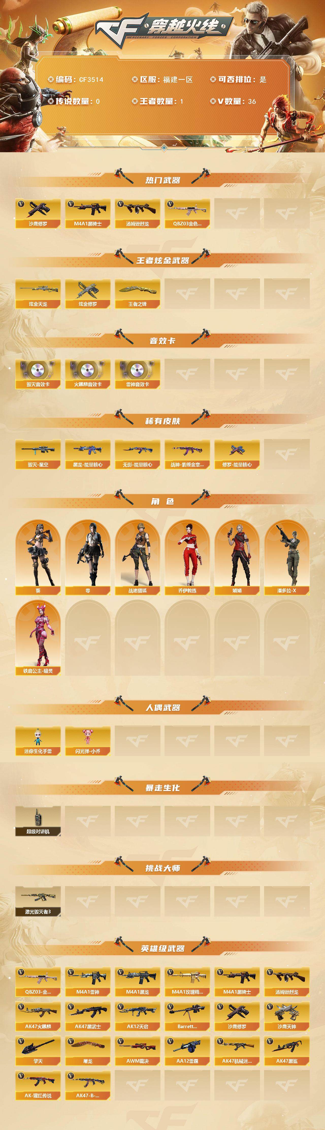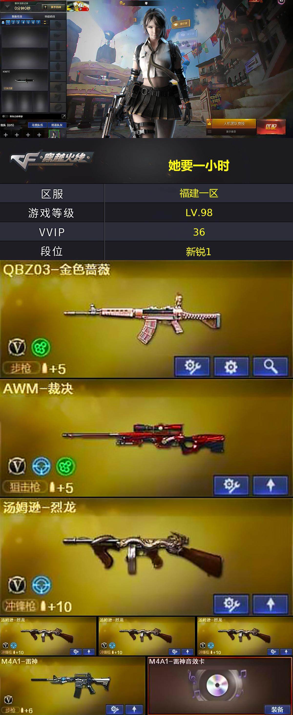 【66622】【66622】【CF3514】福建一区-36V-1王者-3炫金【双全号 QBZ03-金色蔷薇,M4A1-黑骑士,汤姆逊-烈龙*4,沙鹰-修罗】【