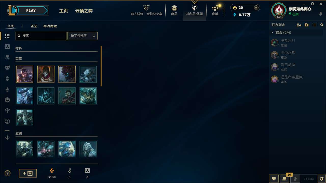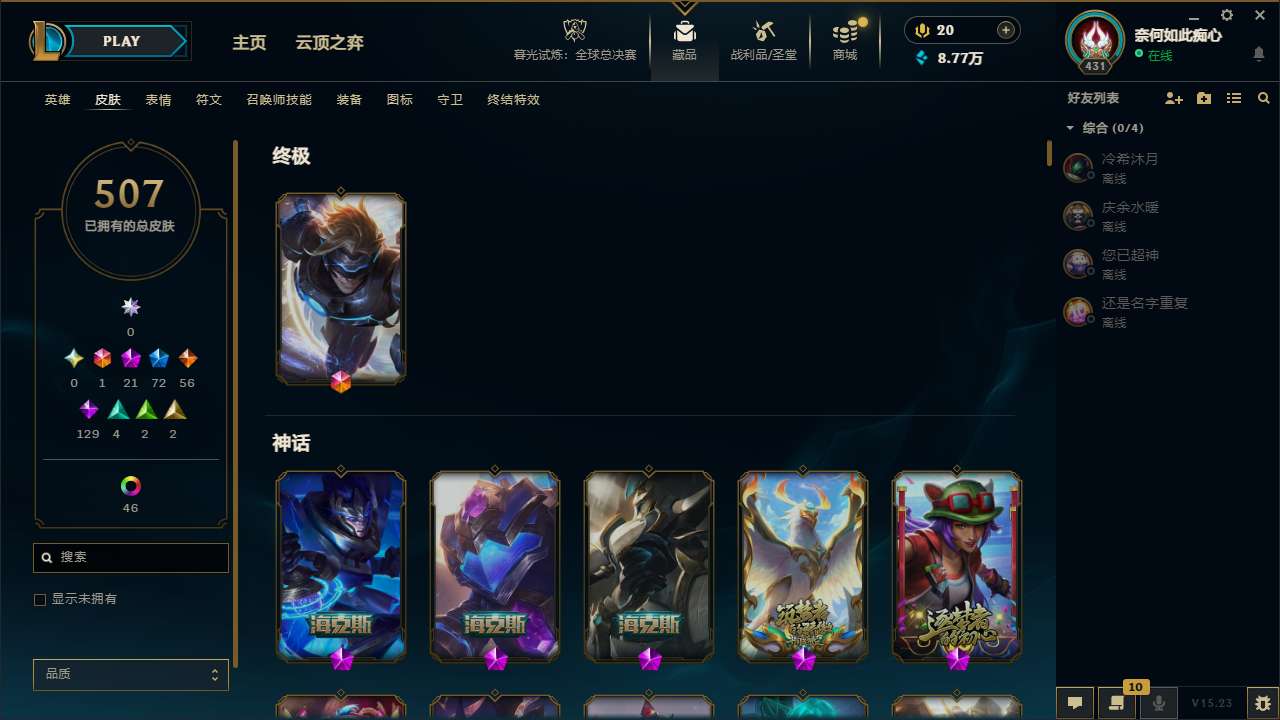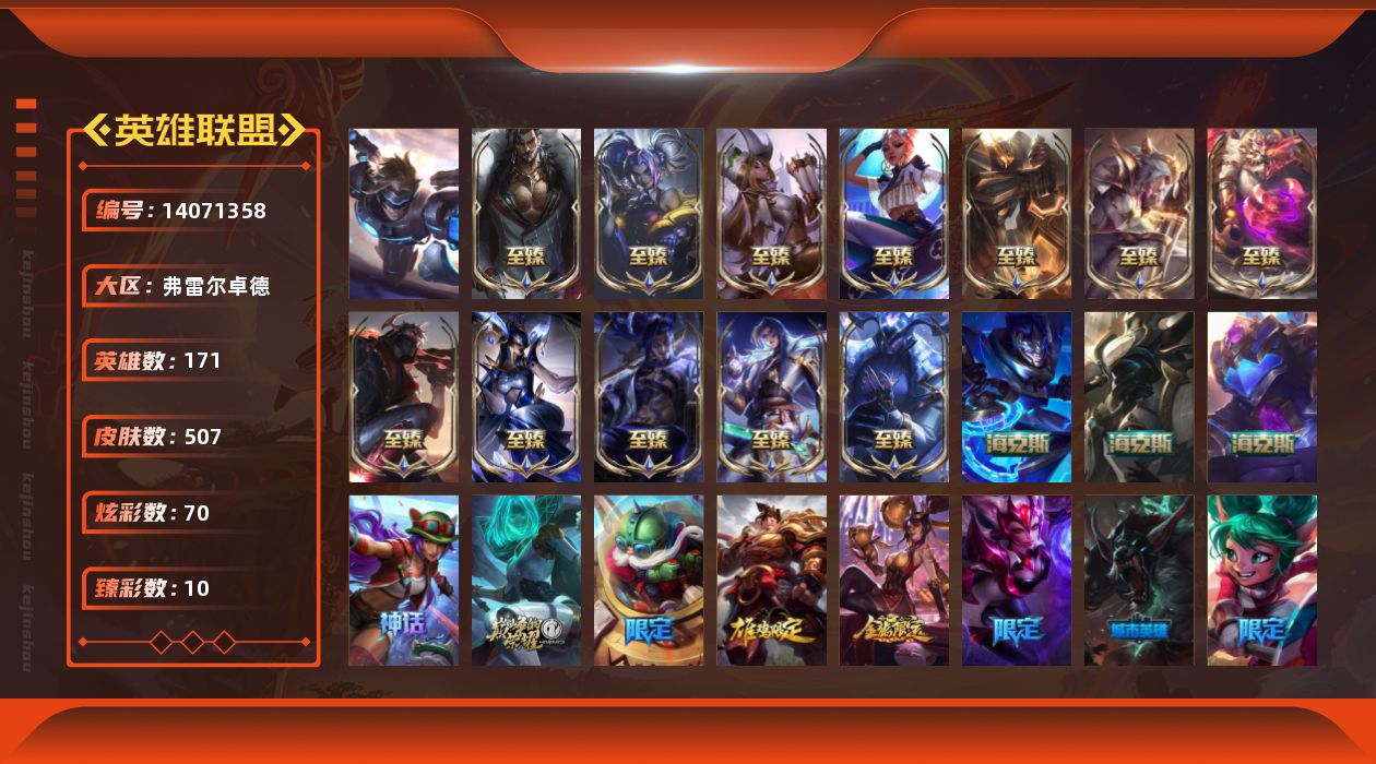 【66717】[14071358]t30786【弗雷尔卓德】原皮龙瞎 507皮肤 70炫彩 10臻彩 21神话/72限定/56传说/171英雄 账号等级:431 单双排段位:黄金【重要头像】云顶古琴娑娜 烈焰美人薇恩 披萨鸡 送披萨的小姐姐希维尔 至臻青花瓷丽桑卓 水晶圣骑艾希头 【重要皮肤】机神玄武盖伦至臻 狼神英灵斯维因至臻 魔域梦魇泽丽至臻 心之钢永恩至臻 DRX亚托克