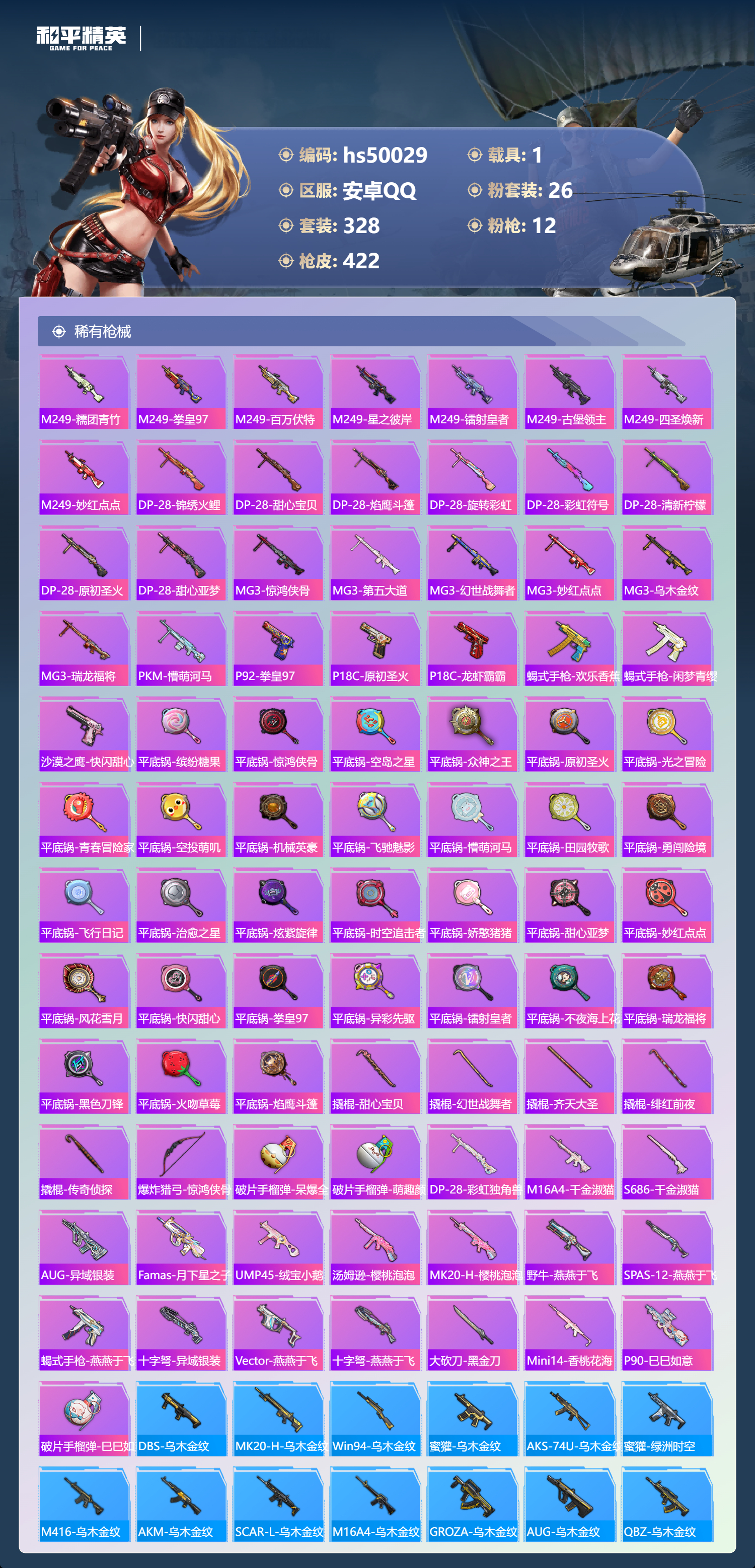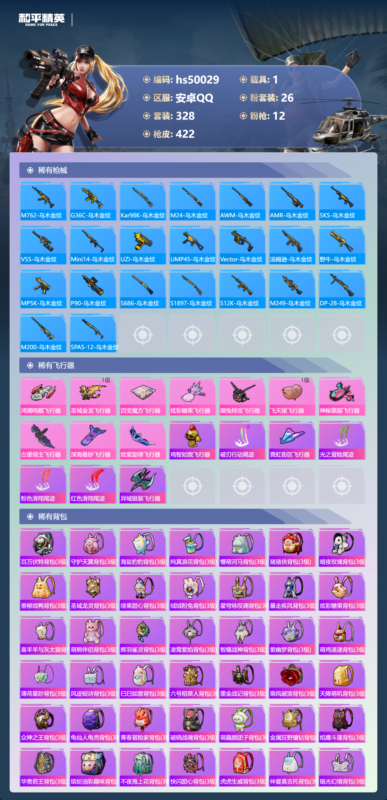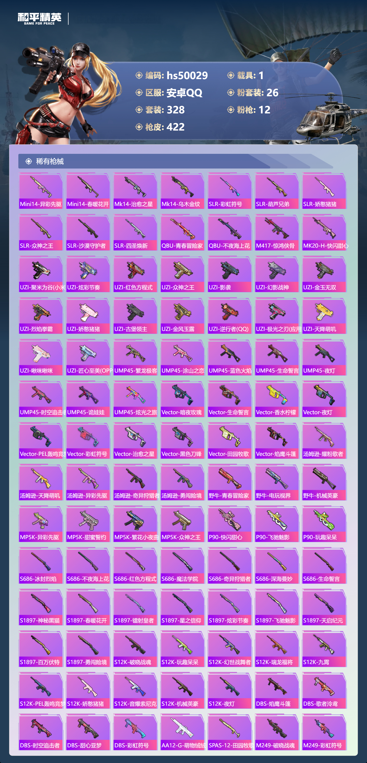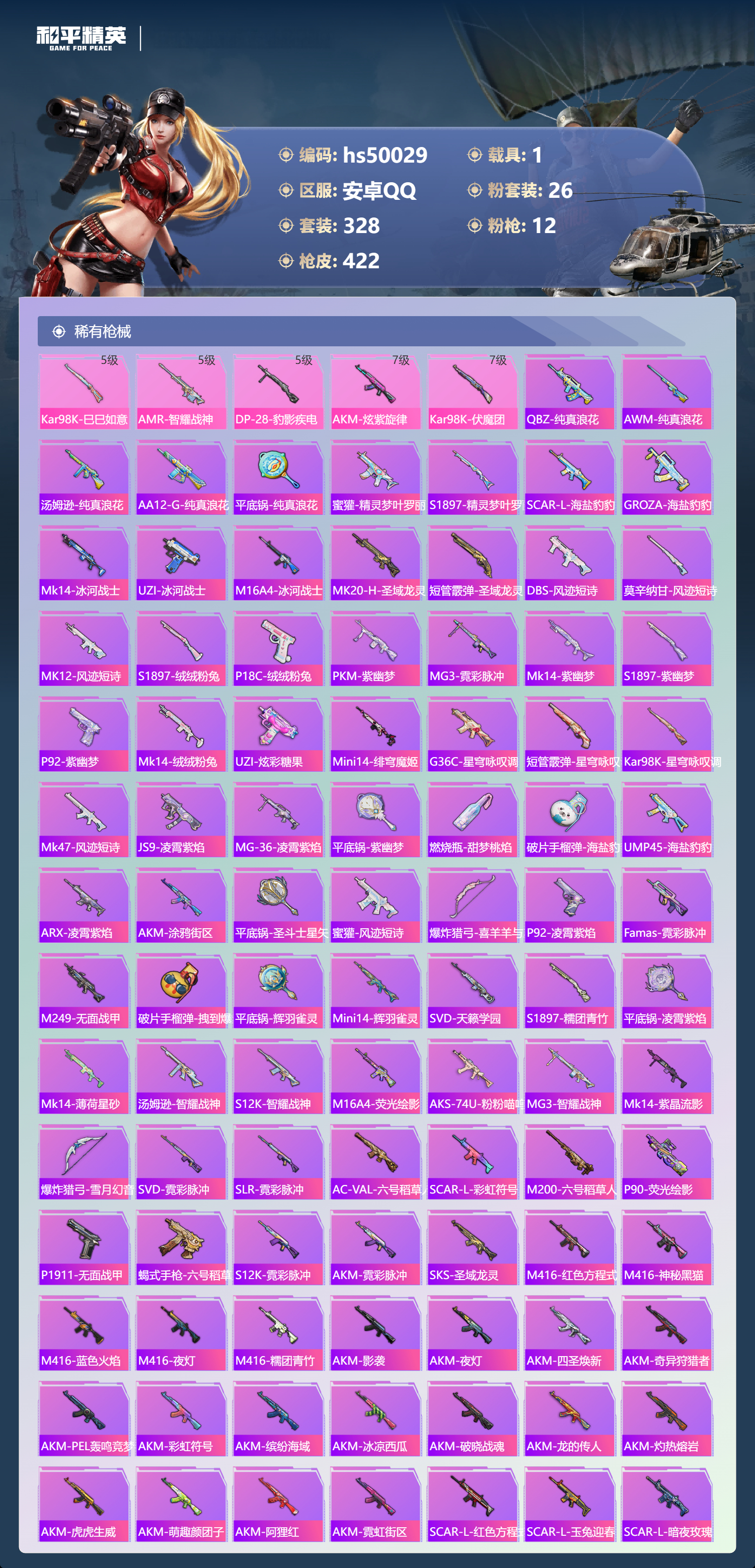 【66832】【不可二次】【安卓QQ】龟仙人 恐龙拽拽 大橘为重 漫步者 都市猎人 M249-古堡领主 金属狂野 M762-奇异狩猎者 星空之魅 银刃赛罗 M416-心之恋语 缤纷油彩 浪漫波比 智能音符 Kar98K-伏魔团 纯白誓言 AKM-奇异狩猎者 特斯拉3白色 M762-瑞龙福将 潮萌小黄鸭 黑色刀锋 海洋之心 极致幻想 天启纪元 狂沙舞者 金羽特工 AKM-炫紫旋律 白月香洋装 神秘