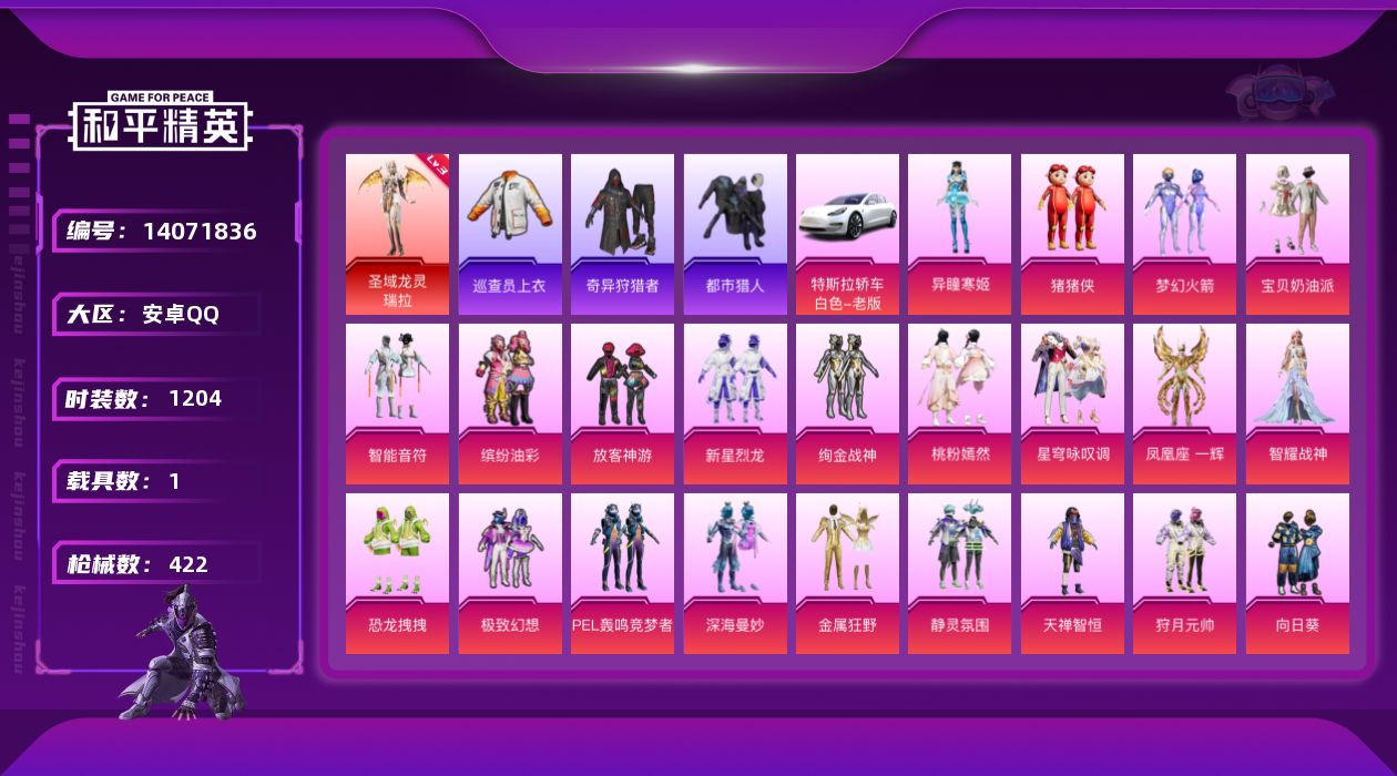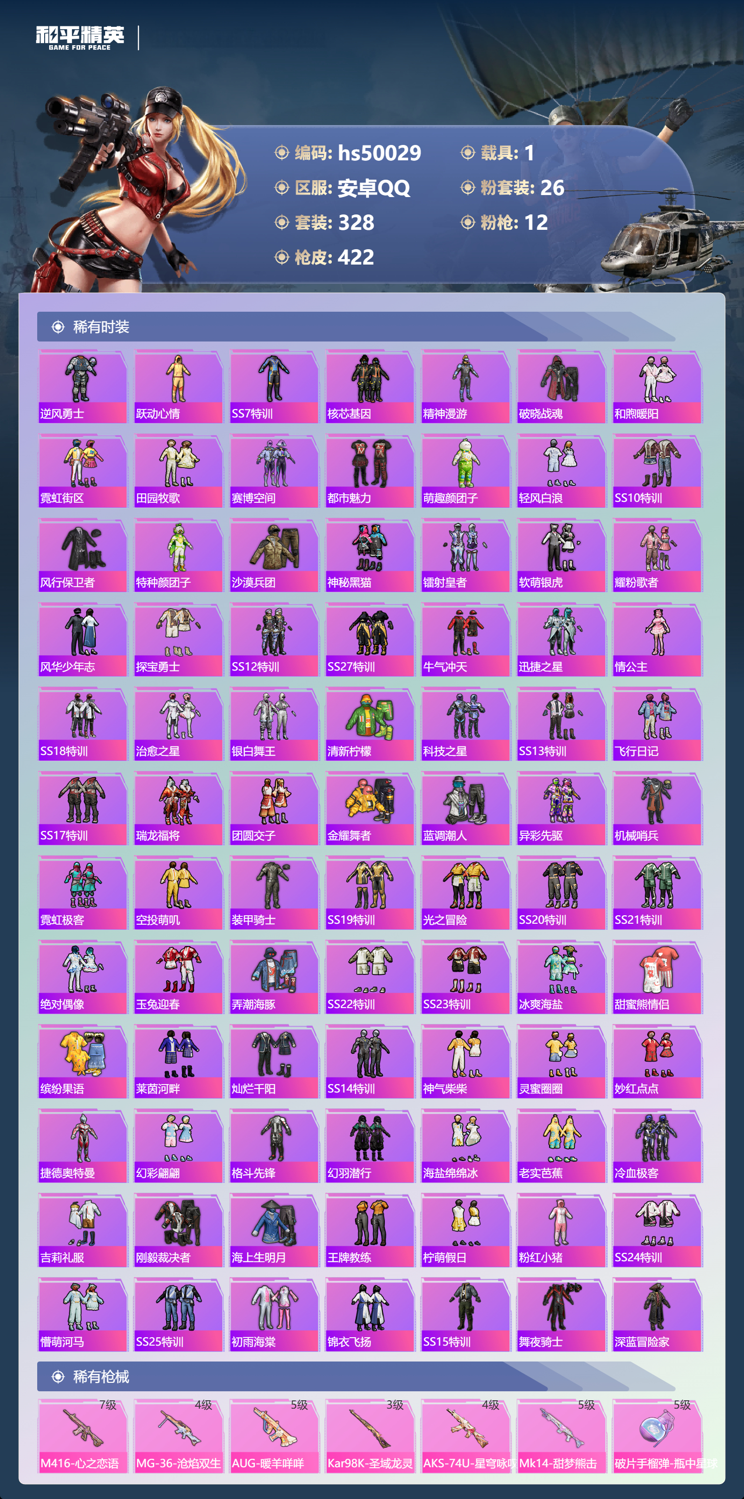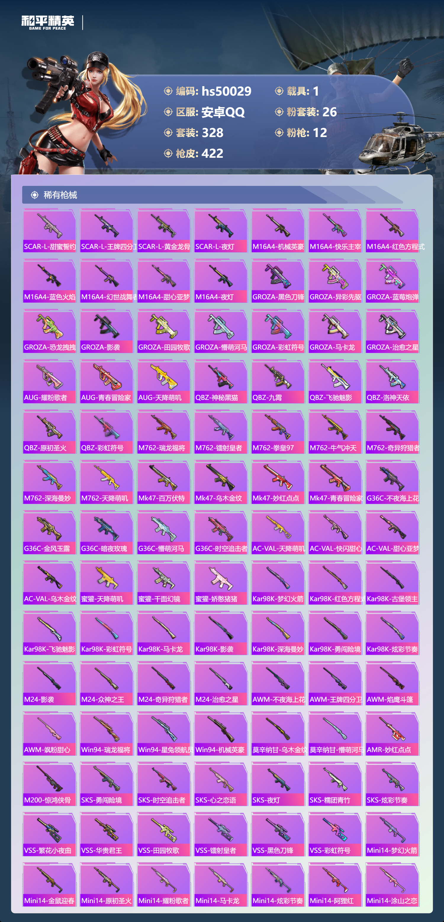 【66832】【不可二次】【安卓QQ】龟仙人 恐龙拽拽 大橘为重 漫步者 都市猎人 M249-古堡领主 金属狂野 M762-奇异狩猎者 星空之魅 银刃赛罗 M416-心之恋语 缤纷油彩 浪漫波比 智能音符 Kar98K-伏魔团 纯白誓言 AKM-奇异狩猎者 特斯拉3白色 M762-瑞龙福将 潮萌小黄鸭 黑色刀锋 海洋之心 极致幻想 天启纪元 狂沙舞者 金羽特工 AKM-炫紫旋律 白月香洋装 神秘