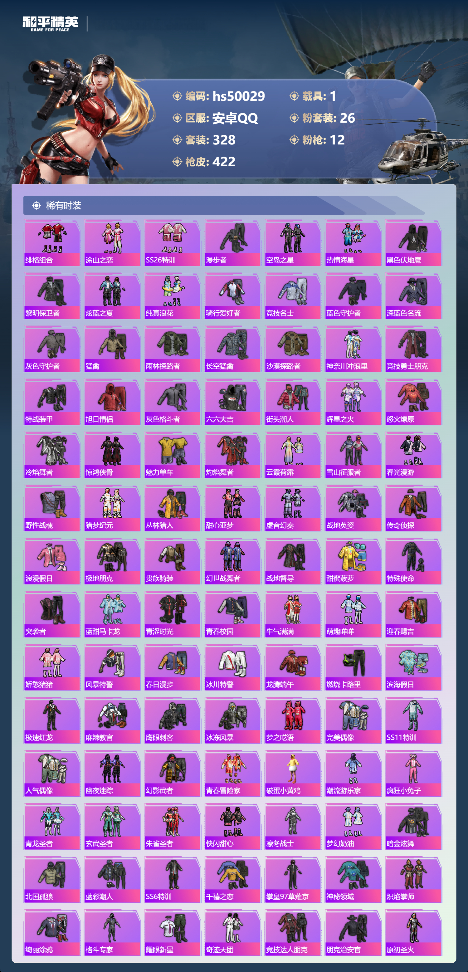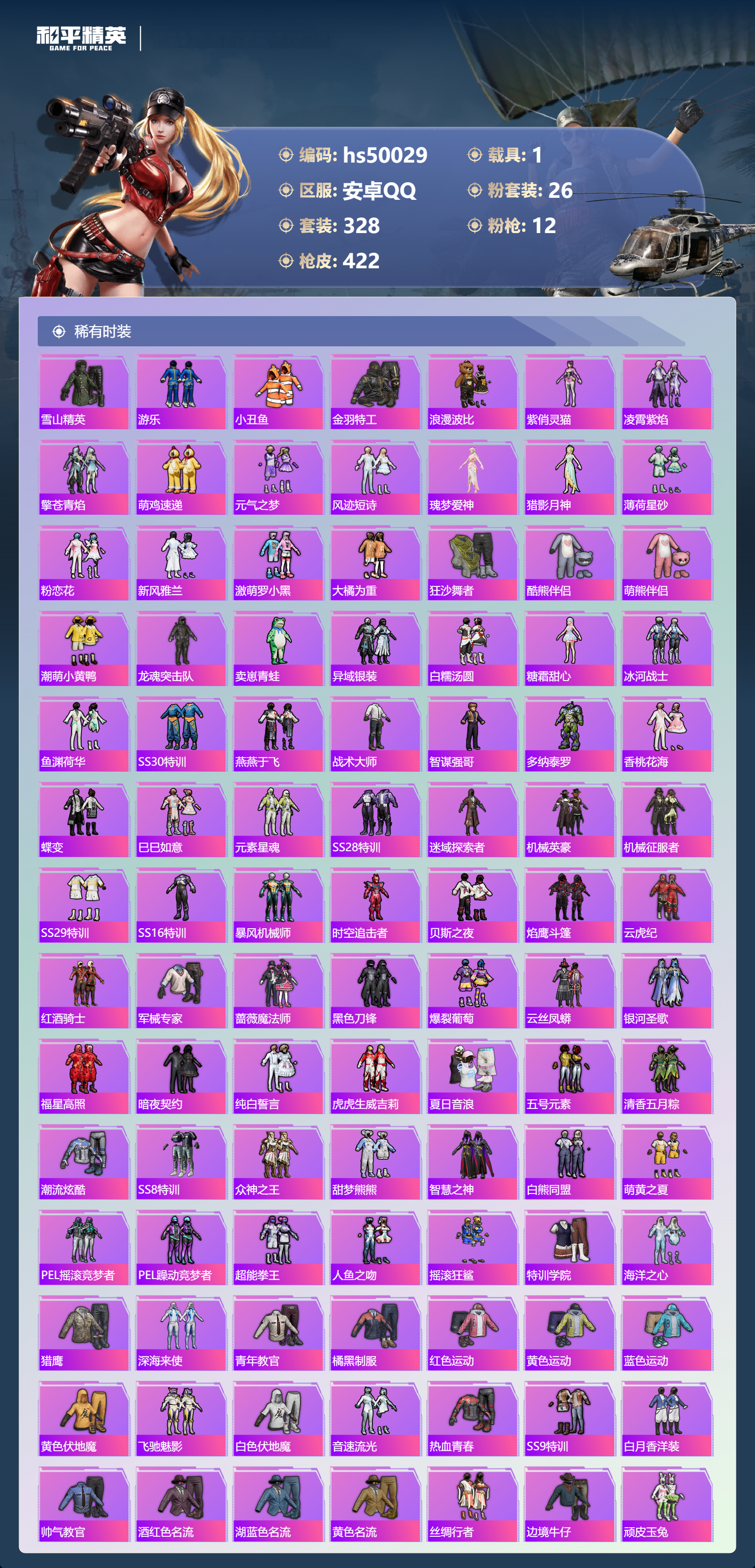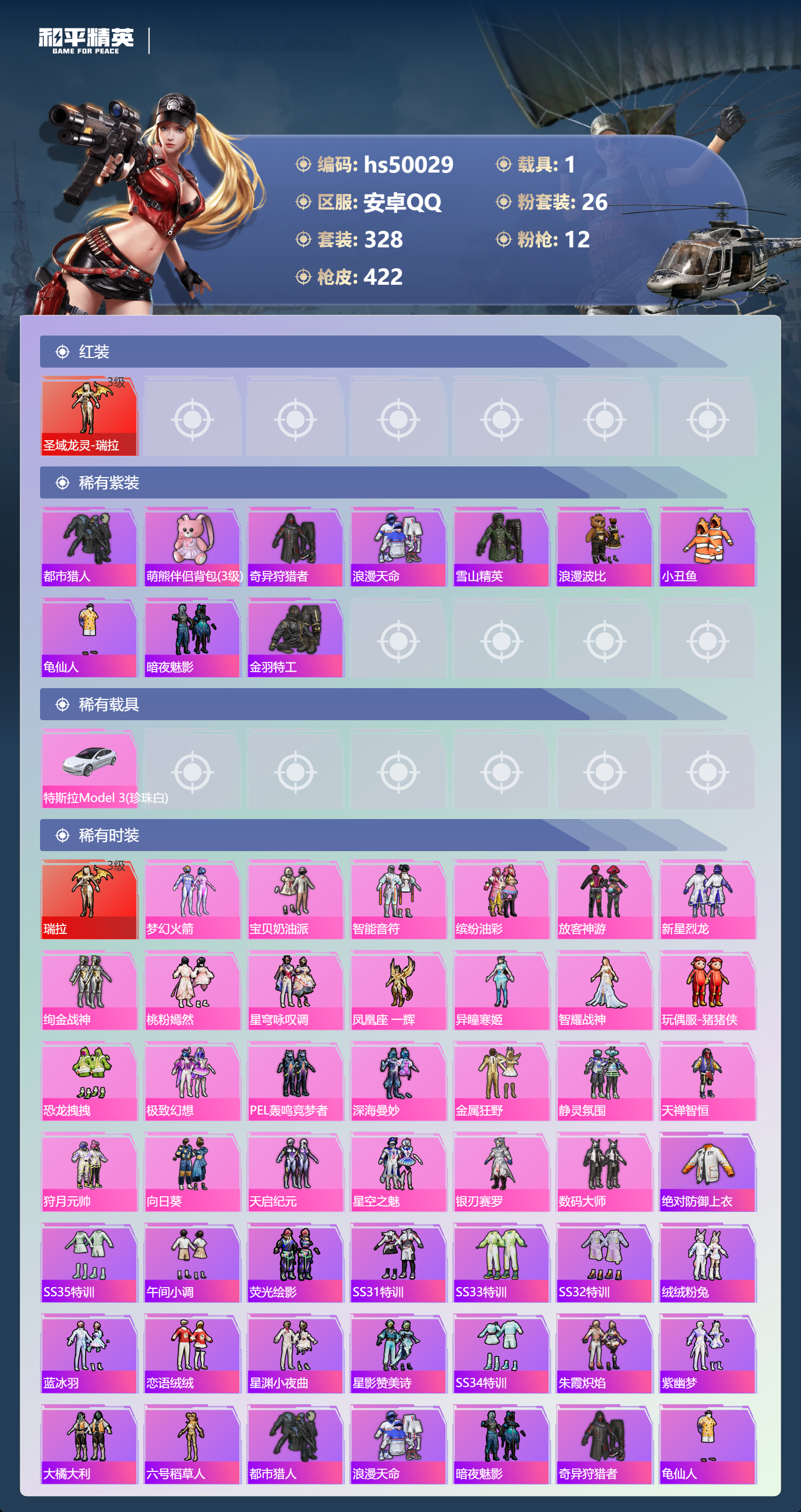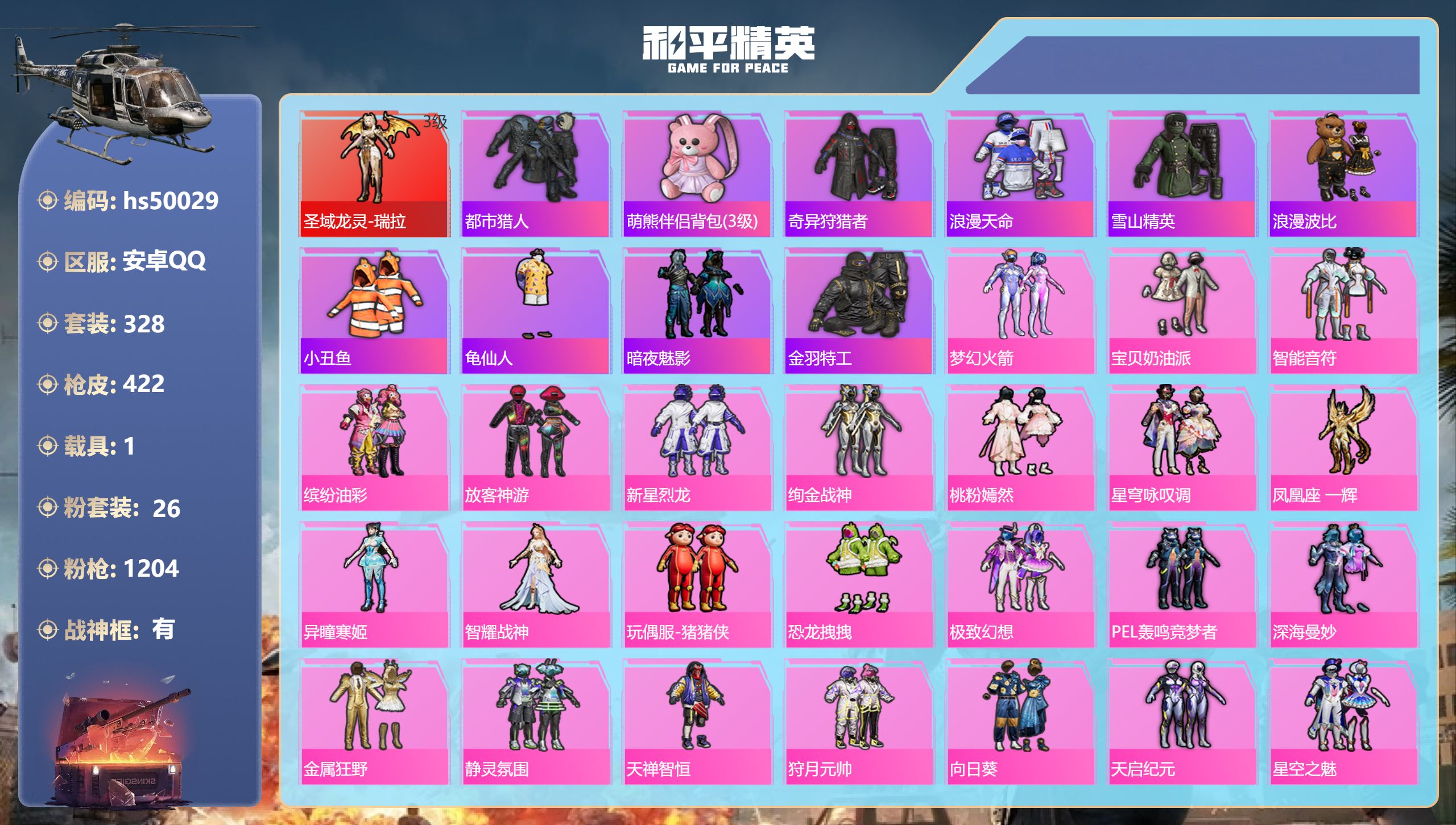 【66832】【不可二次】【安卓QQ】龟仙人 恐龙拽拽 大橘为重 漫步者 都市猎人 M249-古堡领主 金属狂野 M762-奇异狩猎者 星空之魅 银刃赛罗 M416-心之恋语 缤纷油彩 浪漫波比 智能音符 Kar98K-伏魔团 纯白誓言 AKM-奇异狩猎者 特斯拉3白色 M762-瑞龙福将 潮萌小黄鸭 黑色刀锋 海洋之心 极致幻想 天启纪元 狂沙舞者 金羽特工 AKM-炫紫旋律 白月香洋装 神秘