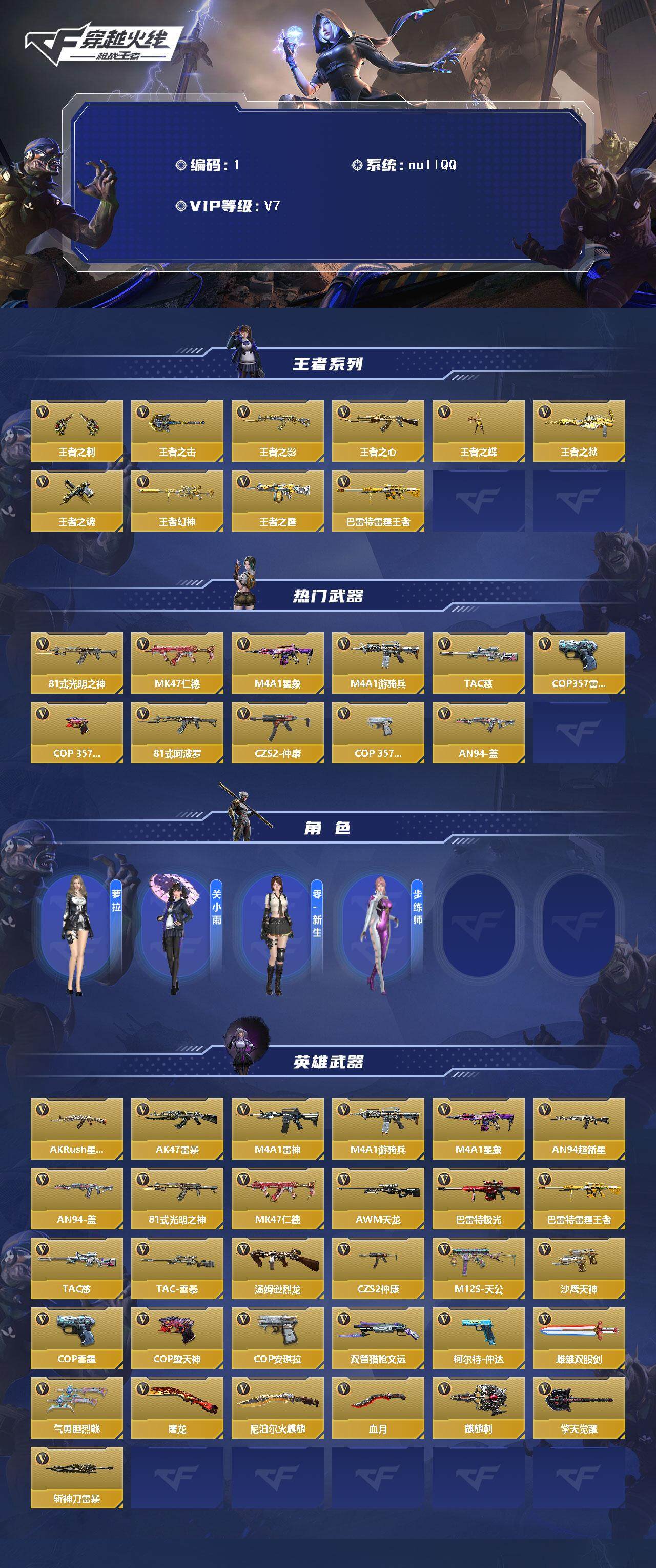 【店主推荐捡漏号!可直接换绑】19英雄角色数-268英雄武器数- 【王者系列】:王者之刺,王者之击,王者之影,王者之心,王者之蝶,王者之狱,王者之魂,王者幻神,王者之霆,巴雷特-雷霆王者 【热门武器】:81式-光明之神2,MK47-仁德,M4A1-星象,M4A1-游骑兵,TAC-慈,COP 357-雷霆,COP 357-堕天神,81式...