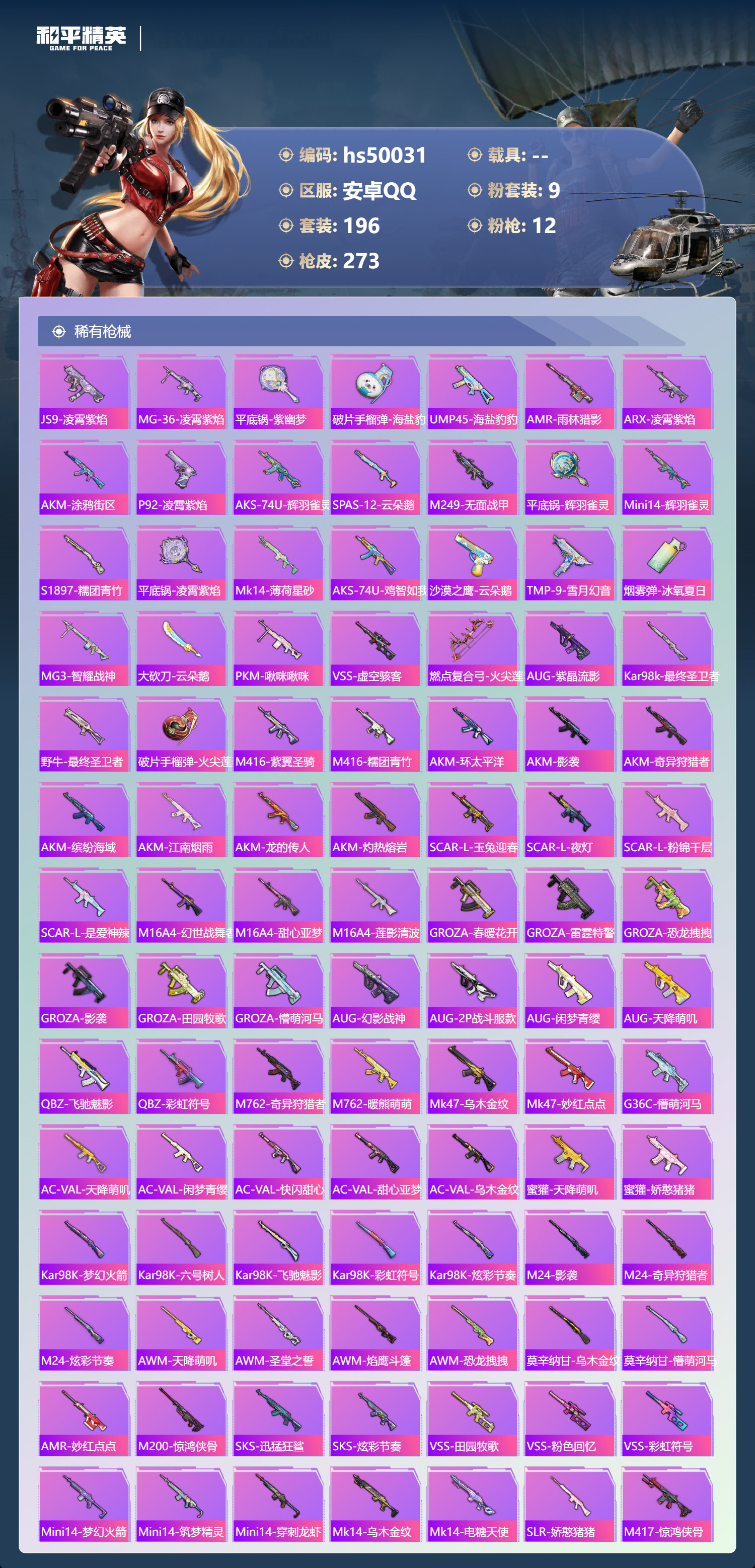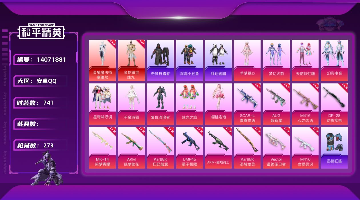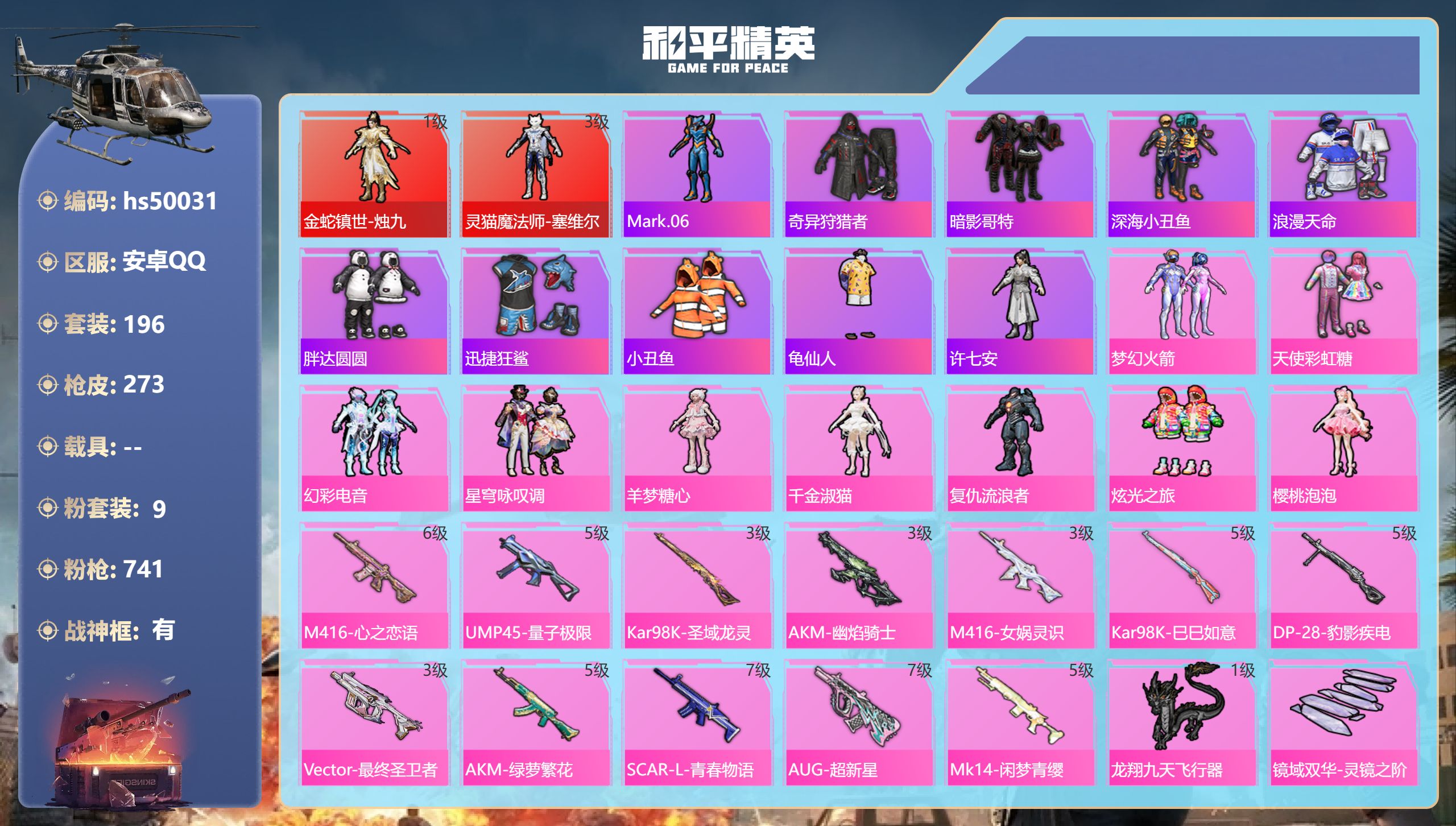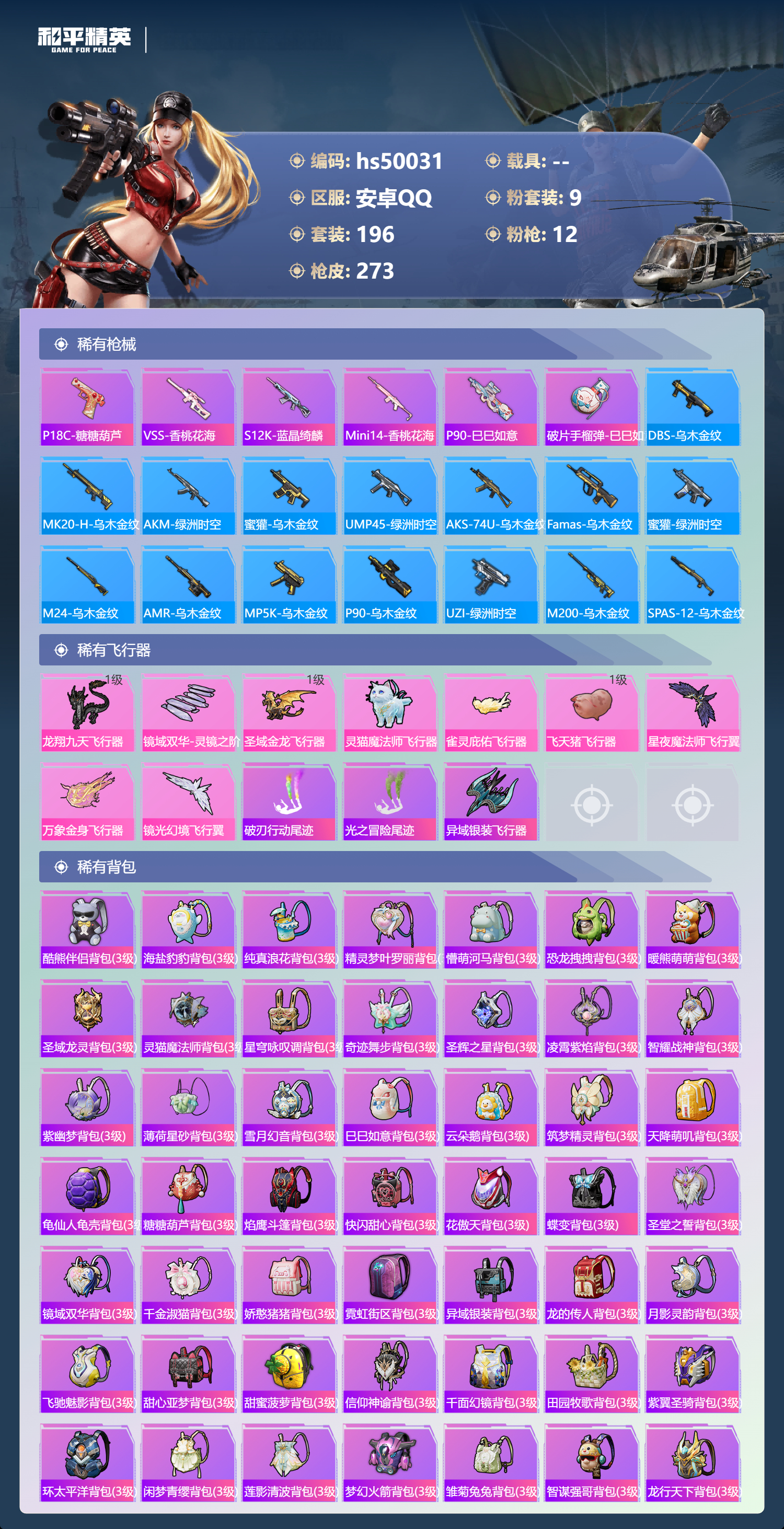 【66842】【不可二次】【安卓QQ】龟仙人 AKM-绿萝繁花 S686-奇异狩猎者 漫步者 M24-奇异狩猎者 金蛇镇世-烛九 豚鼠丹丹 MK14-闲梦青缨 M762-奇异狩猎者 UMP45-量子极限 M416-心之恋语 深海小丑鱼 灵猫魔法师-塞维尔 浪漫天命 镜光幻境飞行翼 激萌罗小黑 胖达圆圆 AKM-奇异狩猎者 迅捷狂鲨 奇异狩猎者 萌神柯基 AUG-超新星 狂沙舞者 龙翔九天飞行器