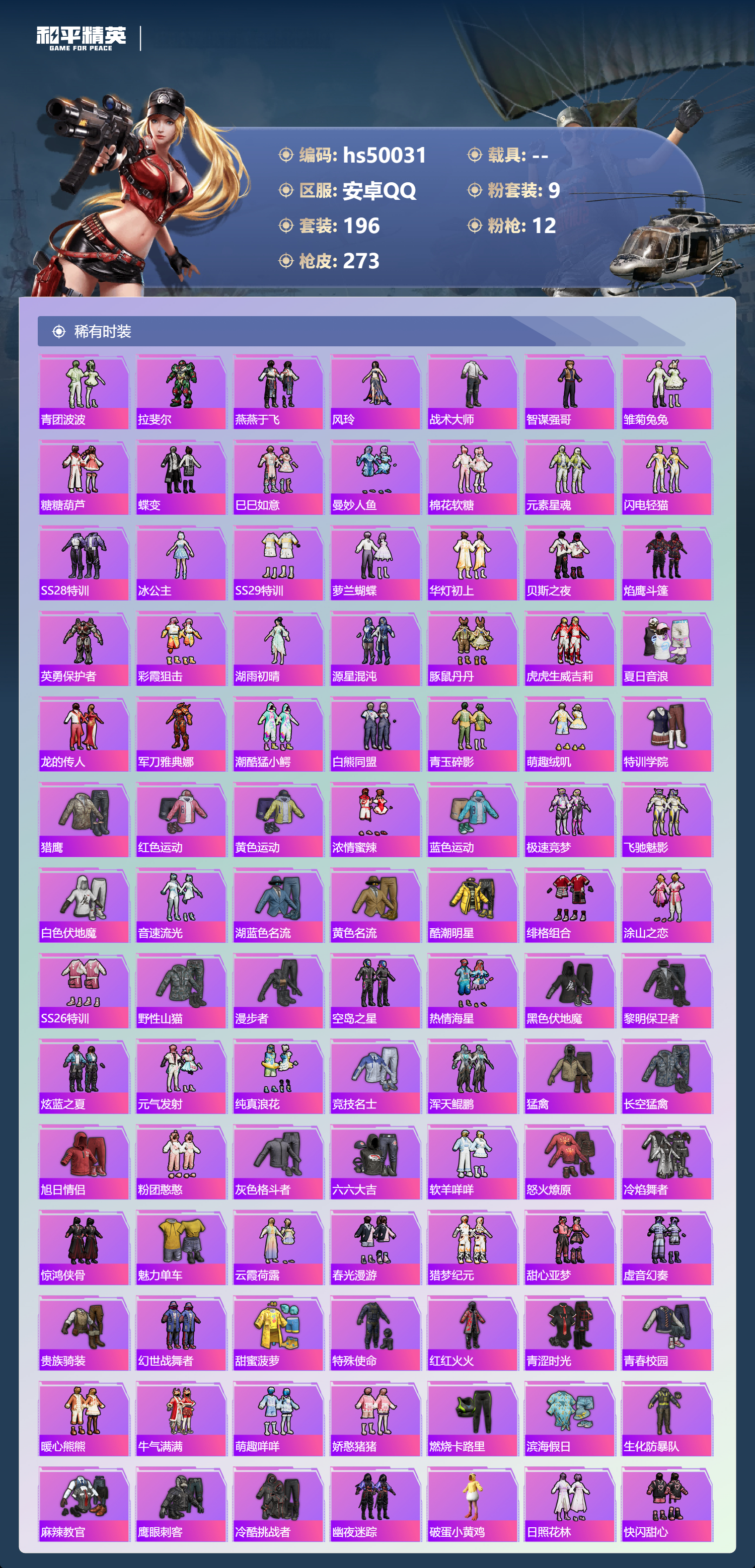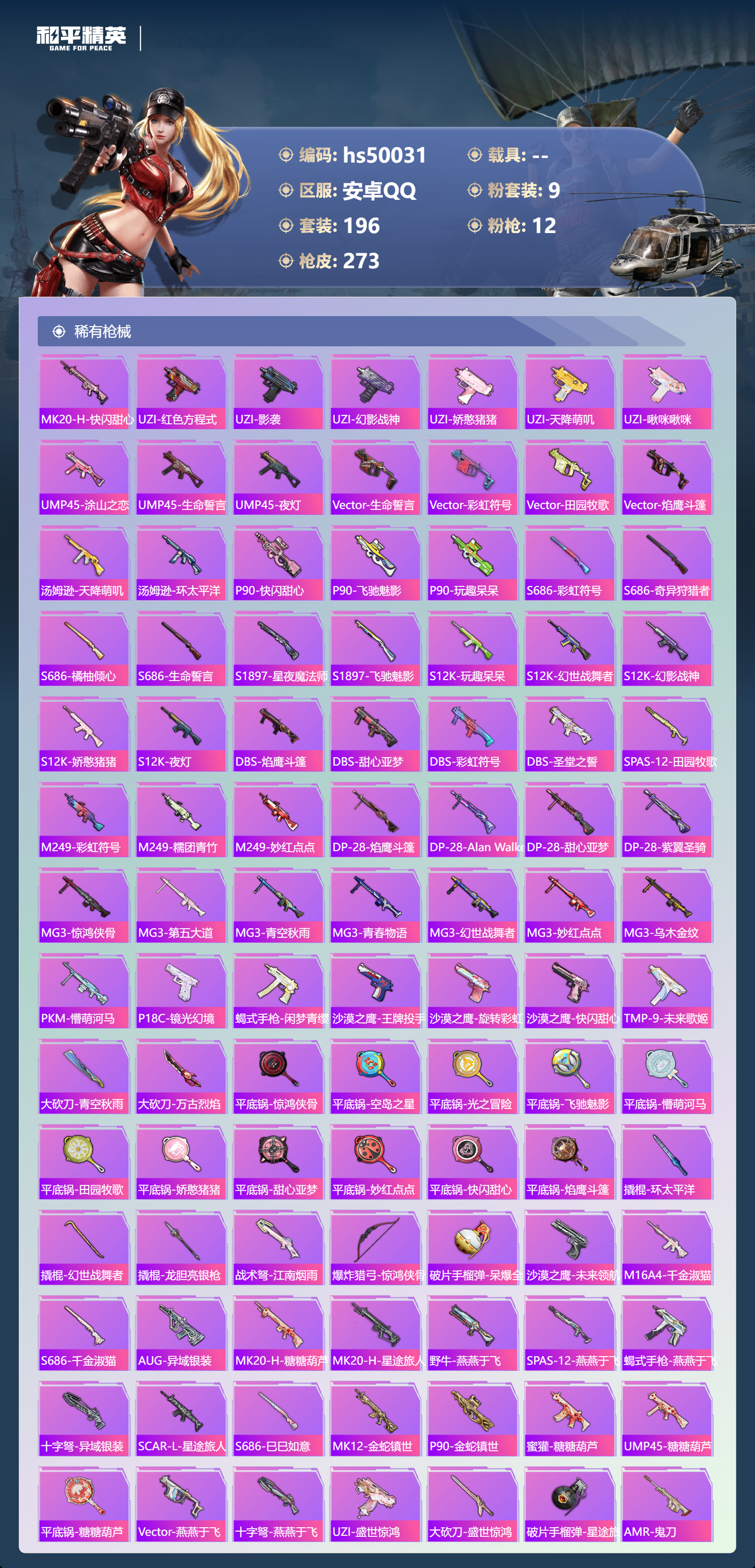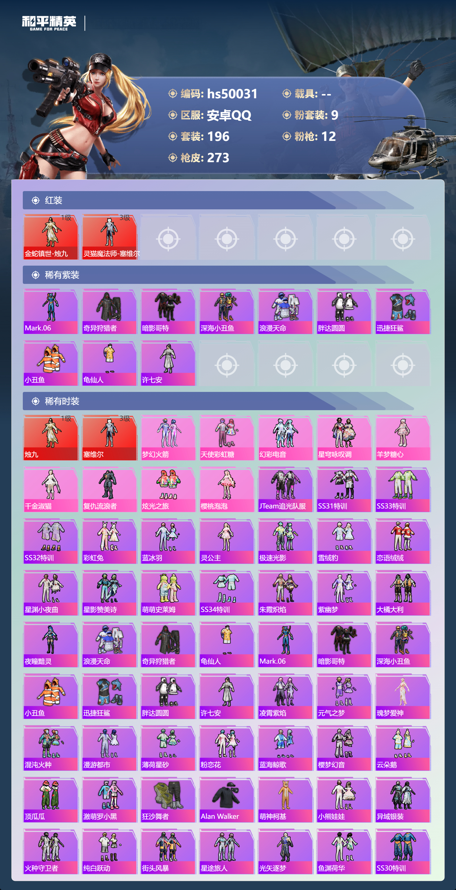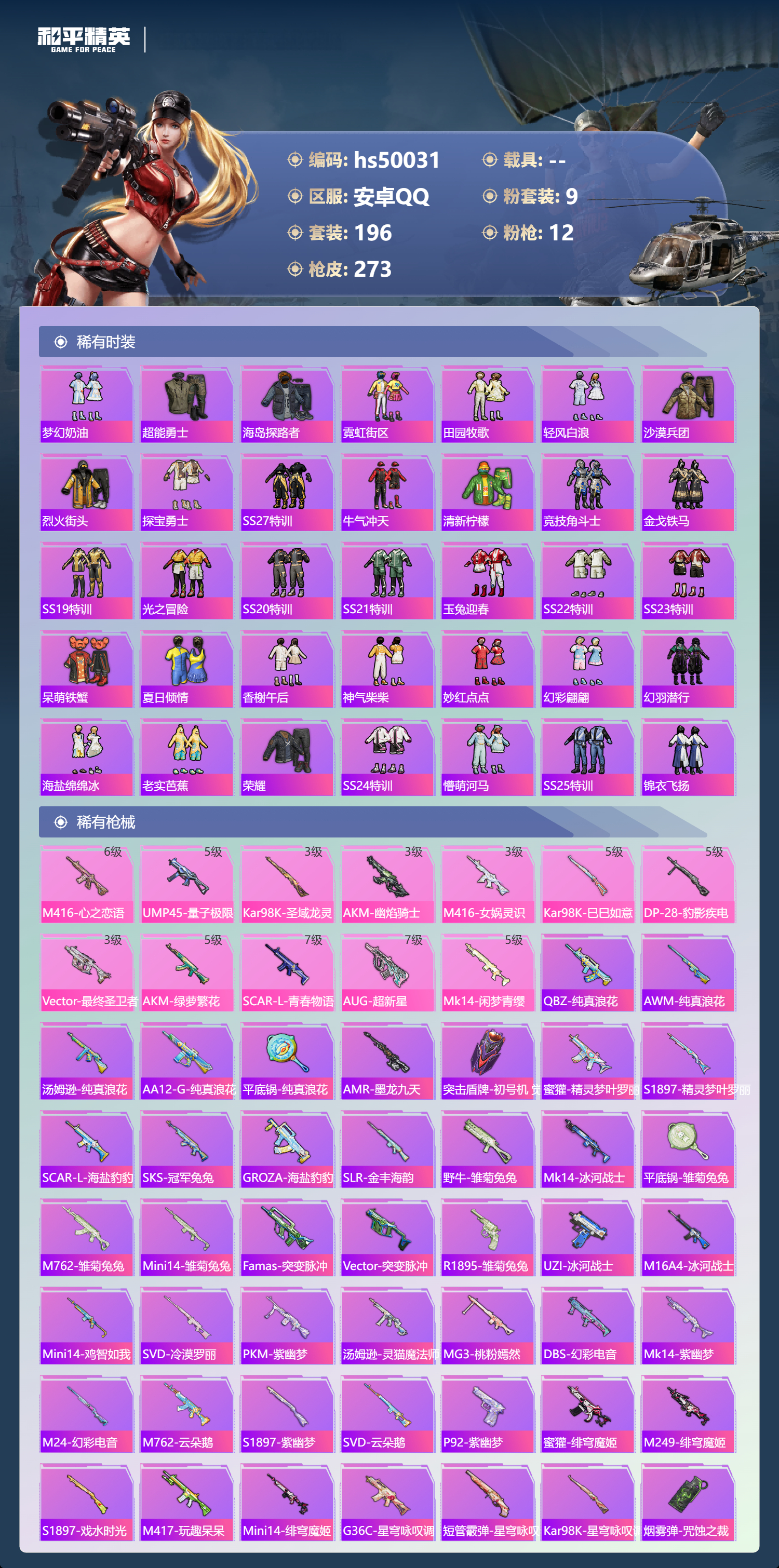 【66842】【不可二次】【安卓QQ】龟仙人 AKM-绿萝繁花 S686-奇异狩猎者 漫步者 M24-奇异狩猎者 金蛇镇世-烛九 豚鼠丹丹 MK14-闲梦青缨 M762-奇异狩猎者 UMP45-量子极限 M416-心之恋语 深海小丑鱼 灵猫魔法师-塞维尔 浪漫天命 镜光幻境飞行翼 激萌罗小黑 胖达圆圆 AKM-奇异狩猎者 迅捷狂鲨 奇异狩猎者 萌神柯基 AUG-超新星 狂沙舞者 龙翔九天飞行器