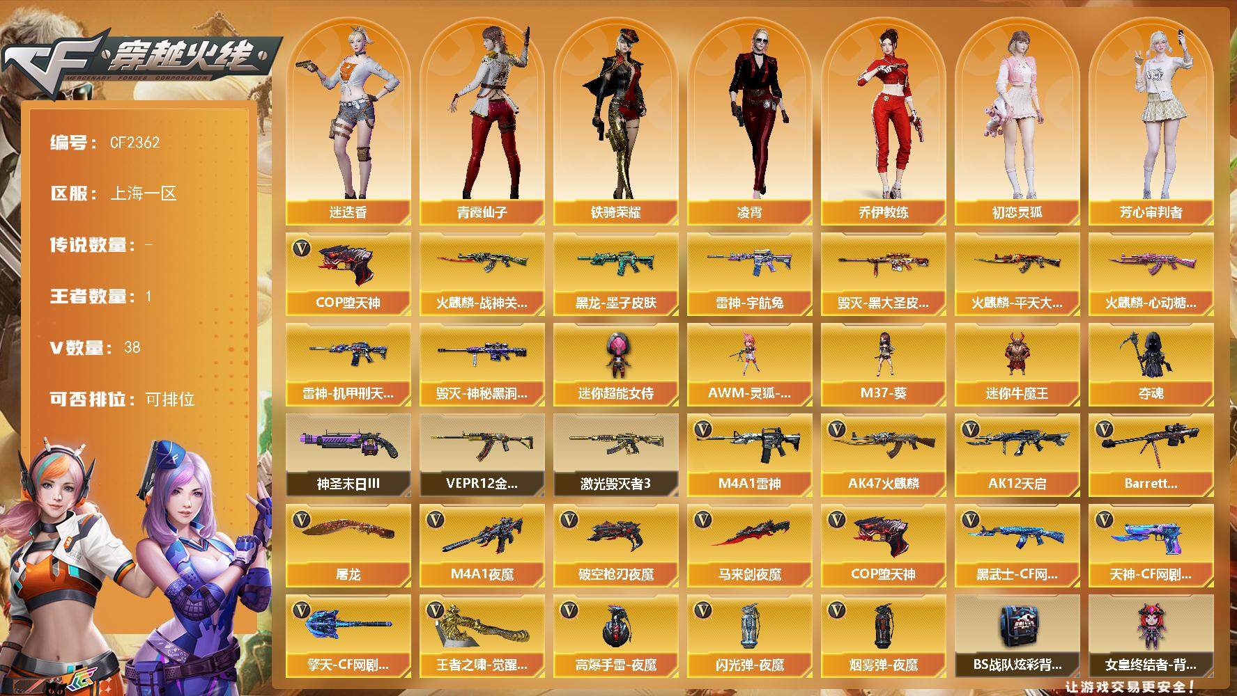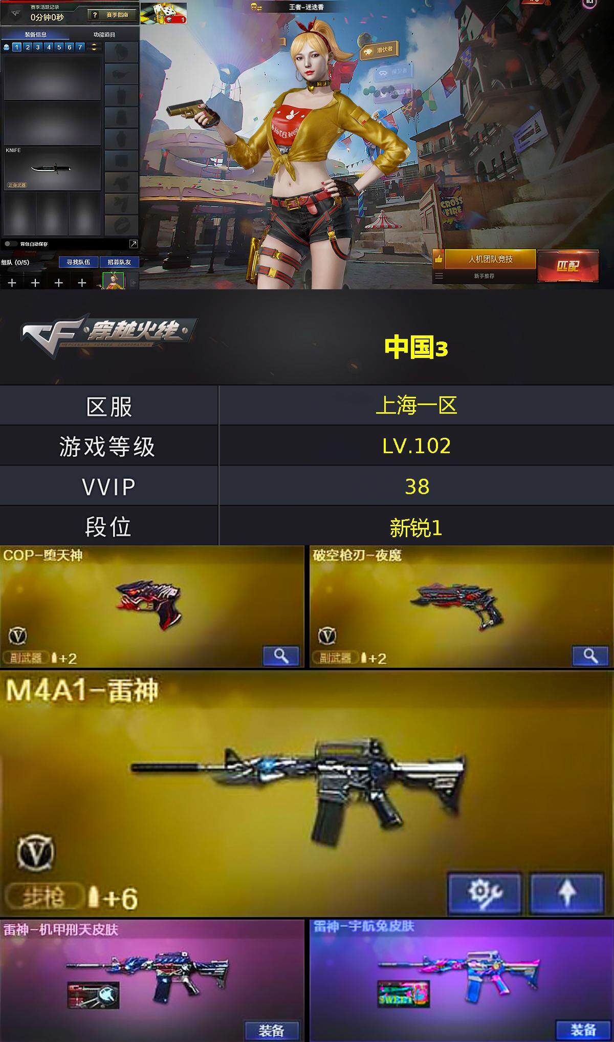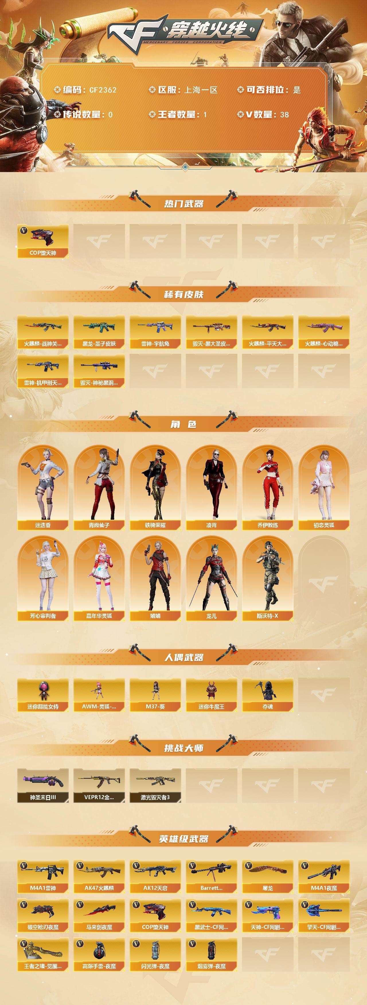 【66871】【66871】【CF2362】上海一区-38V-1王者-0炫金【双全号 COP-堕天神】【热门武器】:COP-堕天神【皮肤】:雷神-机甲刑天皮肤