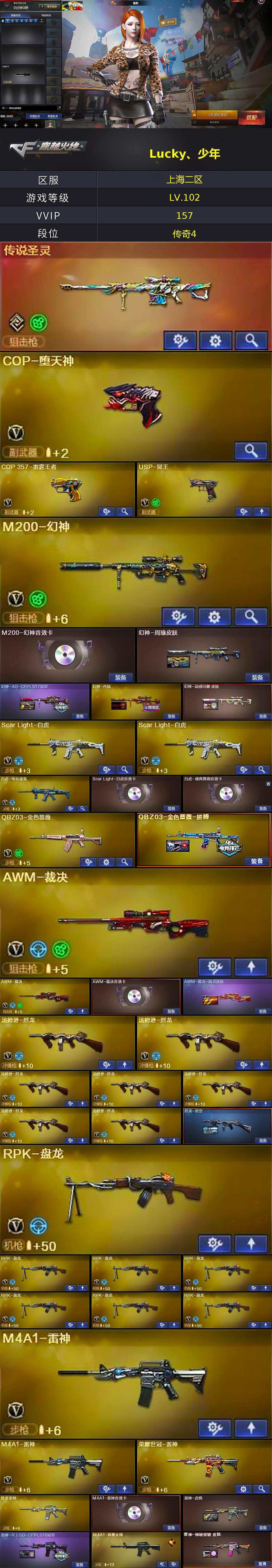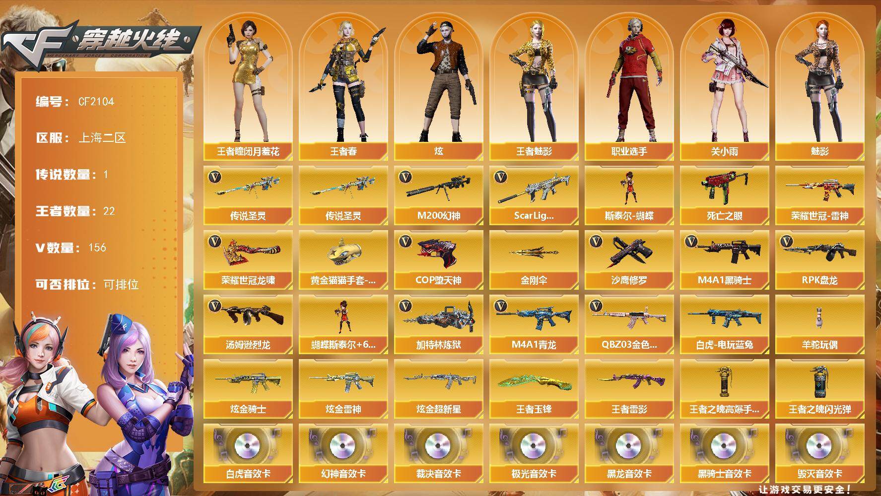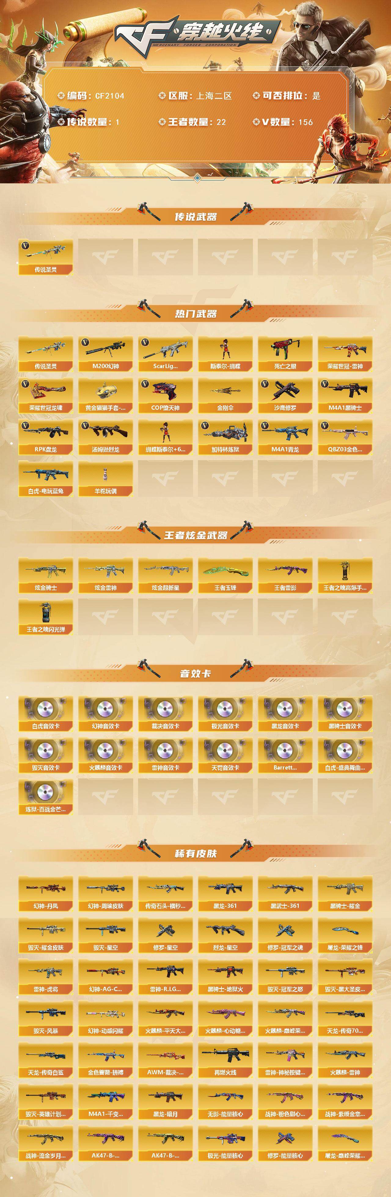 【66993】【66993】【CF2104】上海二区-156V-22王者-3炫金【双全号 传说圣灵,QBZ03-金色蔷薇,Scar Light-白虎*2,M4