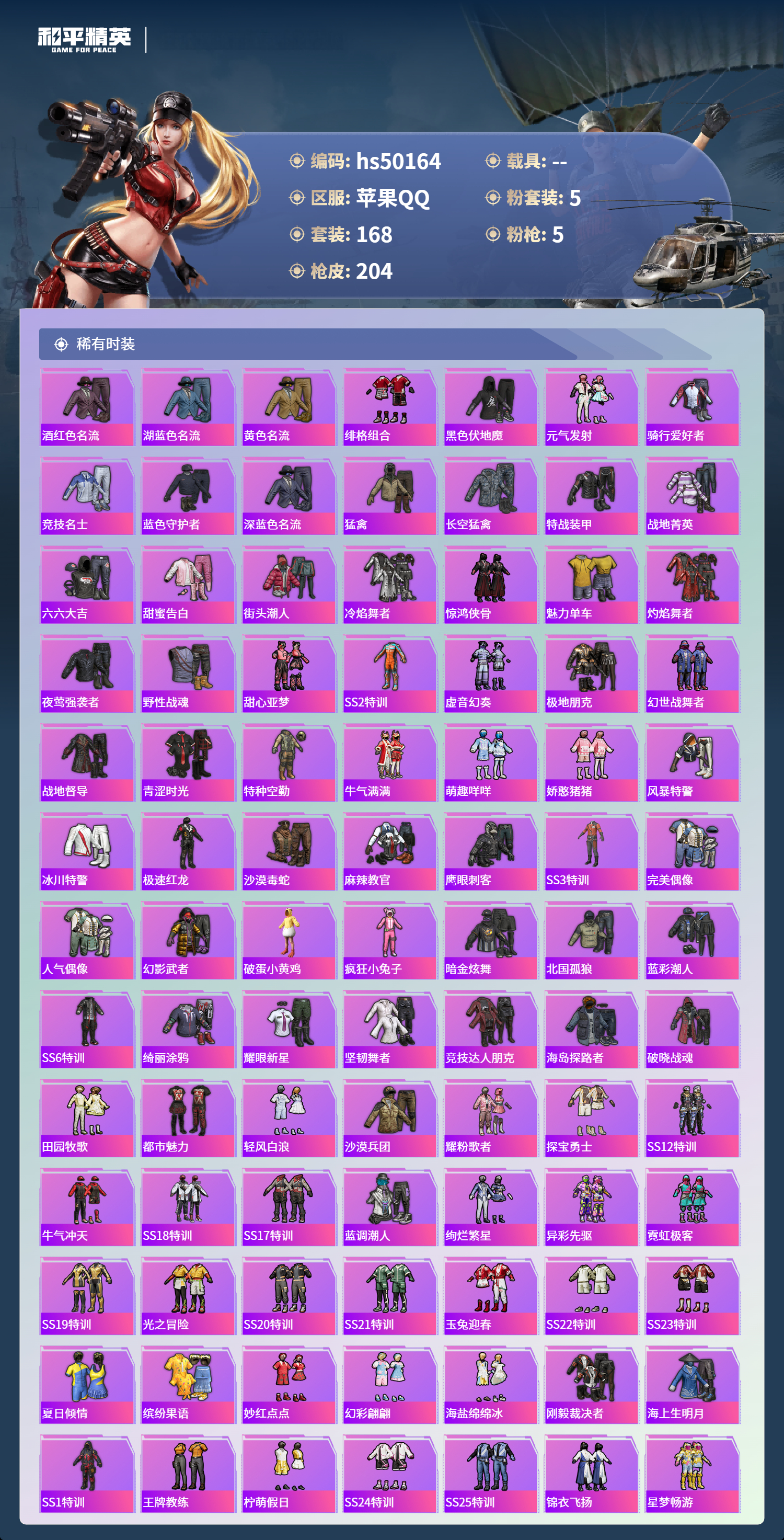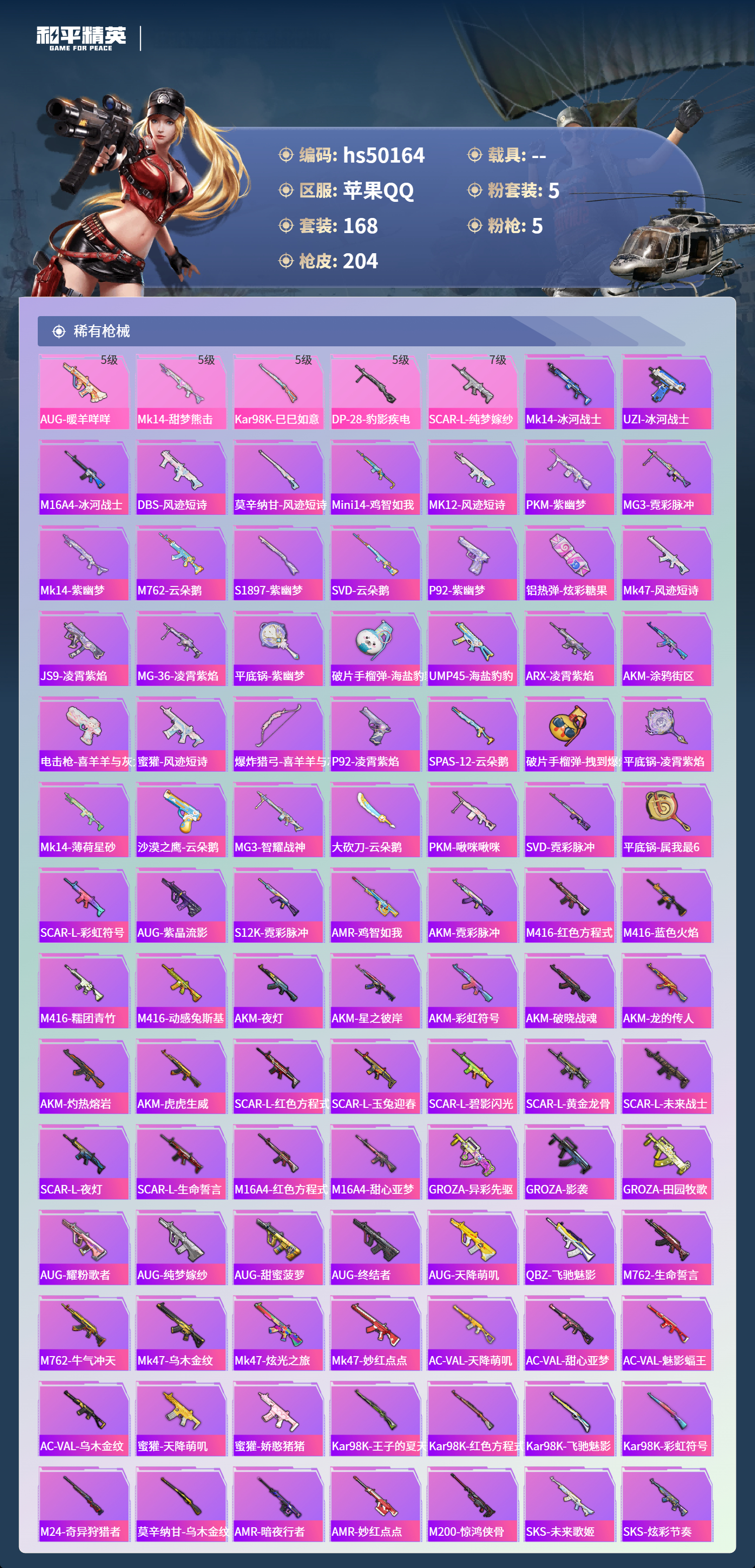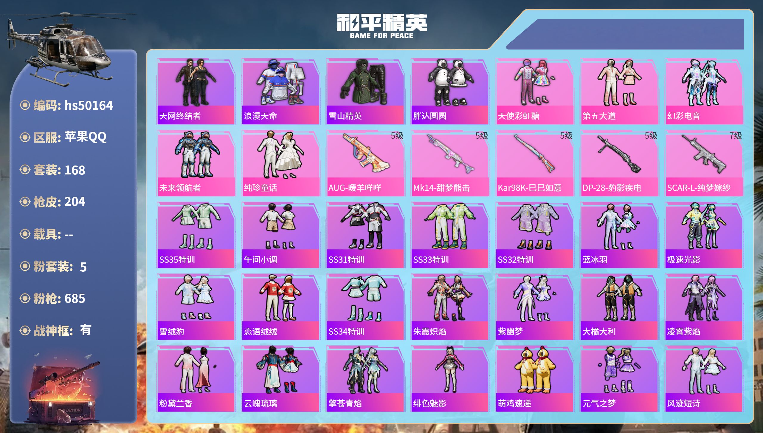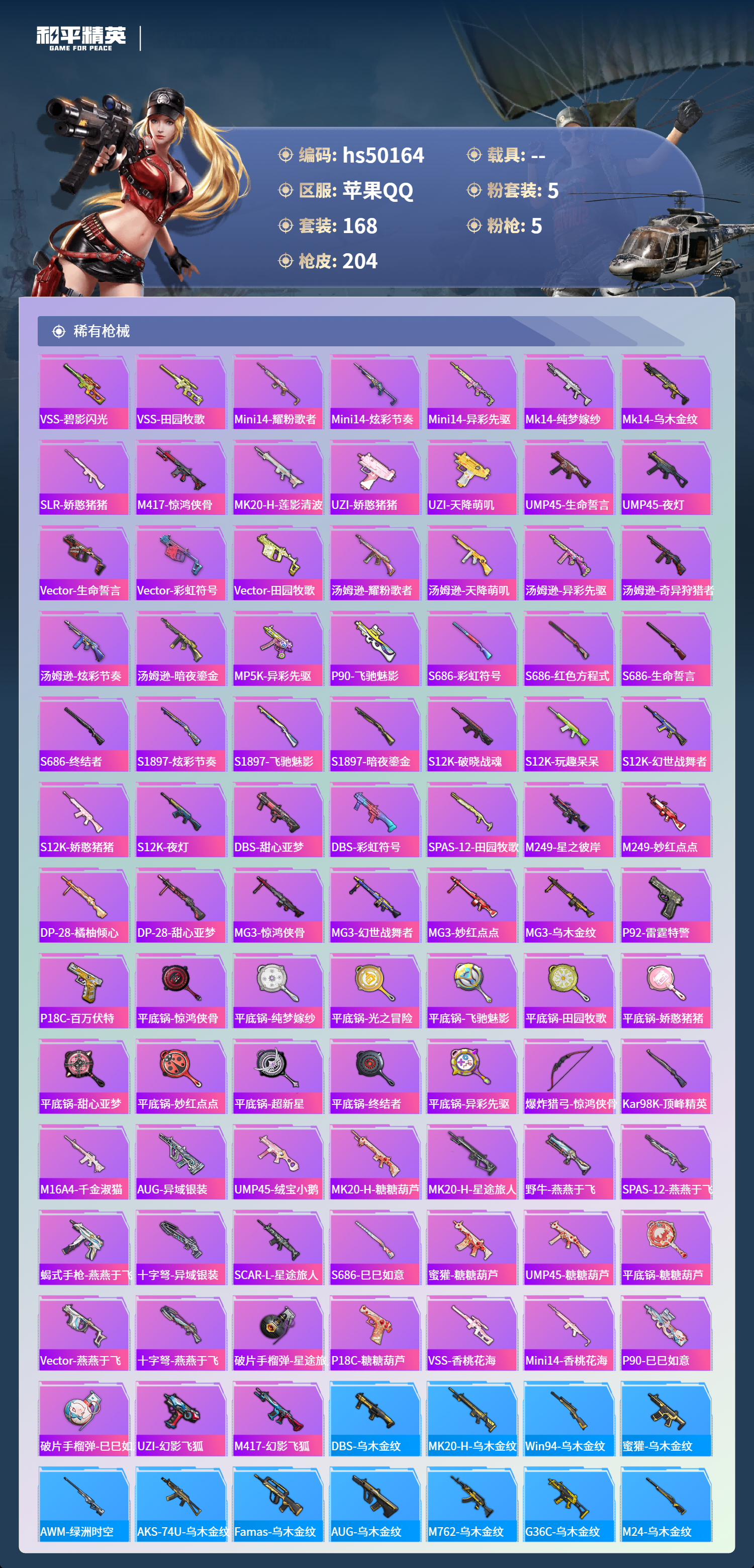 【67046】【不可二次】【苹果QQ】SS1特训 天使彩虹糖 M24-奇异狩猎者 SCAR-L-纯梦嫁纱 极速红龙 浪漫天命 雪山精英 胖达圆圆
