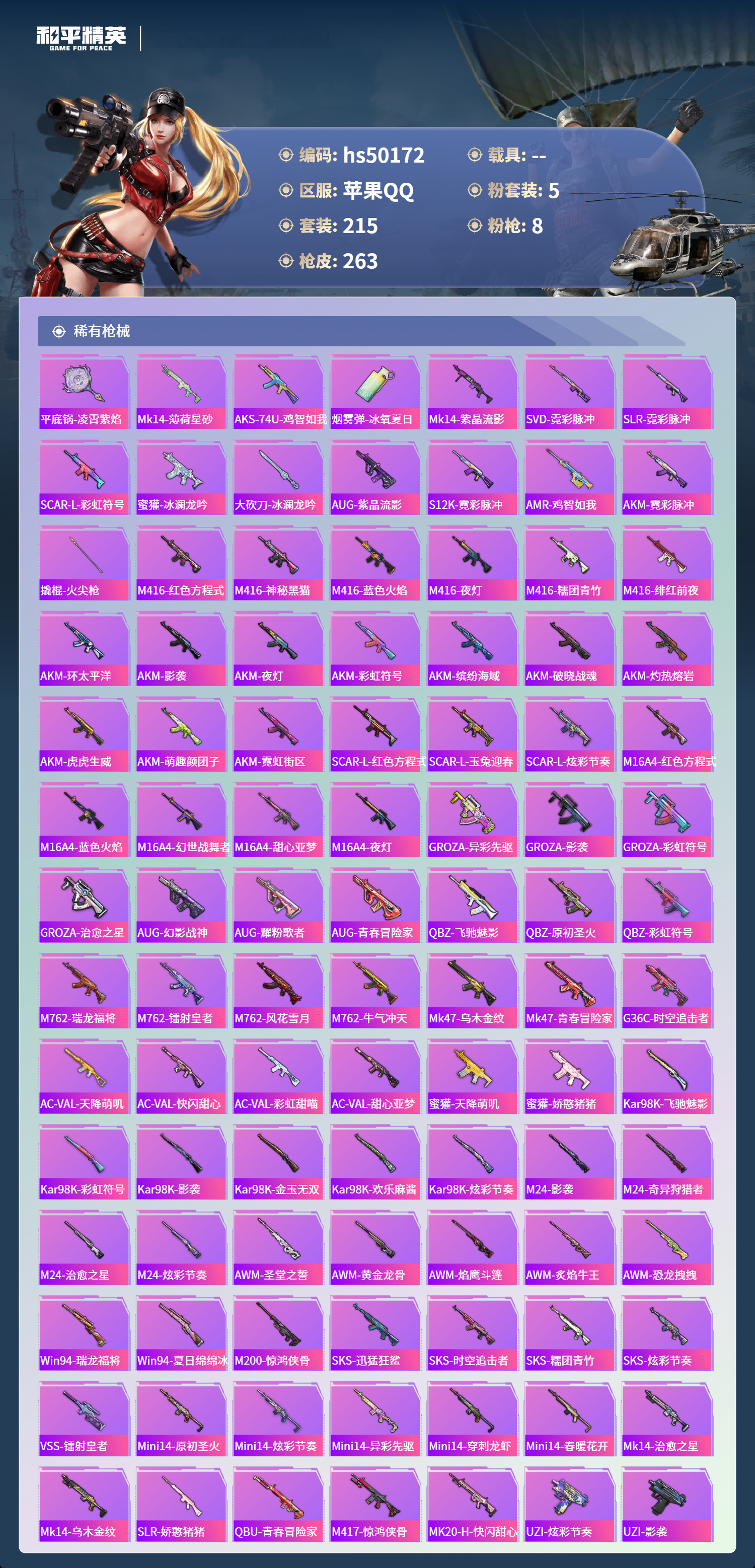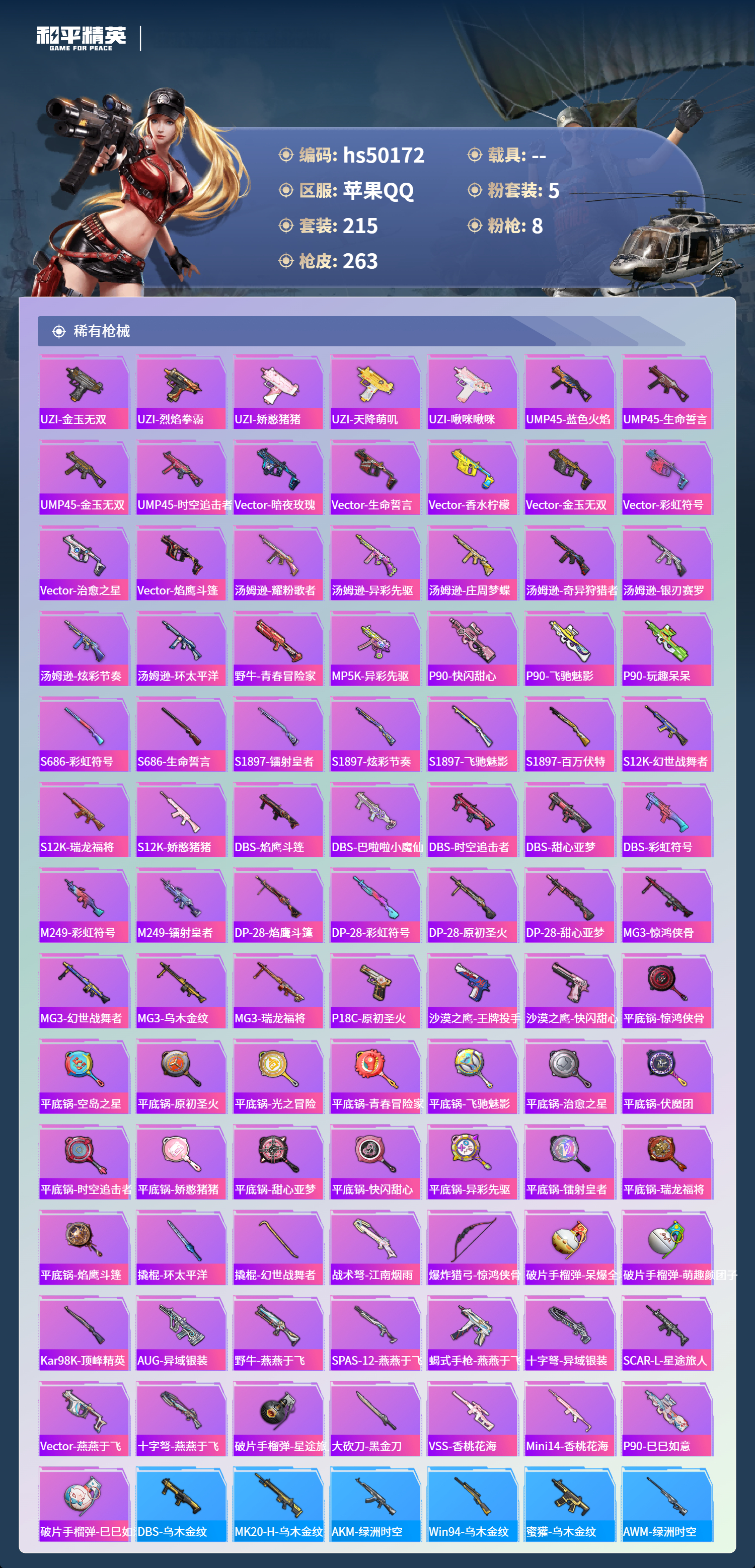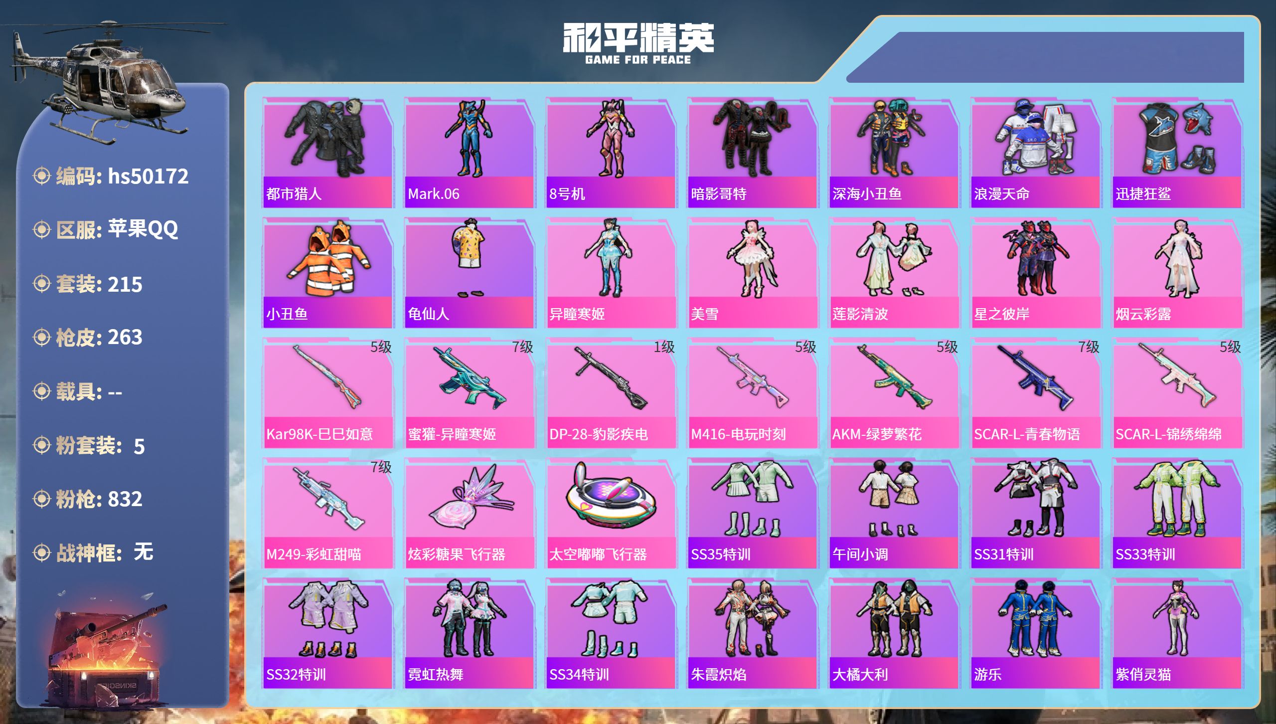 【67067】【可二次】【苹果QQ】龟仙人 AKM-绿萝繁花 漫步者 都市猎人 M24-奇异狩猎者 极速红龙 M416-电玩时刻 太空嘟嘟飞行器 M249-彩虹甜喵 星之彼岸 深海小丑鱼 瑞龙福将 浪漫天命 AWM-黄金龙骨 激萌罗小黑 团圆交子 迅捷狂鲨 暗夜契约 M762-瑞龙福将 狂沙舞者 M762-风花雪月 SCAR-L-锦绣绵绵 AKM-缤纷海域 粉红小猪 神秘黑猫 SCAR-L-青春
