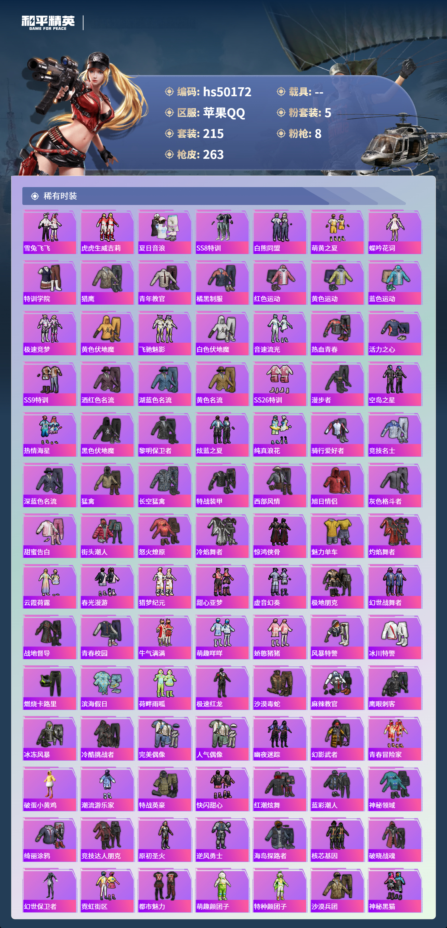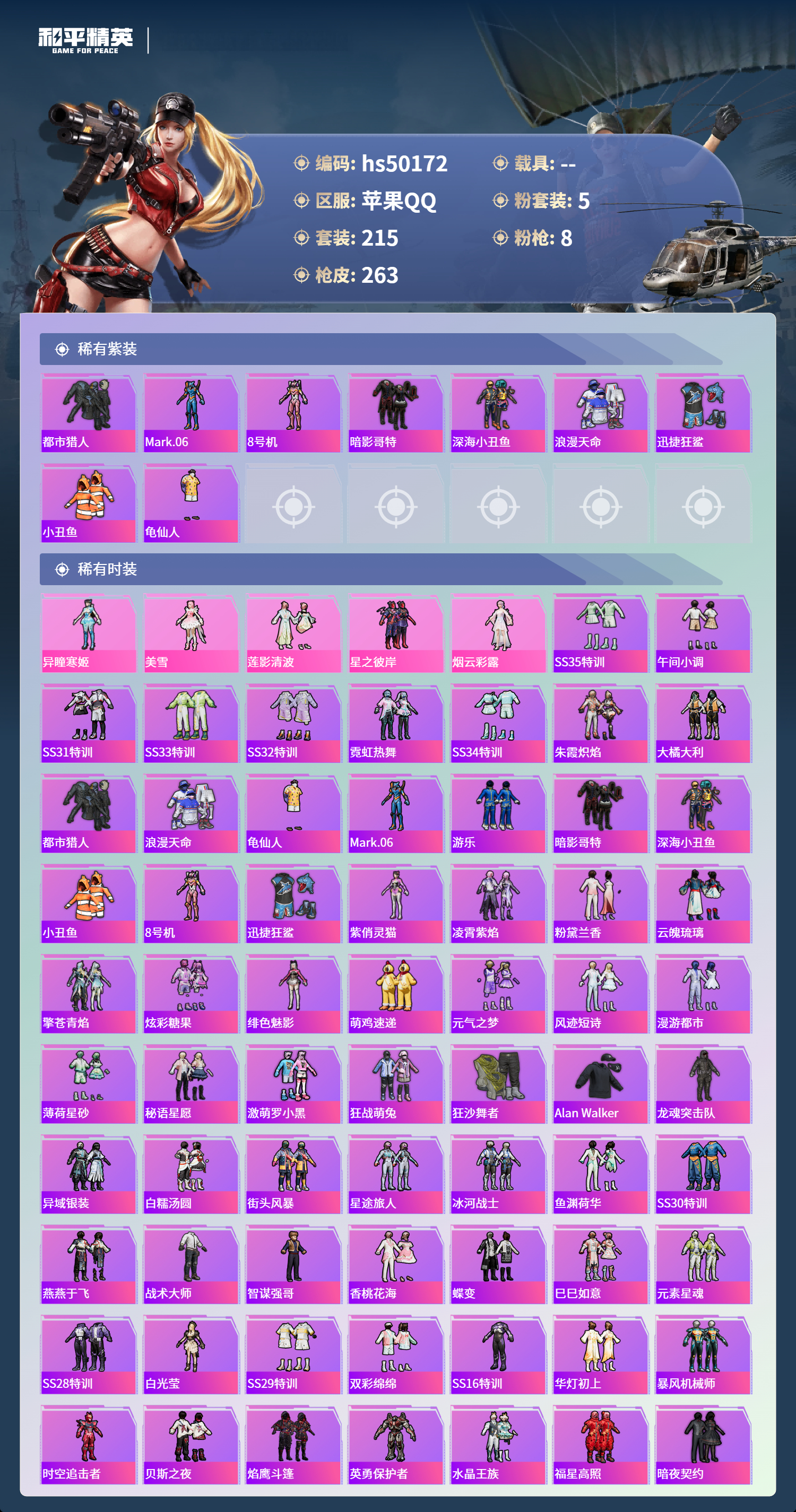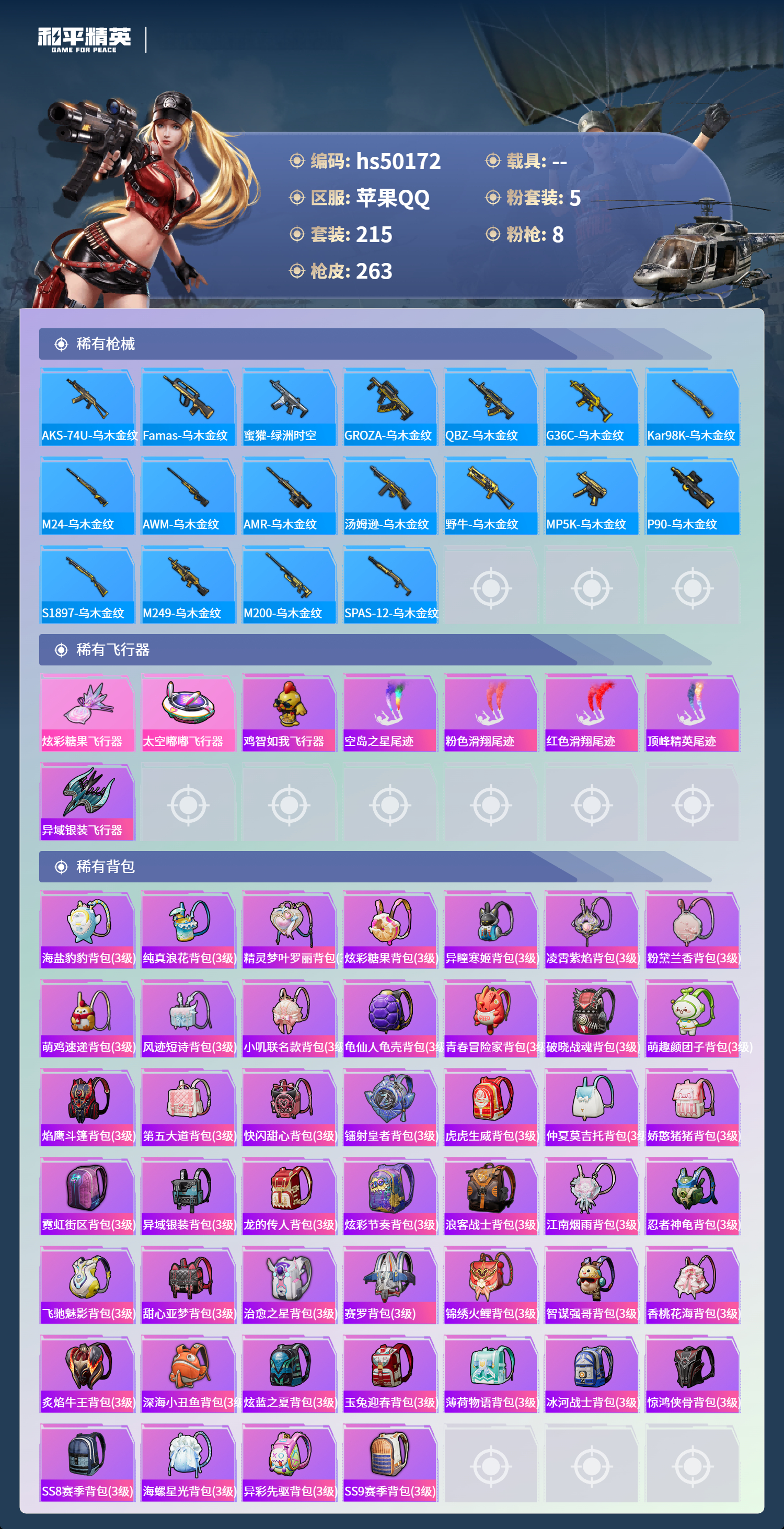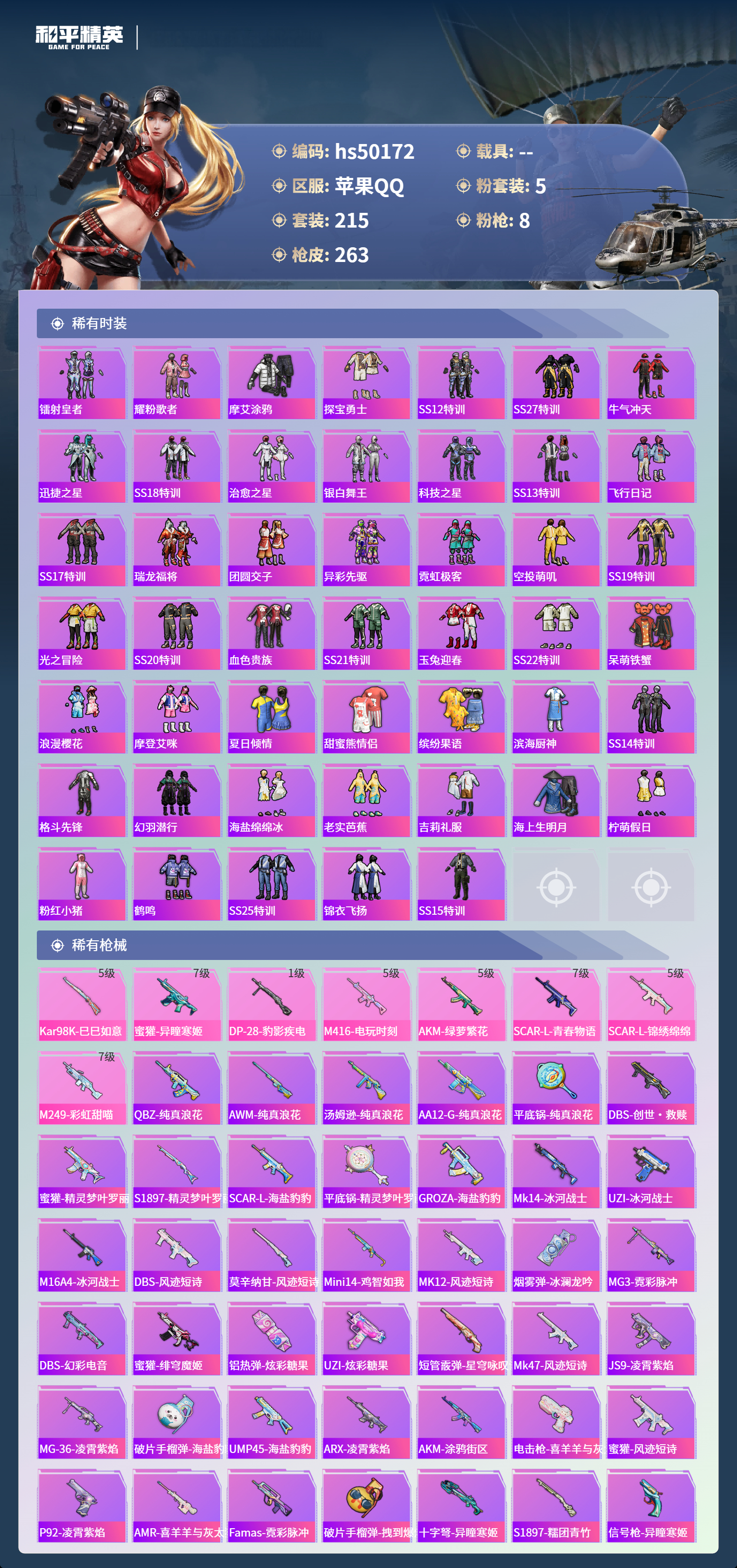 【67067】【可二次】【苹果QQ】龟仙人 AKM-绿萝繁花 漫步者 都市猎人 M24-奇异狩猎者 极速红龙 M416-电玩时刻 太空嘟嘟飞行器 M249-彩虹甜喵 星之彼岸 深海小丑鱼 瑞龙福将 浪漫天命 AWM-黄金龙骨 激萌罗小黑 团圆交子 迅捷狂鲨 暗夜契约 M762-瑞龙福将 狂沙舞者 M762-风花雪月 SCAR-L-锦绣绵绵 AKM-缤纷海域 粉红小猪 神秘黑猫 SCAR-L-青春